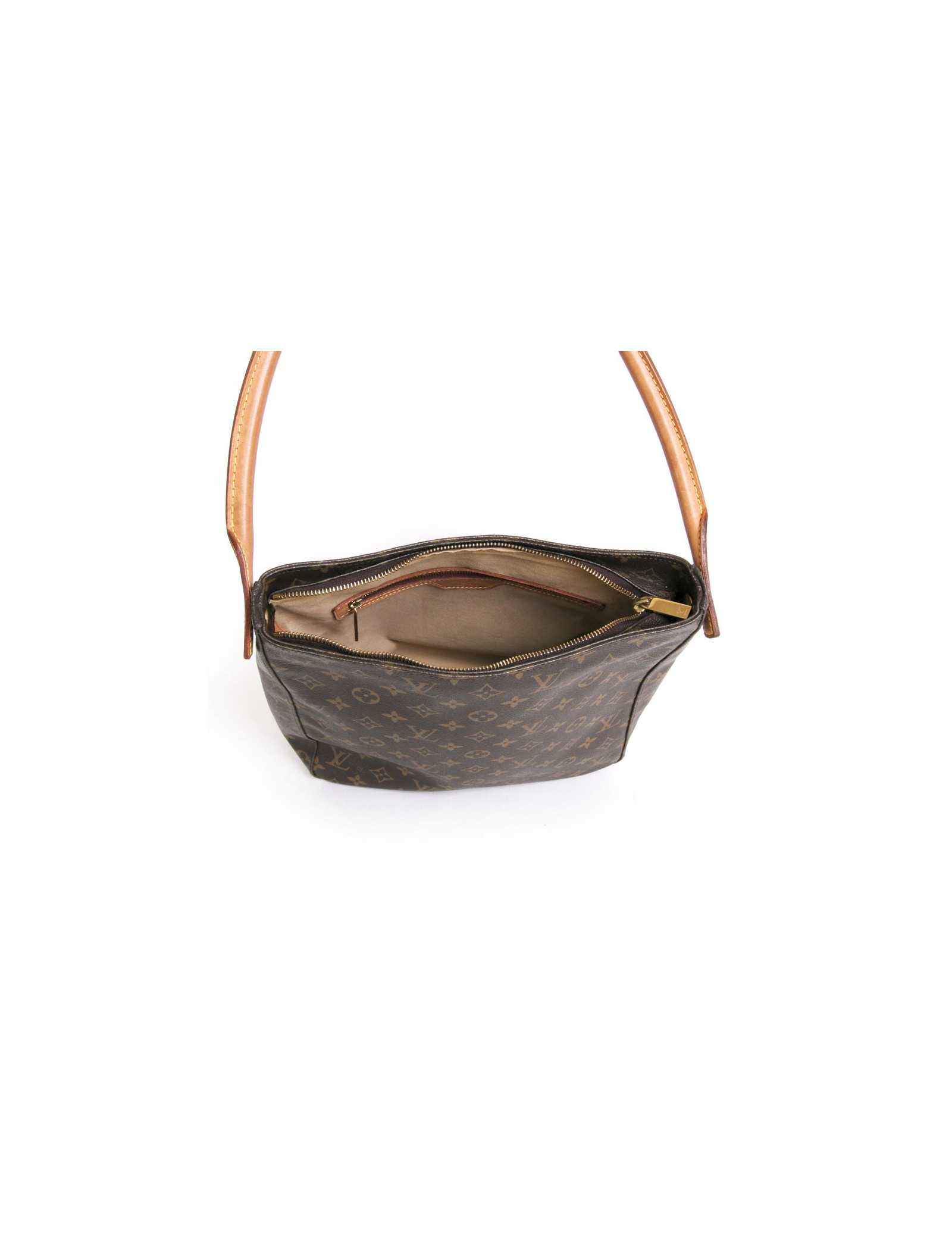 Bag "looping" of the Maison Louis Vuitton monogram canvas. Zipped. The hardware is gold metal. The Interior is beige suede with 1 zippered pocket and 1 pocket for smartphone. It is worn at the shoulder using a rigid Cove. Made in France. In good to very good condition.