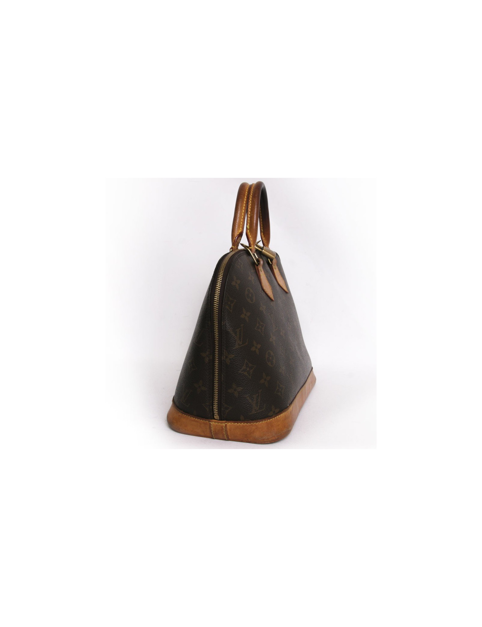Bag "Alma" of the Maison Louis Vuitton vintage Brown monogram canvas. Founded in 1930, it is the most structured of the iconic brand bags. In tribute to the Alma bridge, it reflects the Parisian chic. Door hand. Double closure zipper with lock. Golden brass metal parts. Finishes natural cowhide. Inside, a flat and another for smartphone pocket. State vintage. The leather is skated. Some tasks are visible under the bag.