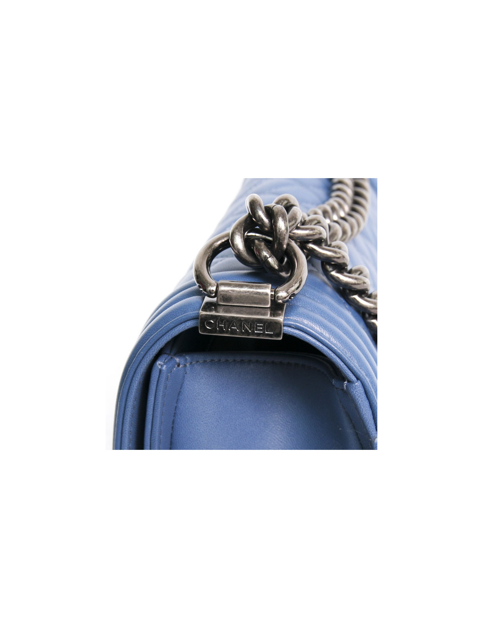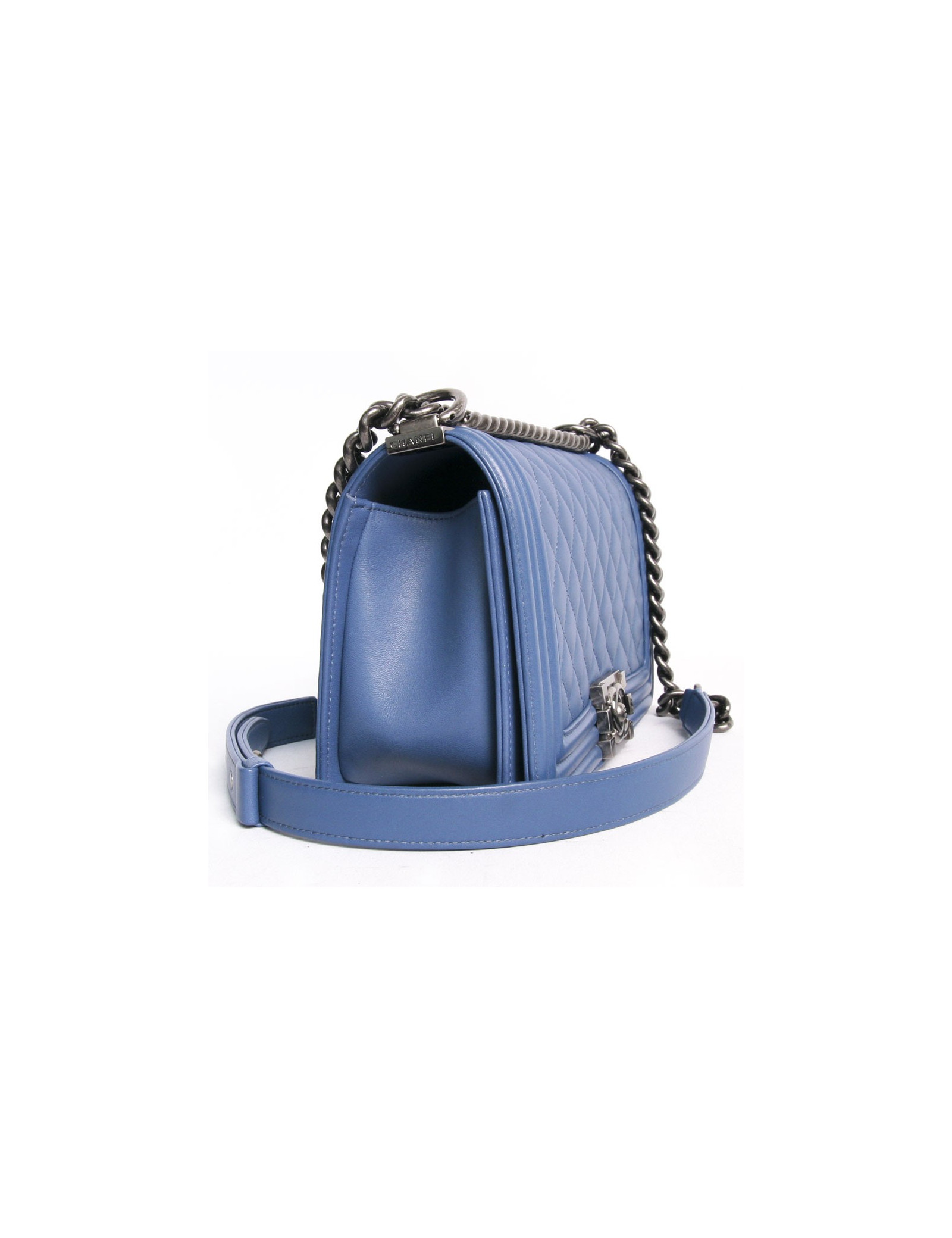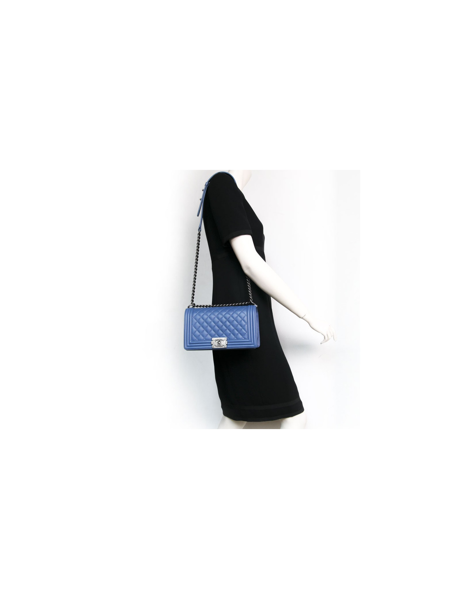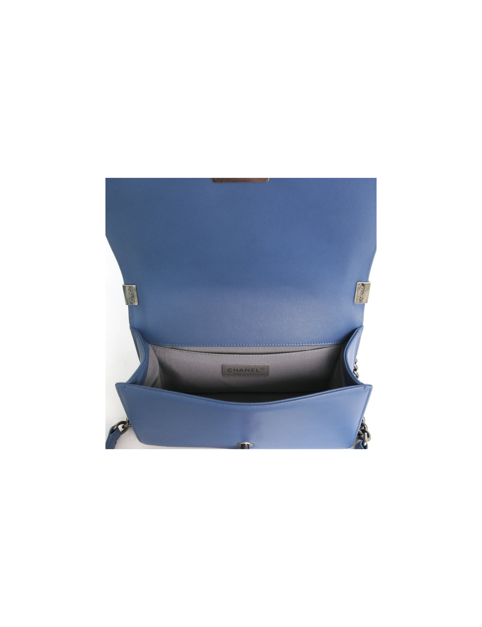 Mythical blue bag "Boy" from the House of Chanel quilted lambskin. The jewelry is aged silver metal. It is worn at the shoulder using a shoulder strap in leather and chain. The Interior is in gray canvas with a small patch pocket. Hologram: 1769... In very good condition. Very slight wear to corners under the bag.