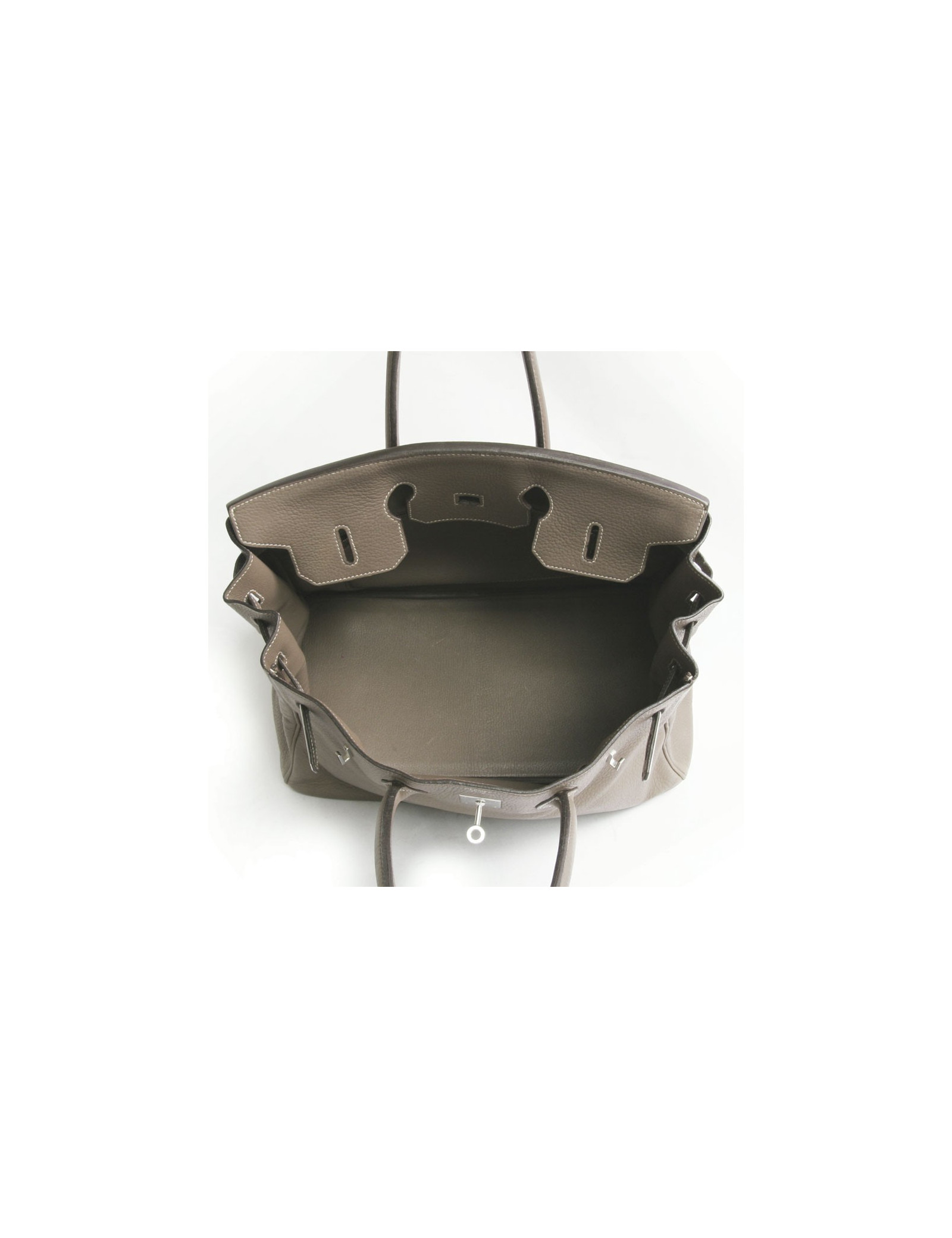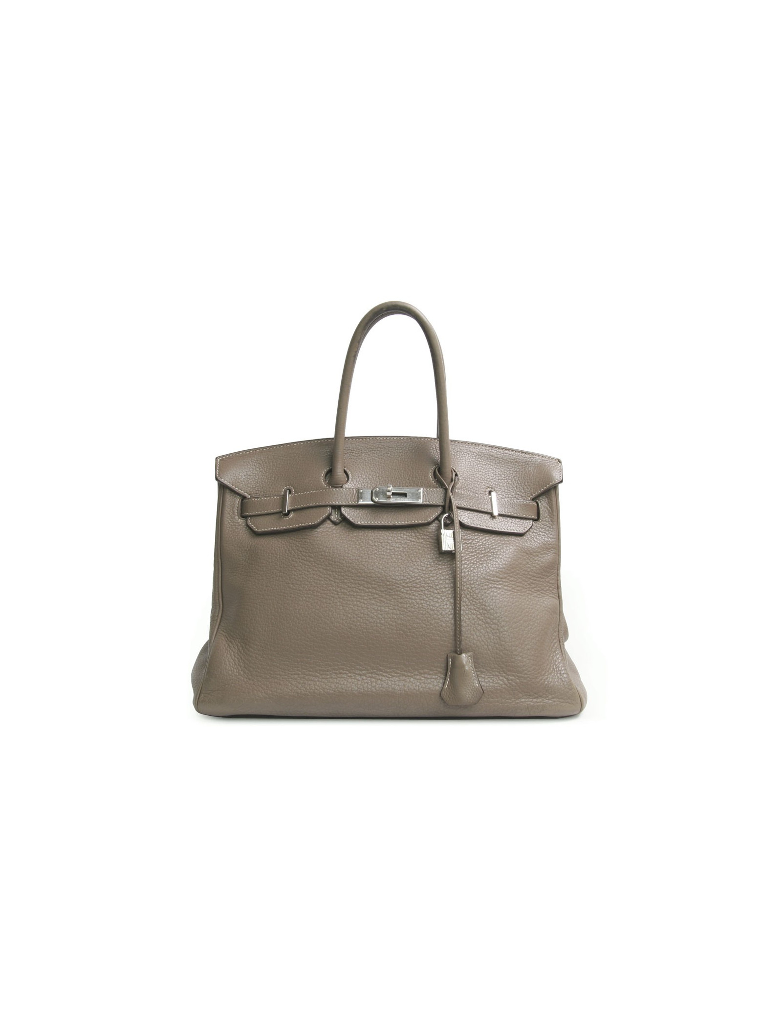 Birkin 35 en cuir taurillon clémence étoupe HERMES, entièrement nettoyé. En très bon état Jewelry: silver ring year of manufacture (2008) Letter L. Size: L35 x H25 x P18 There is a discoloration on the handles There is a slight trace of wear on the corners, and micro scratches on the jewelry. The bag will be delivered with padlocks, keys, zipper and Tinker Bell dustbag Hermès