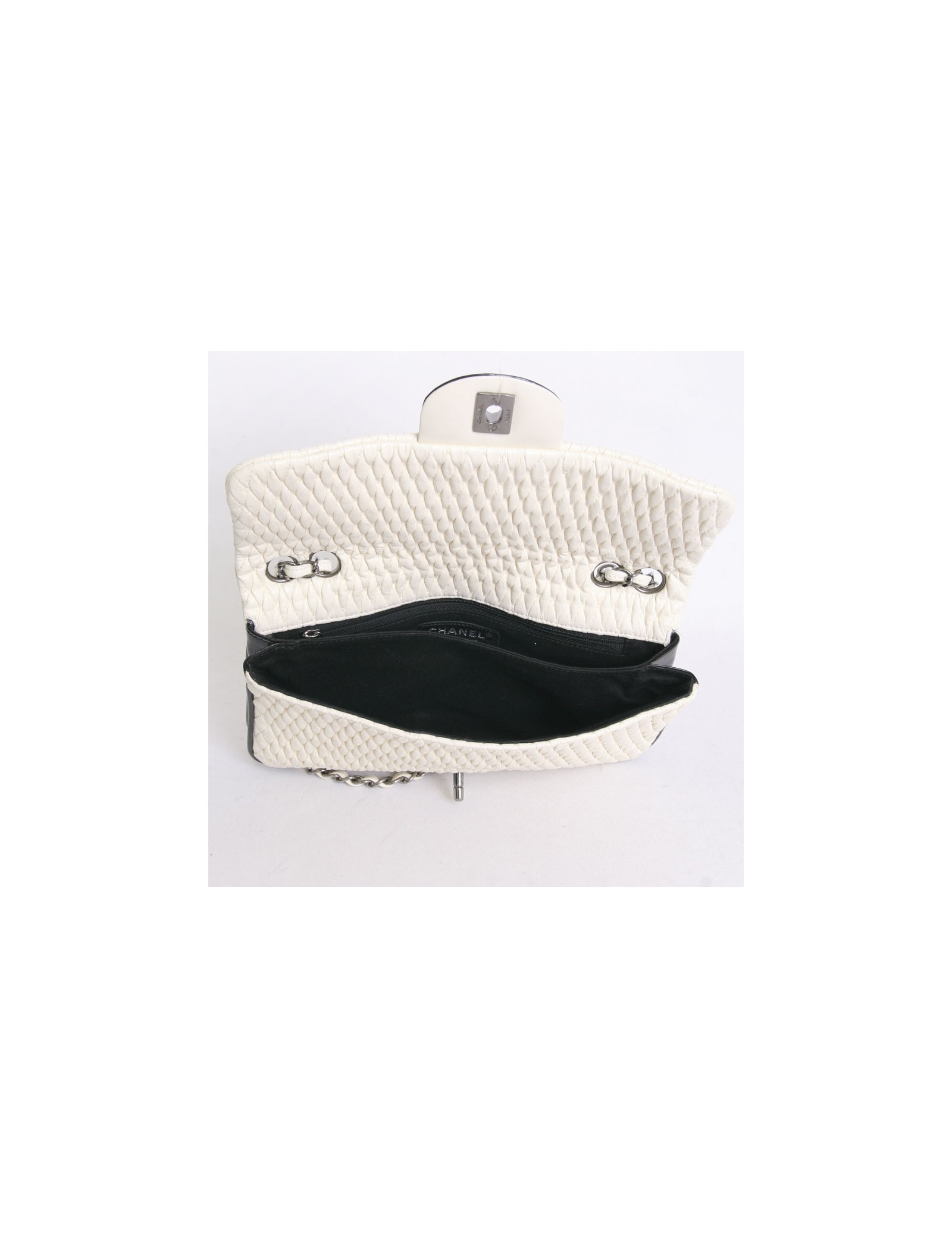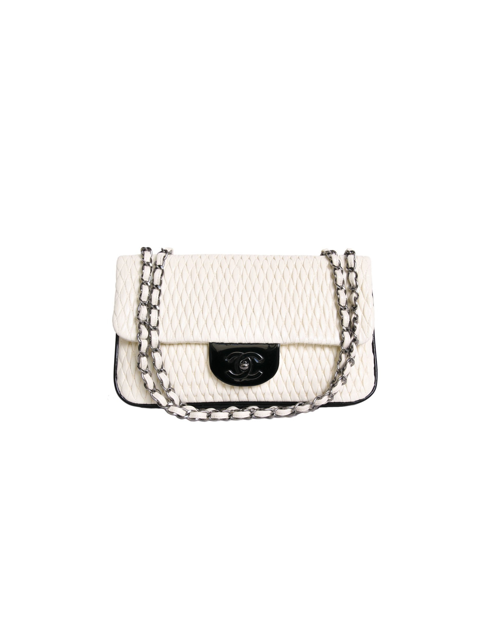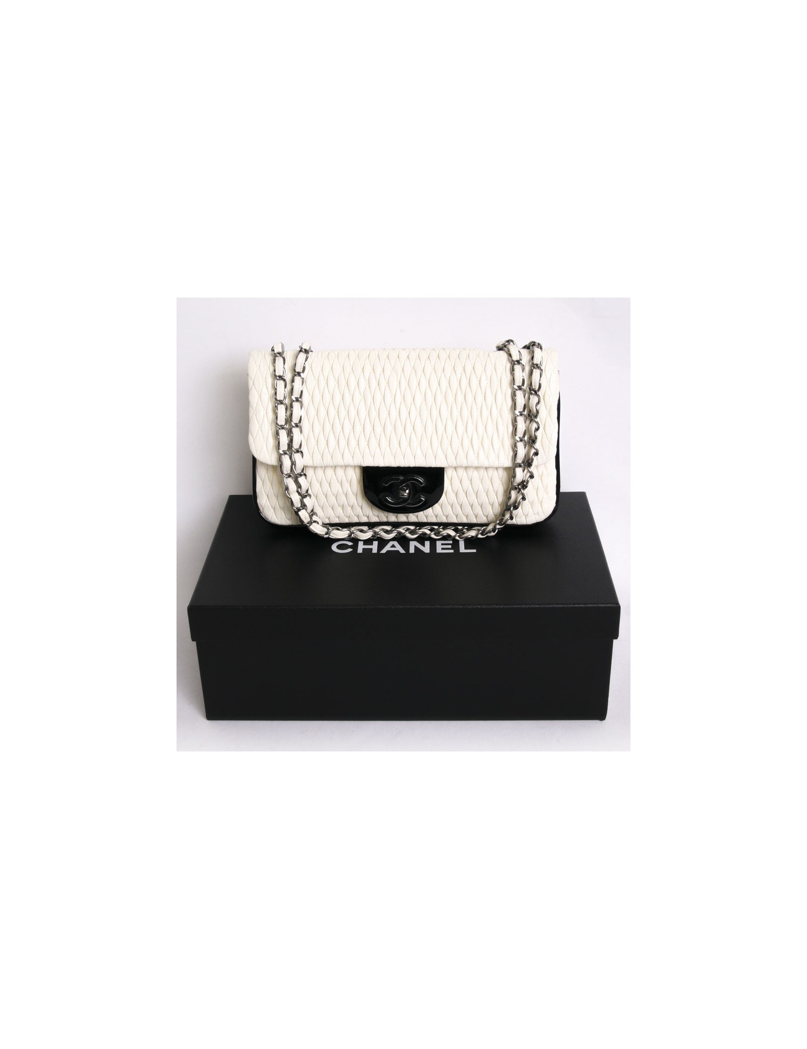 CHANEL leather bag embossed egg shell and black patent