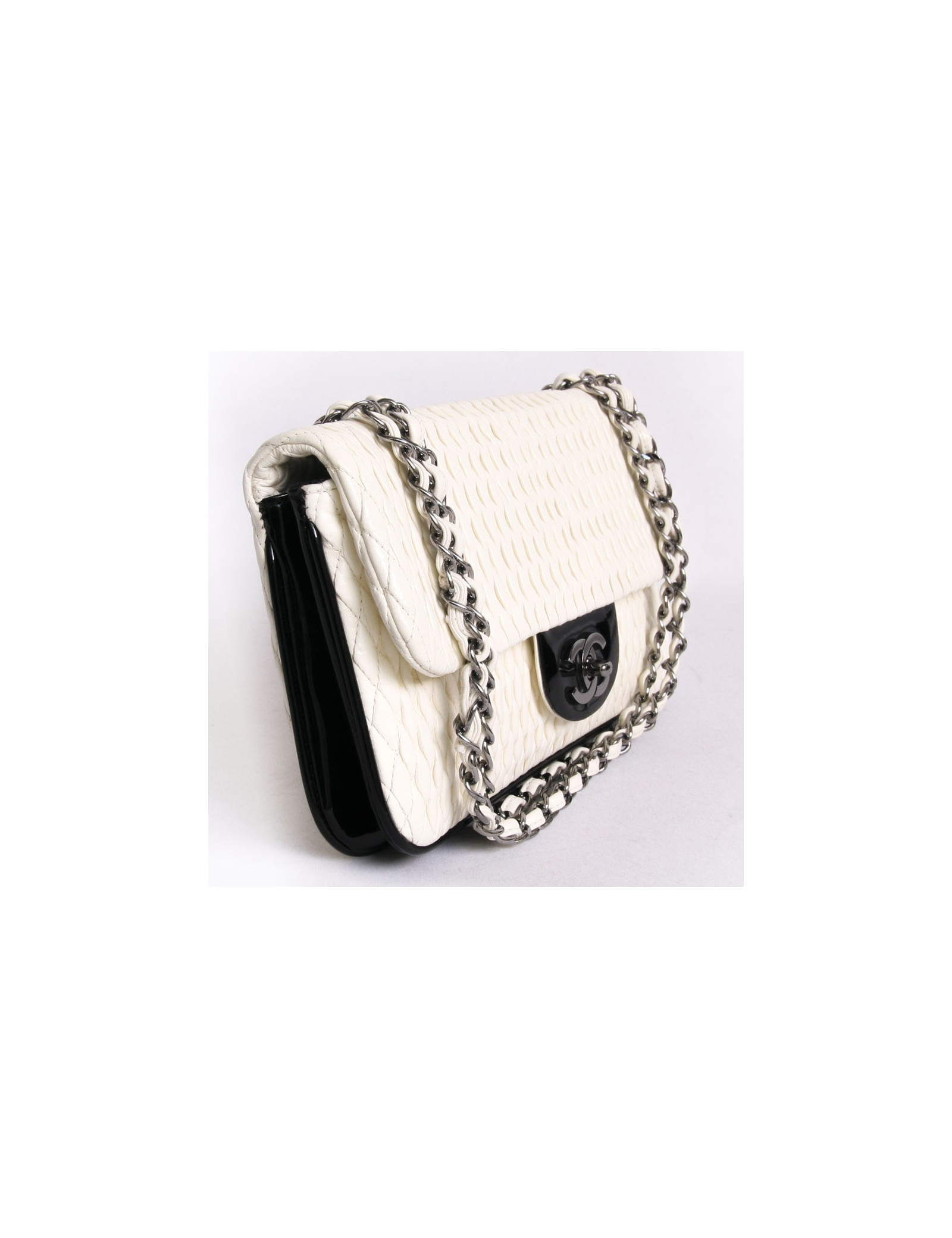 Authentic Chanel House waffle leather bag egg shell and black patent. Jewelry and chain are in silver metal. The Interior is black cloth, it has two areas of storage and a zipped pocket. Clasp CC. Comes from the balances. In very good condition.