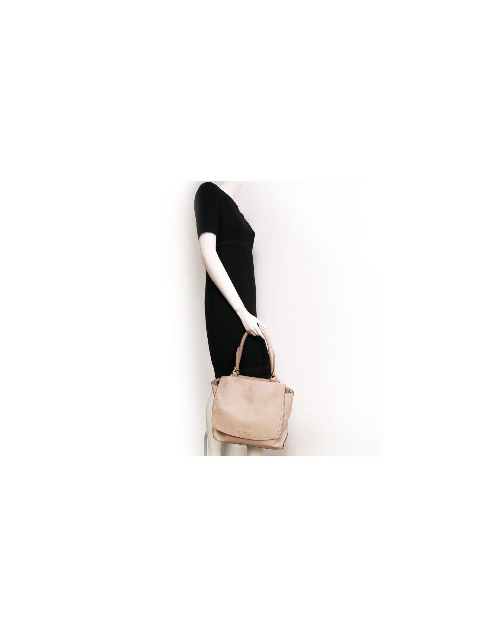 Givenchy satchel flap bag in gold lamb leather. The hardware is in gold metal. The interior is in beige canvas.