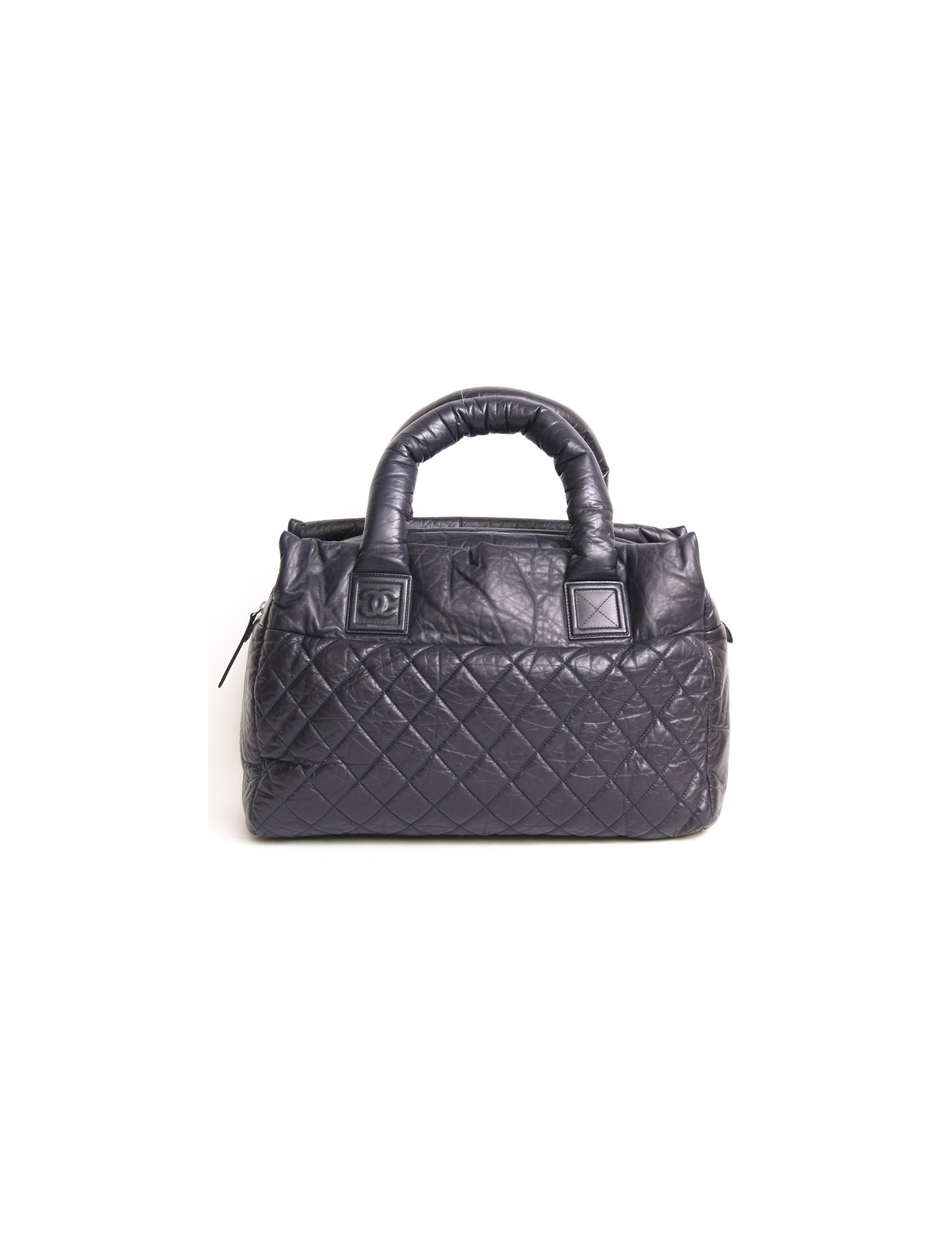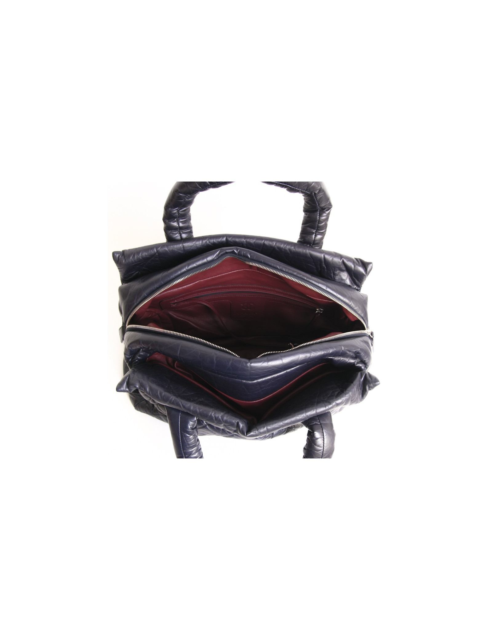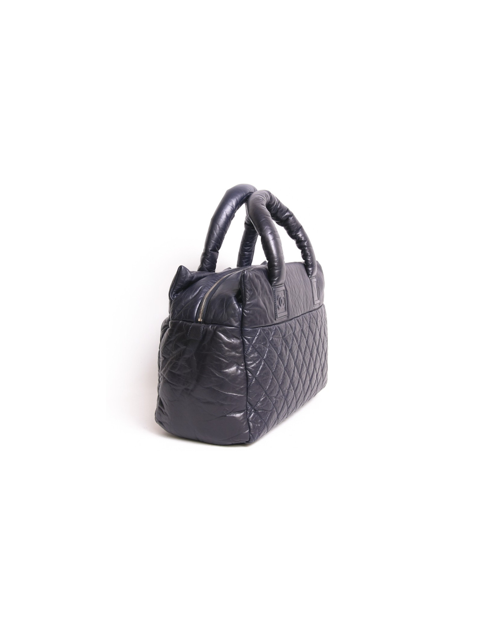 Sac "Cocoon" de la Maison Chanel en cuir bleu légèrement violet foncé matelassé, grand modèle. L'intérieur est doublé en cuir bordeaux. Il dispose de deux espaces de rangement dont une poche zippée. Fermeture zippée en métal argenté. Double poignée. Hologramme: 1668.... Etat neuf.