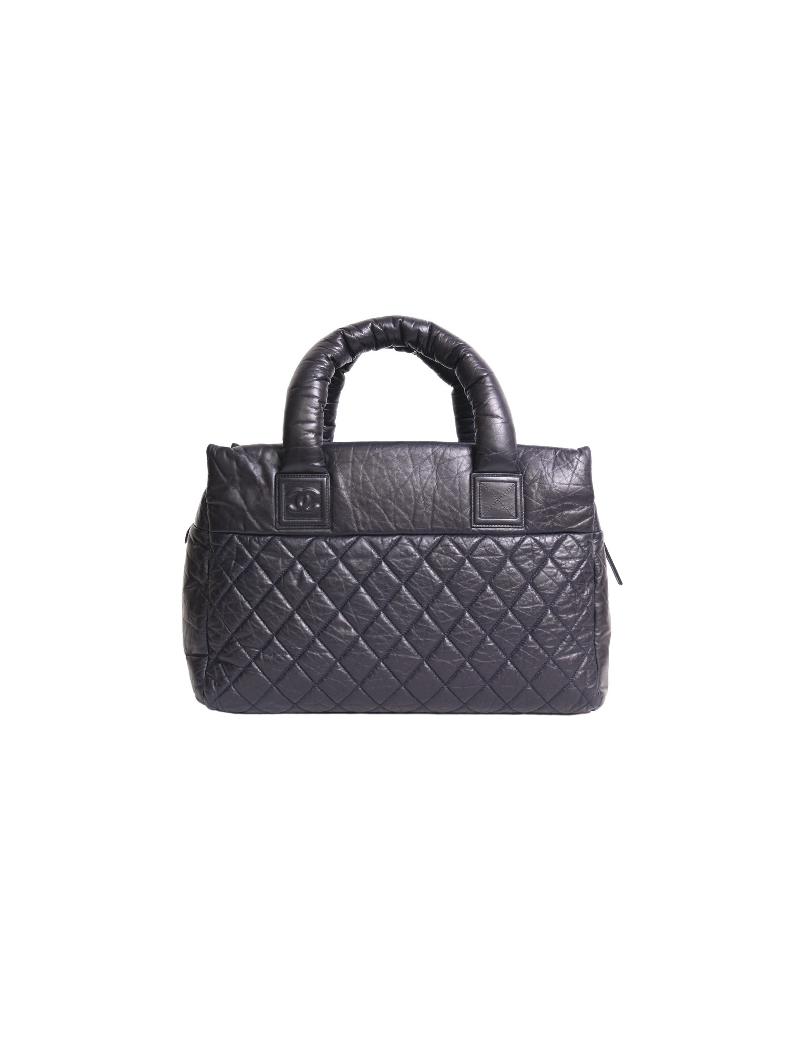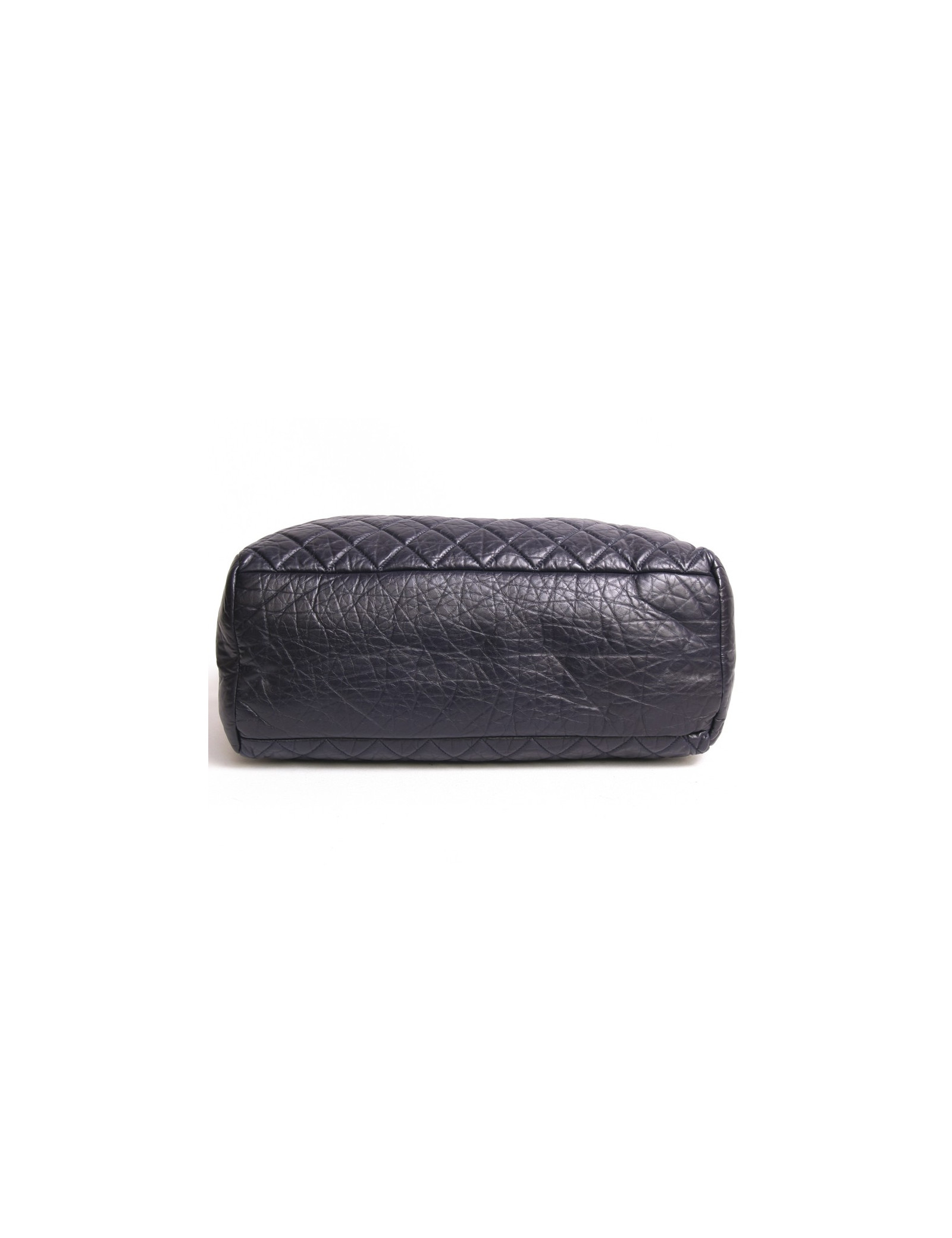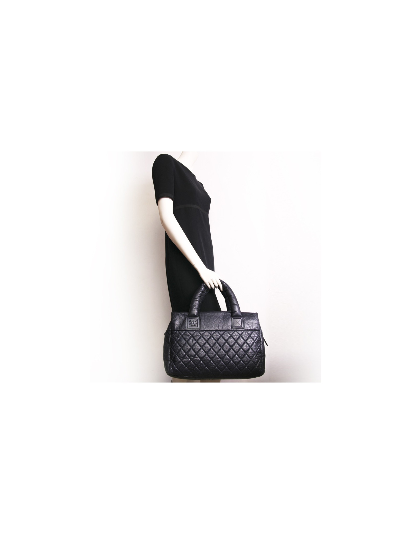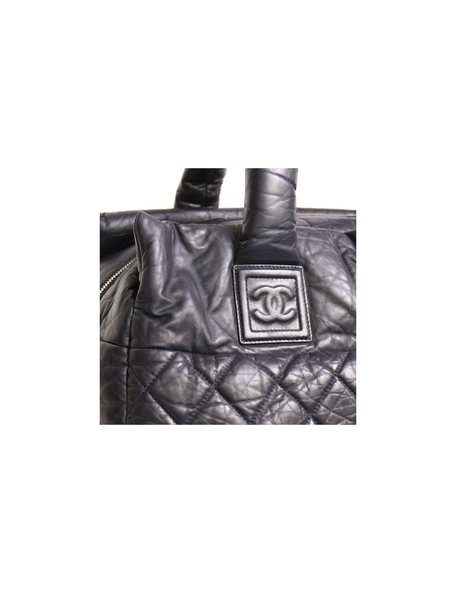Sac "Cocoon" de la Maison Chanel en cuir bleu légèrement violet foncé matelassé, grand modèle. L'intérieur est doublé en cuir bordeaux. Il dispose de deux espaces de rangement dont une poche zippée. Fermeture zippée en métal argenté. Double poignée. Hologramme: 1668.... Etat neuf.
