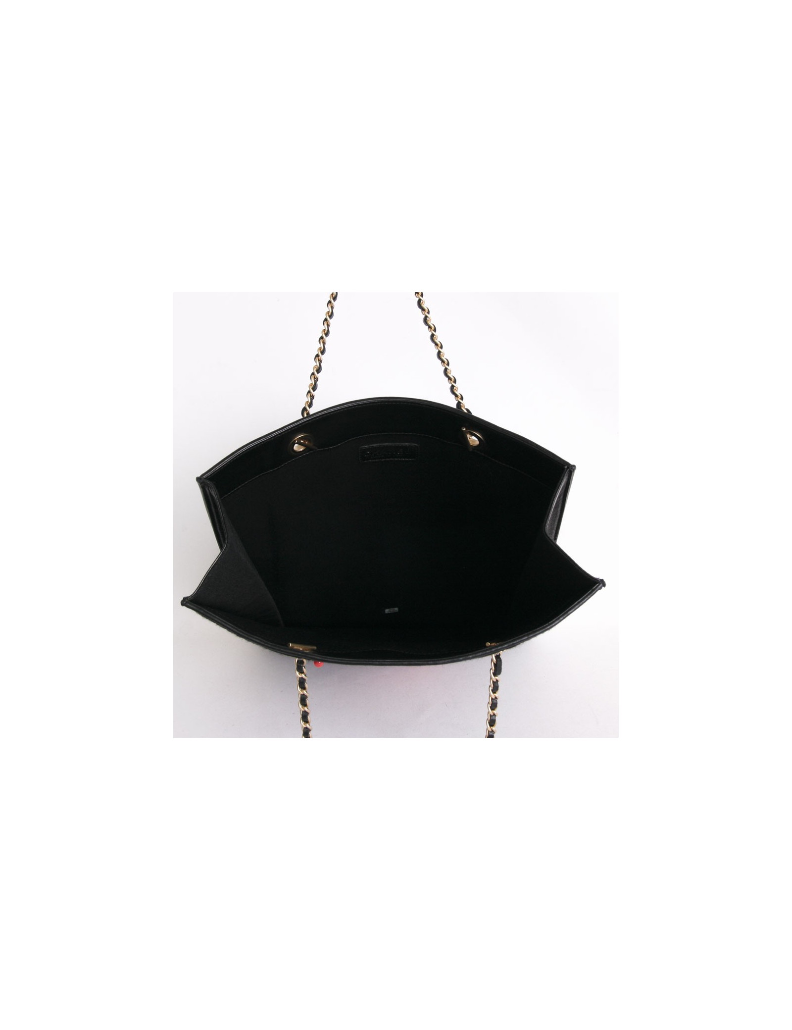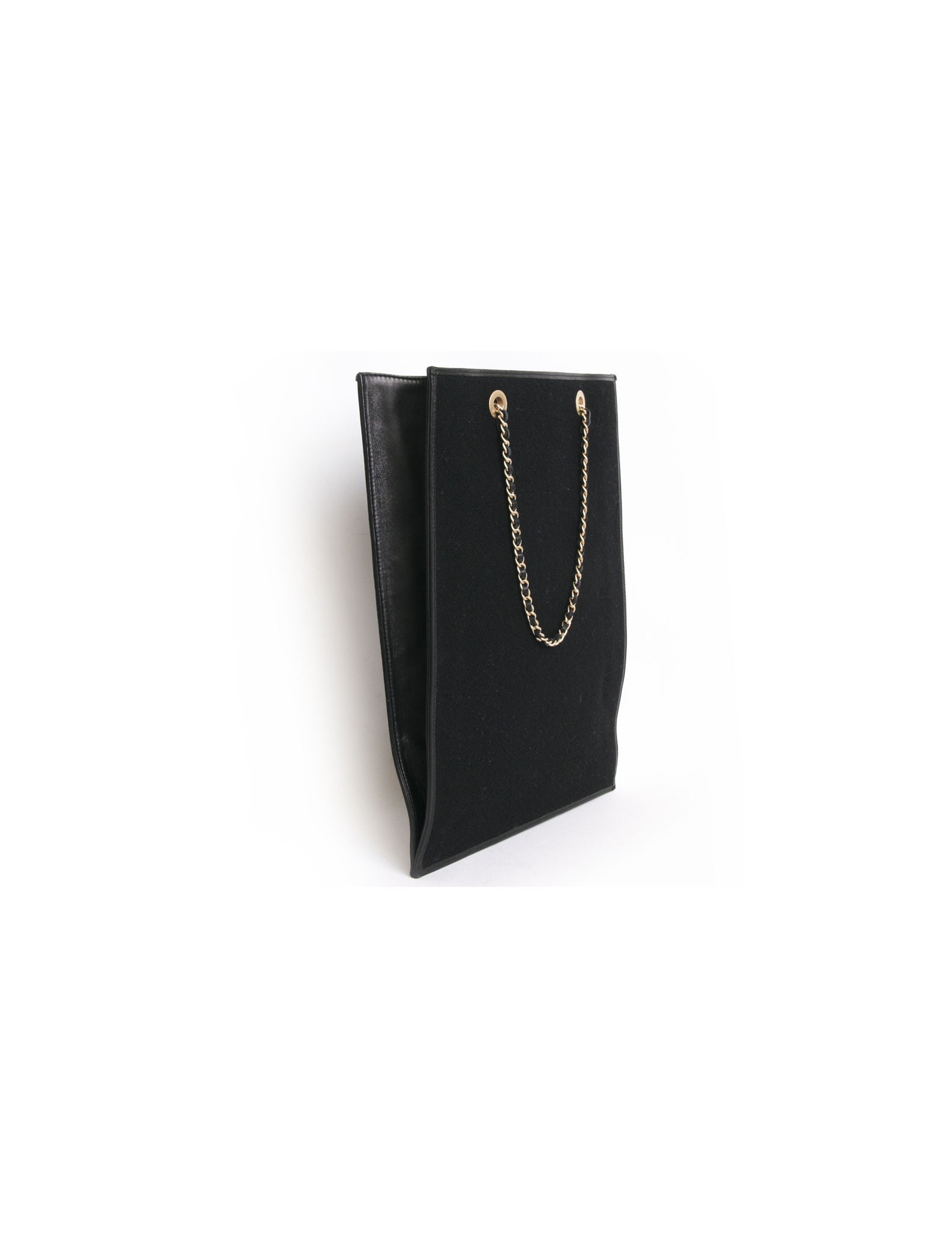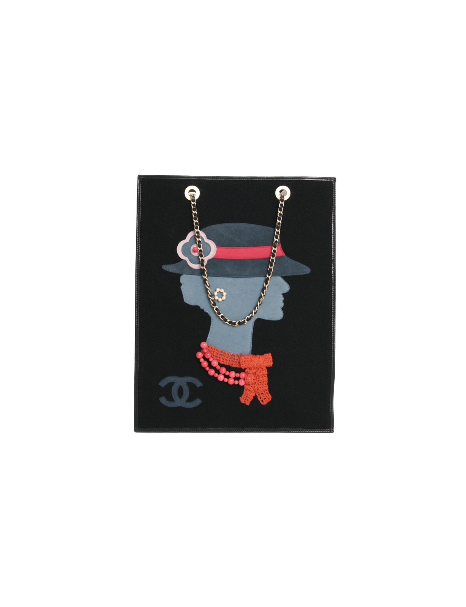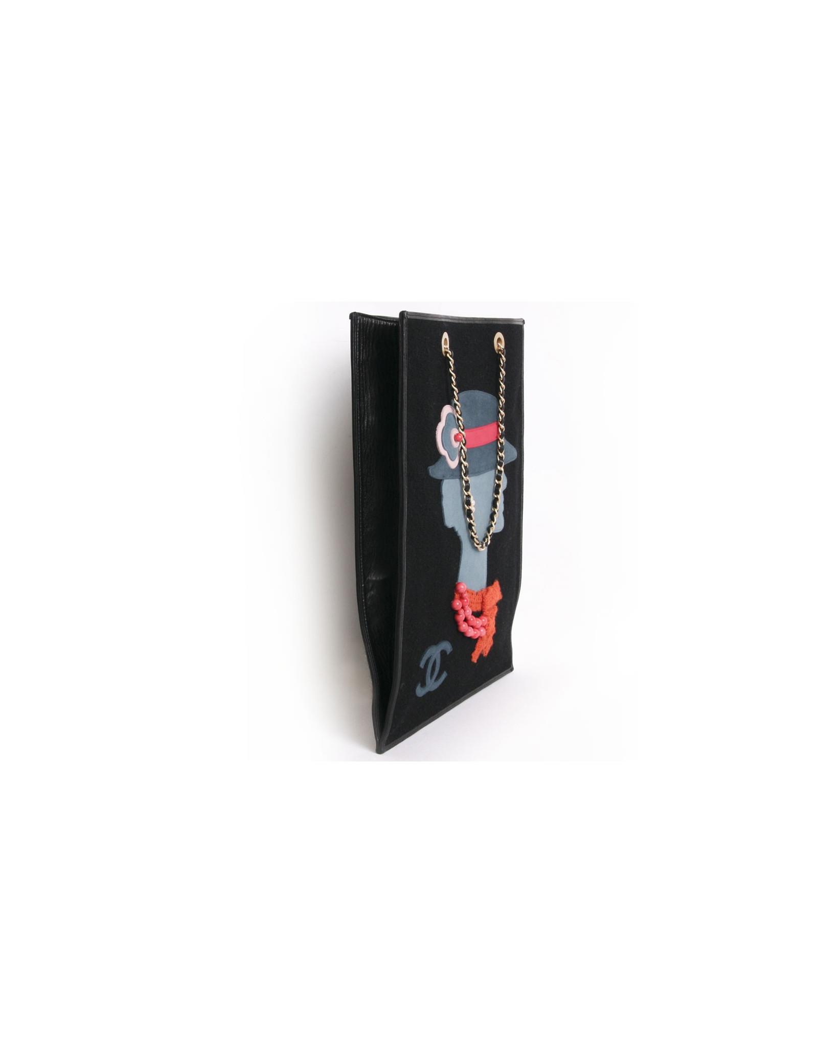 Bag Chanel Tote in black tweed and black smooth lambskin. Collector! It represents a bust of a woman very "coco" felt colors: turquoise, pink and orange. The jewelry is made of metal color pale gold. It is lined with black satin. ideal to put documents.