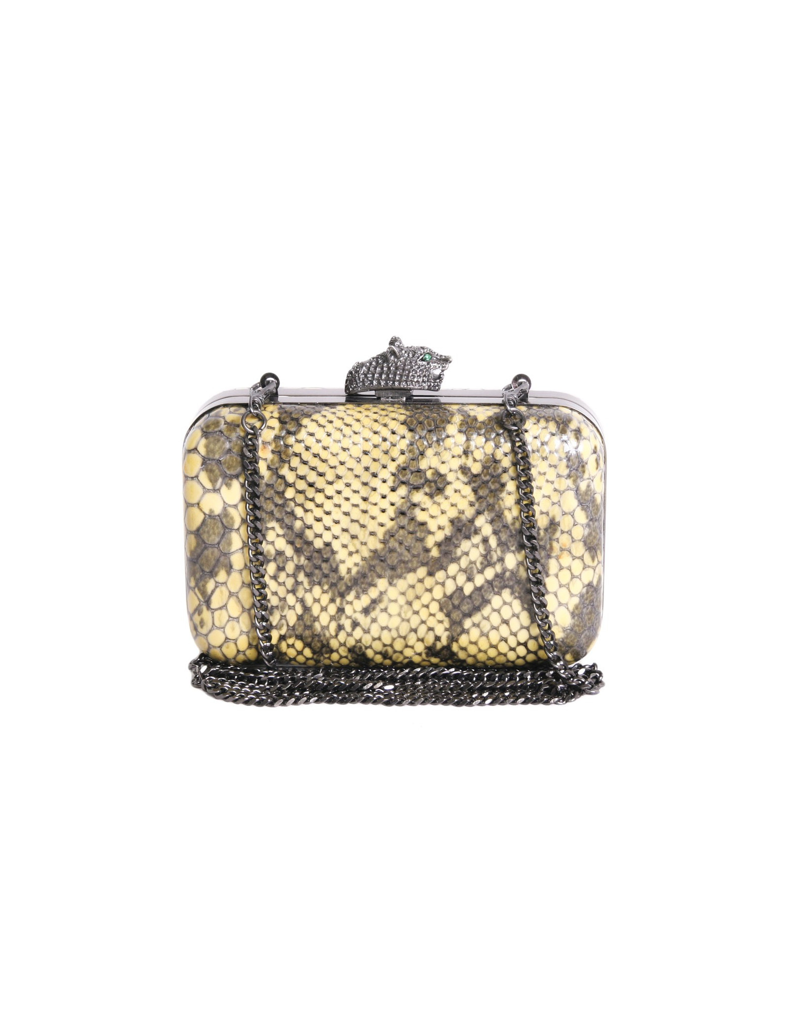 Album House of Harlow 1960, in painted snake to dominant yellow and black. copper jewelry and removable ruthenium chain to wear cross cover. Jackson gate. The clasp is a tiger head with emerald green Crystal eyes.
