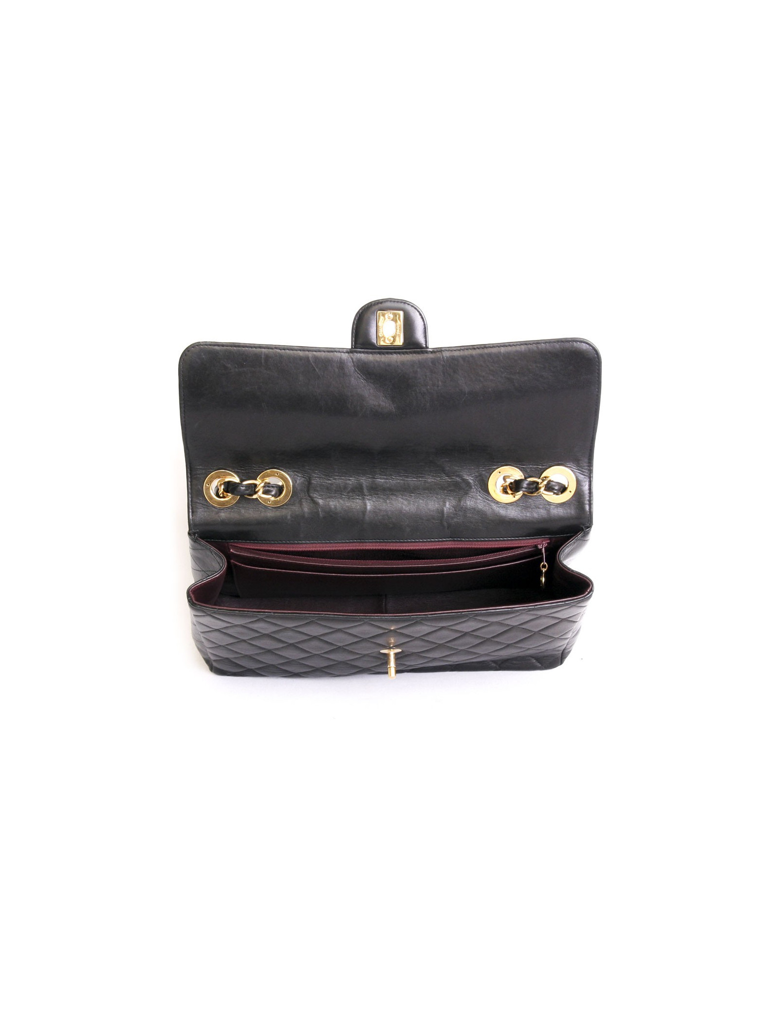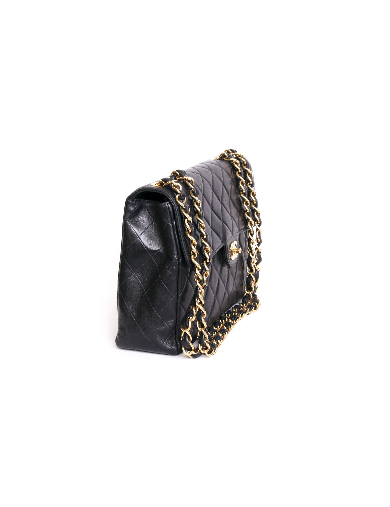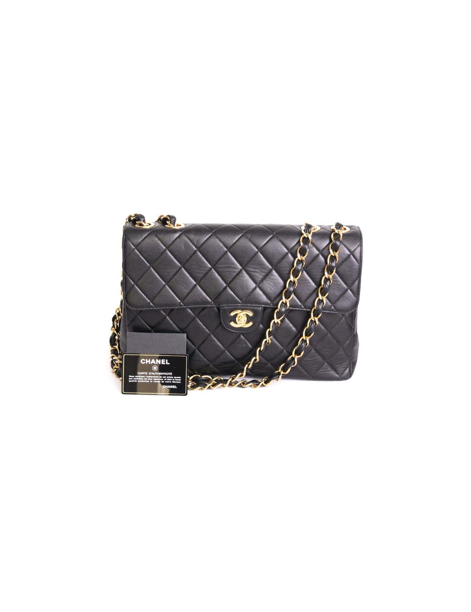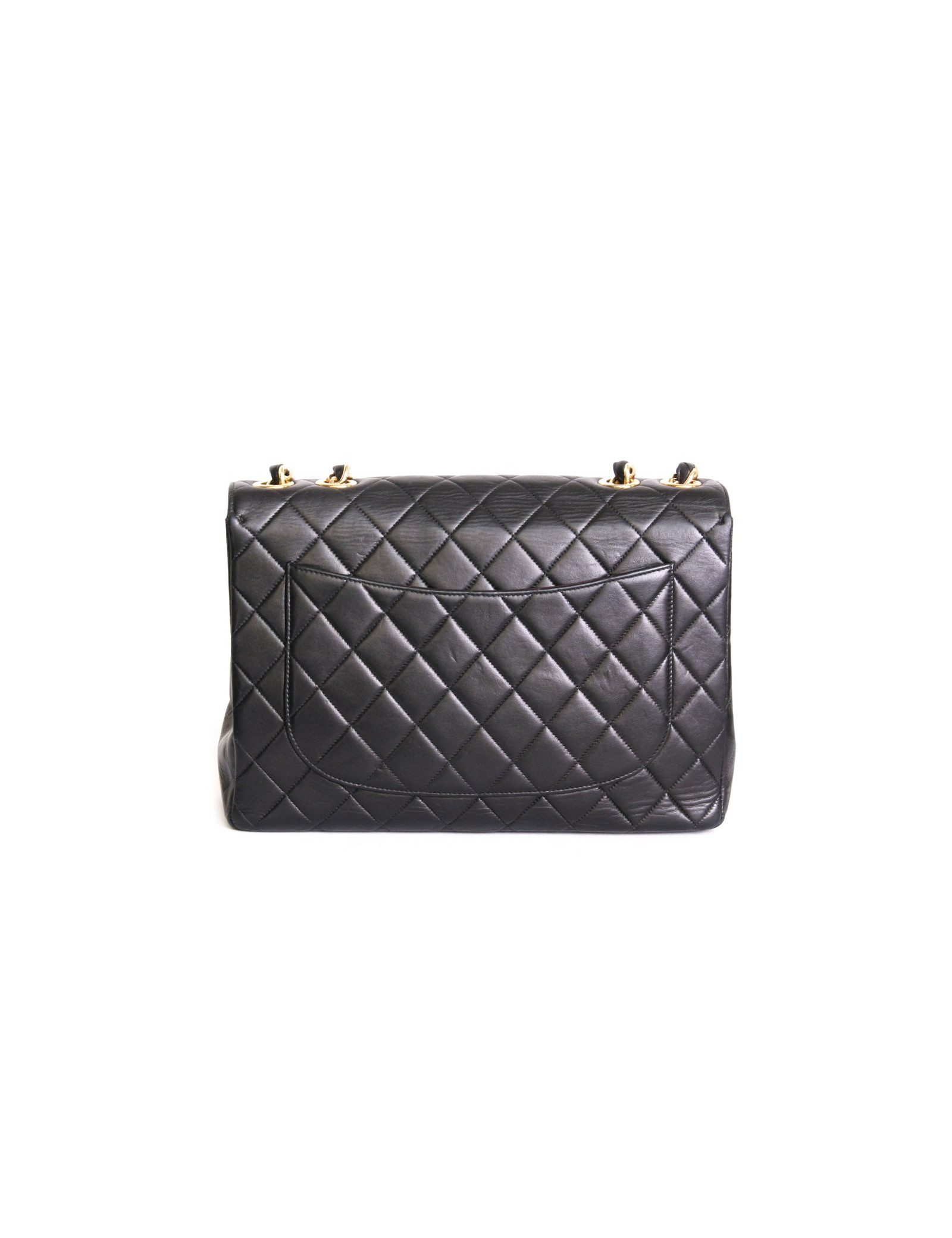 Bag model Chanel jumbo with a single flap, in quilted black smooth leather. The jewelry is gold.