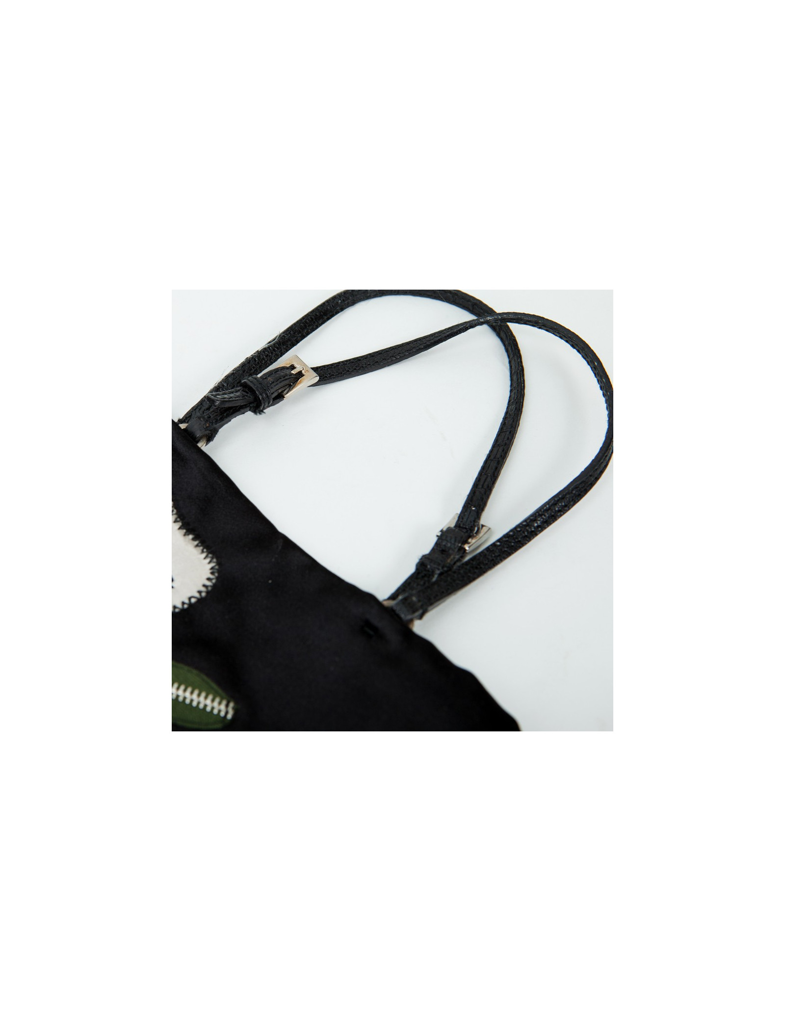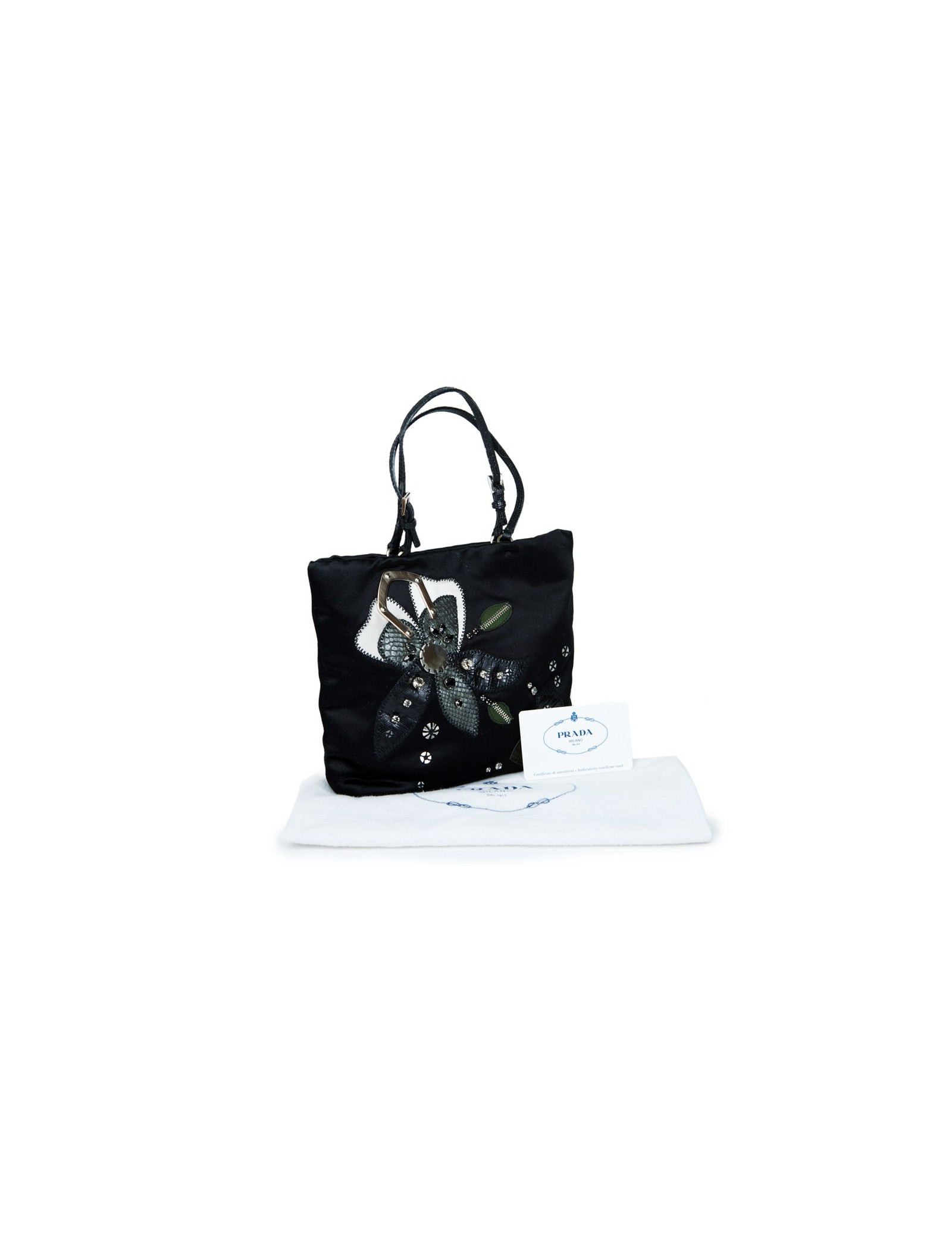 Lovely evening bag Prada black with pretty embroidery in python and brilliant Silk Satin on the front. The two handles are made of black leather. Snap button closure. The Interior is black satin with two pockets one zippered and one small per button pressure. In very good condition. Jewelry metal palladium.