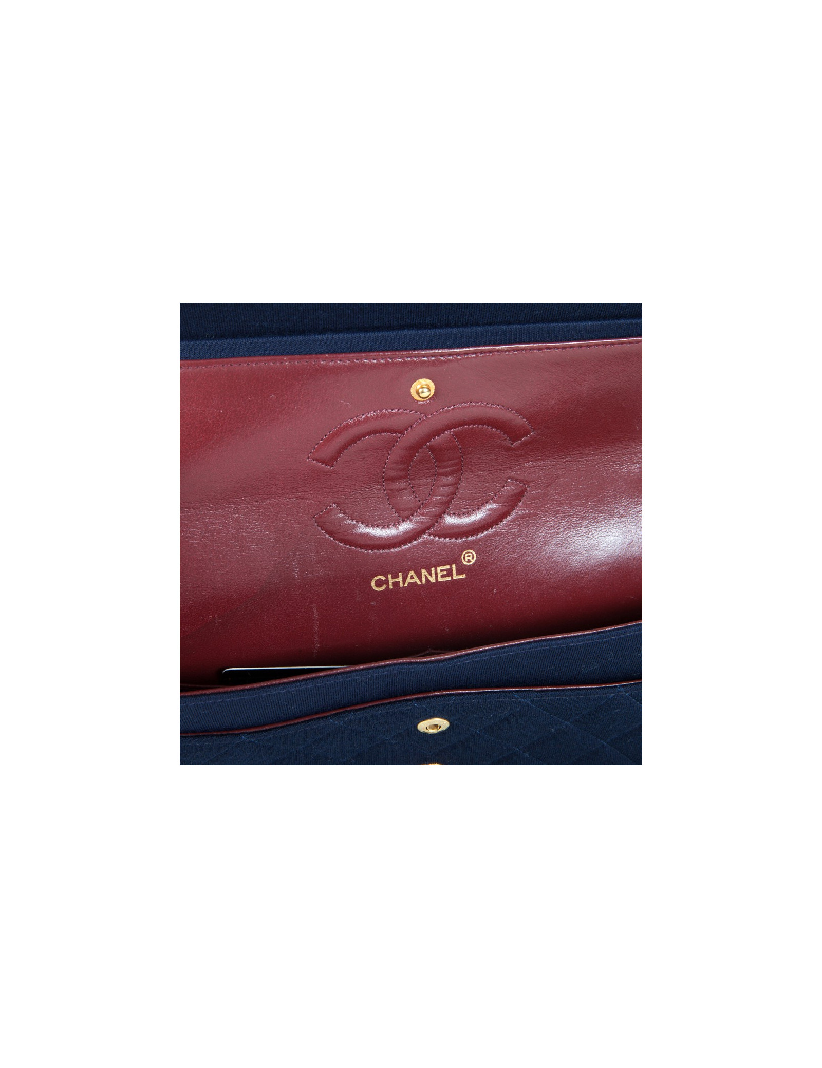 The timeless blue bag 'Timeless' of the House of Chanel quilted Jersey marine. The jewelry is gold metal. Clasp 'CC'. Double flap. The Interior is in Burgundy leather with 3 pockets and an another flat at the back of the bag pocket. Hologram: 1223. and authenticity card. In excellent condition.