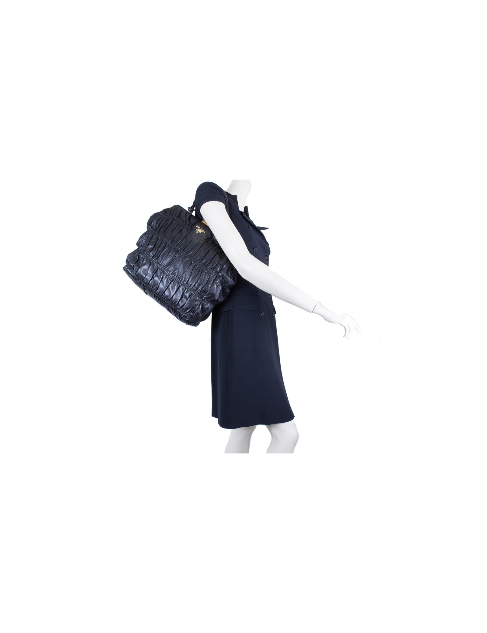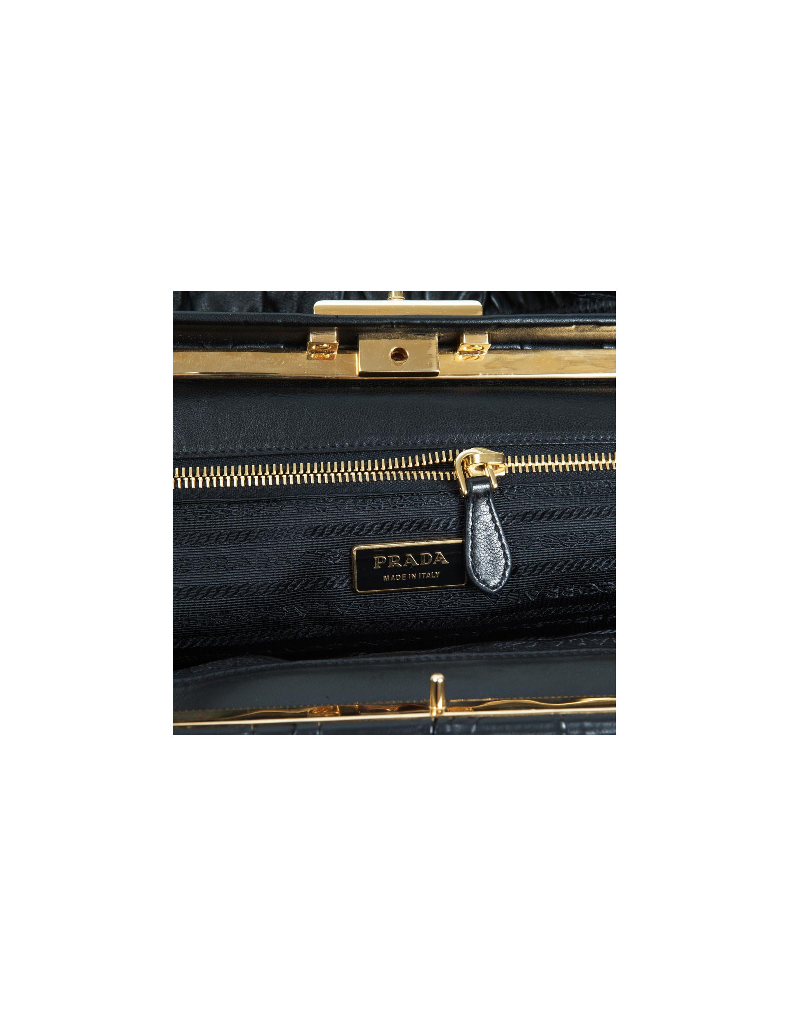 Prada bag black leather pleated. The jewelry is gold metal. It closes with a pressure button and also using a key if you wish for more security. The Interior is black monogram canvas with a large zippered pocket. It is worn on the arm. In very good condition.