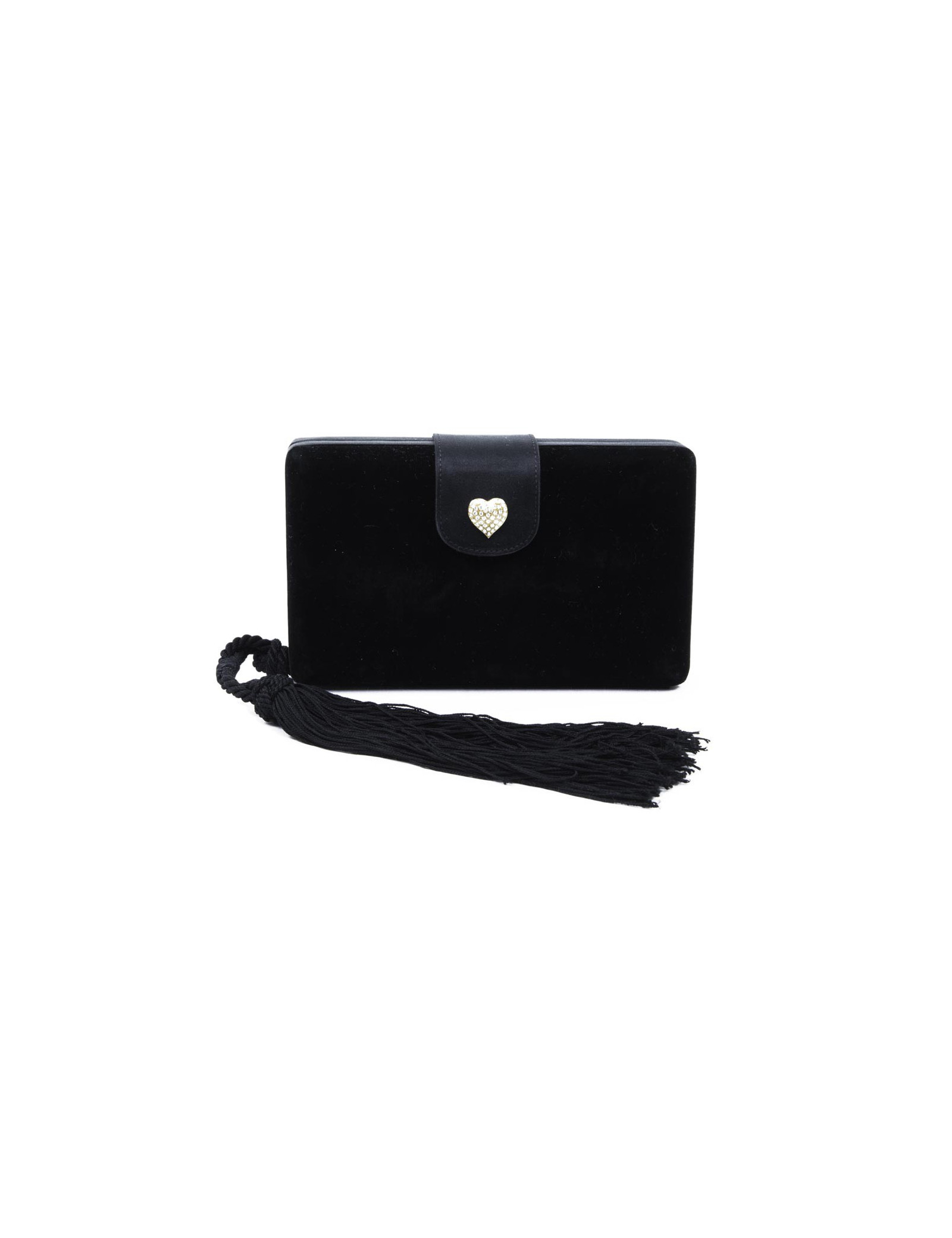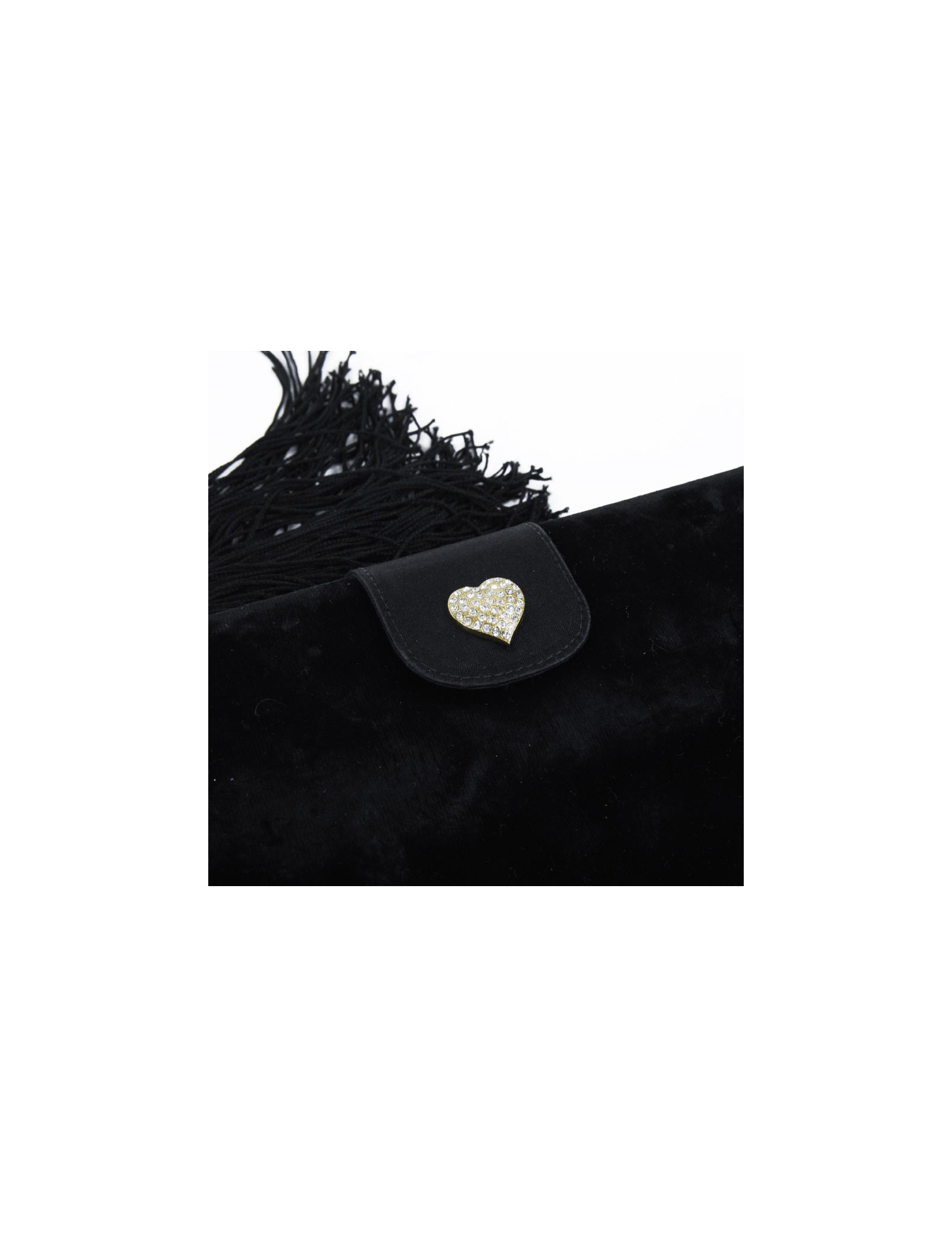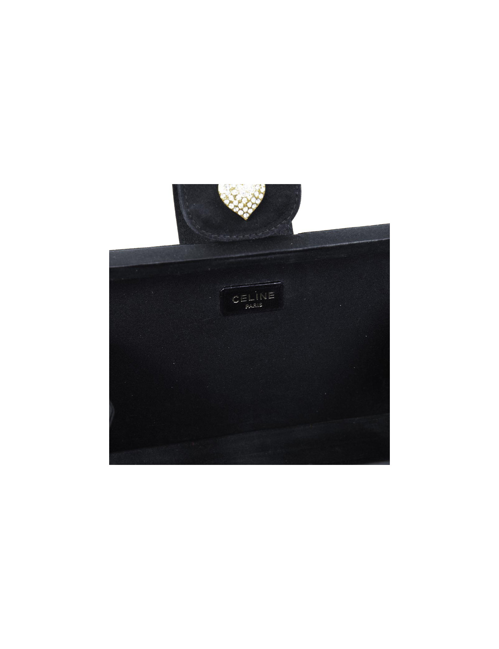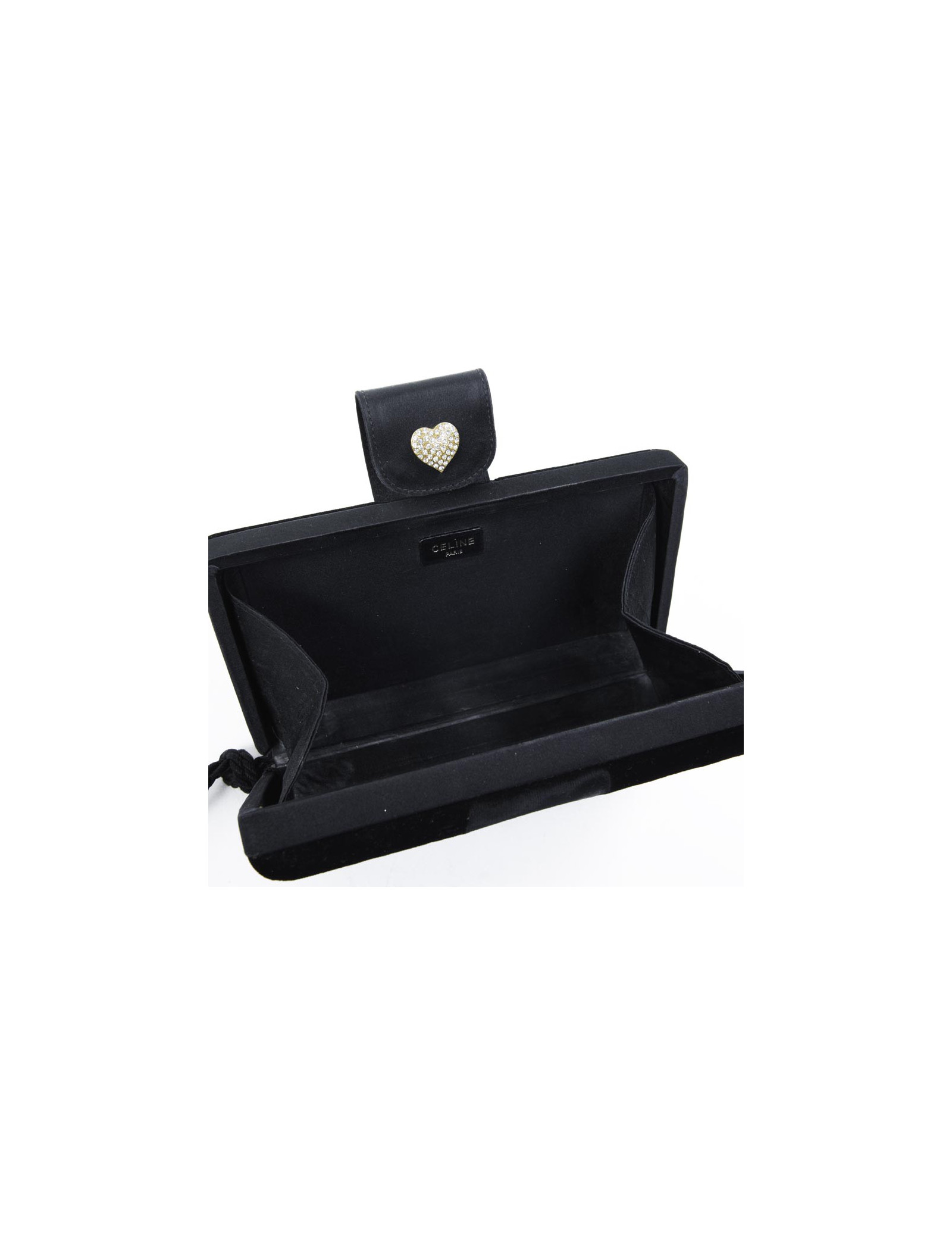Very elegant clutch Céline in black silk velvet. The outlines are in black silk satin. Snap button closure. The inside is satin. The heart that is located on the flap is rhinestones and gold metal. In very good condition (slight trace of make-up inside powder).