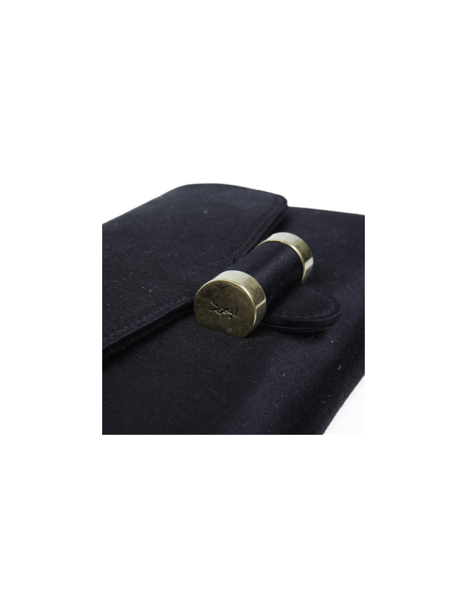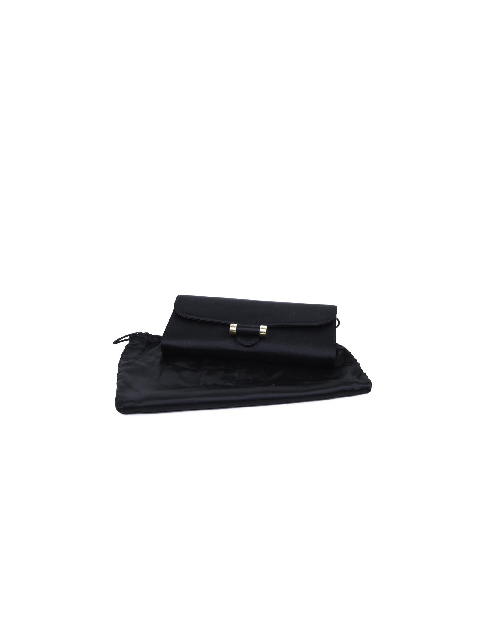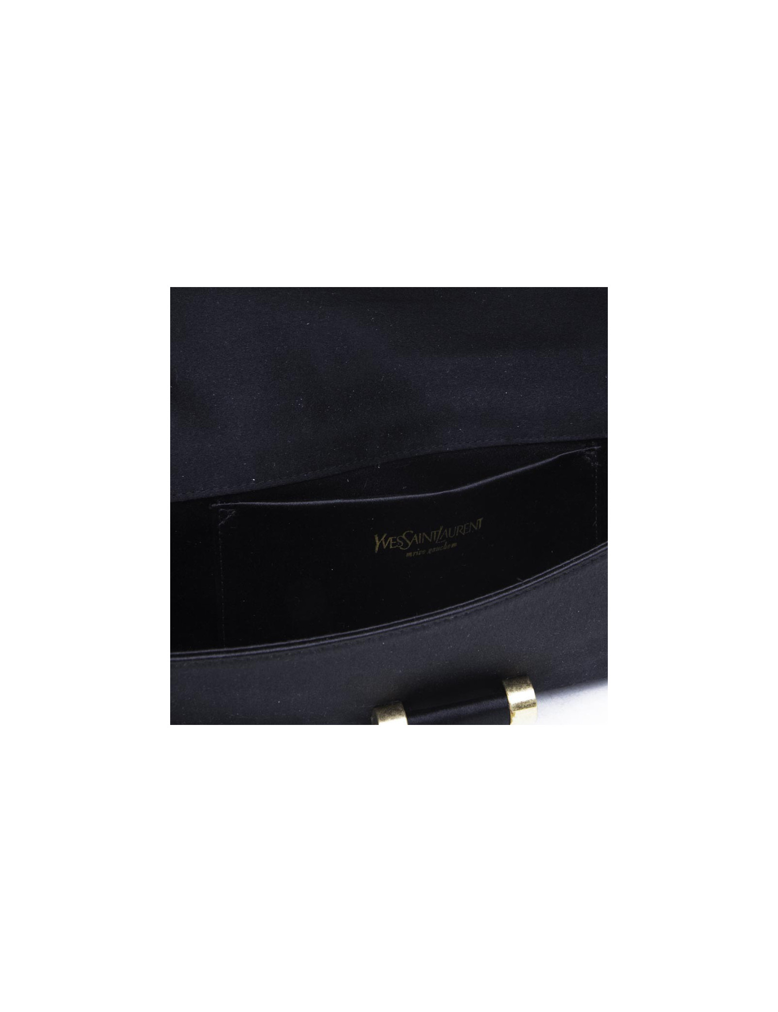 Sleek clutch for the evening of the Yves Saint Laurent Silk Satin black House. The jewelry is aged gold metal. The Interior is also in black silk satin with a small patch pocket.