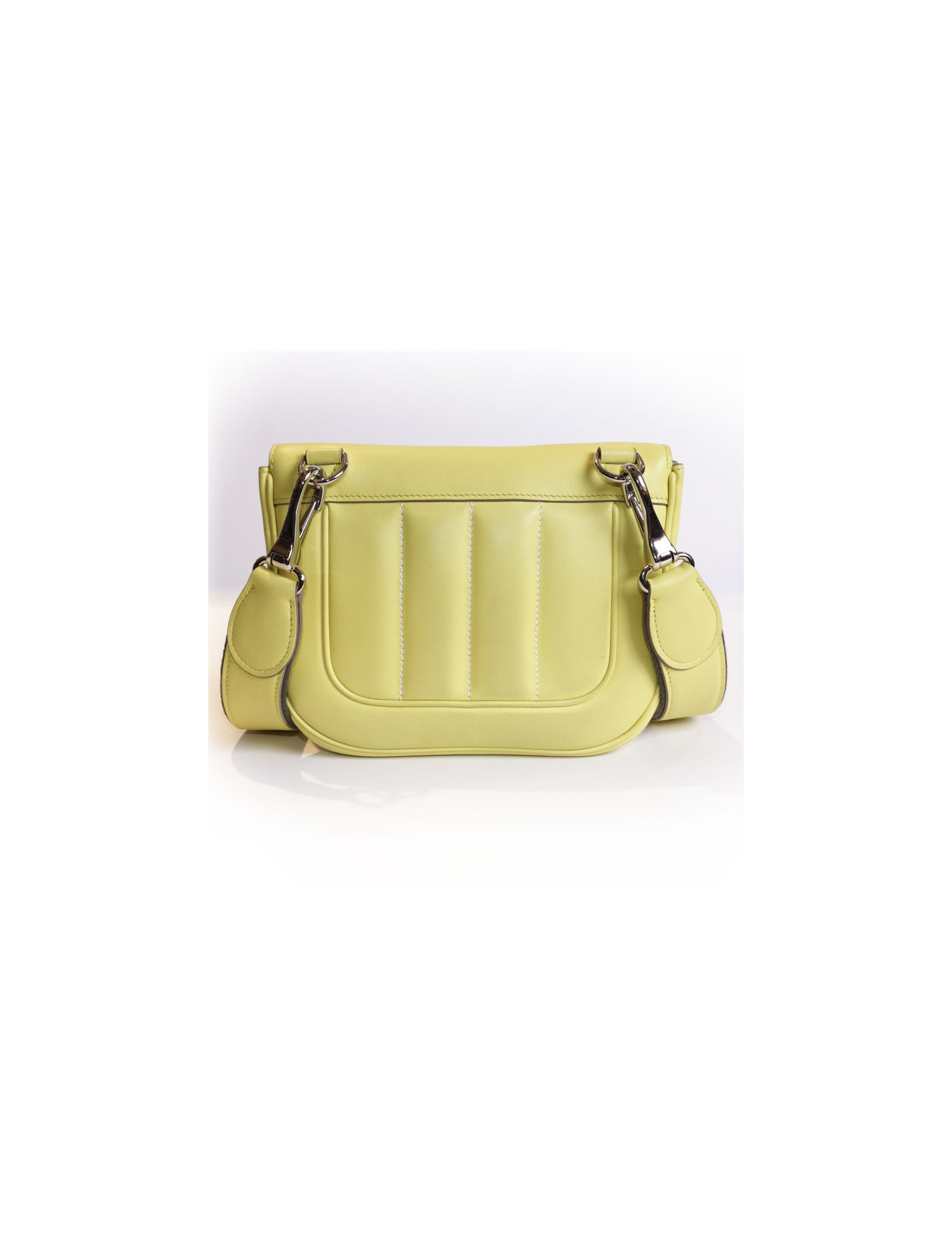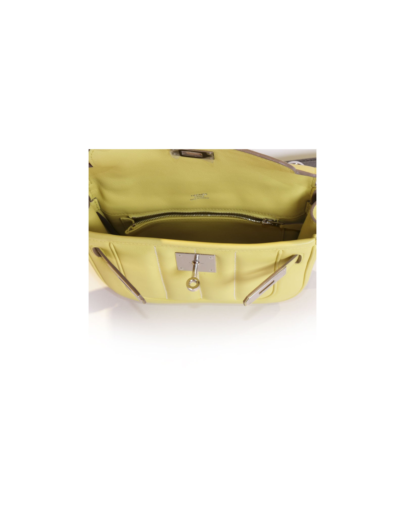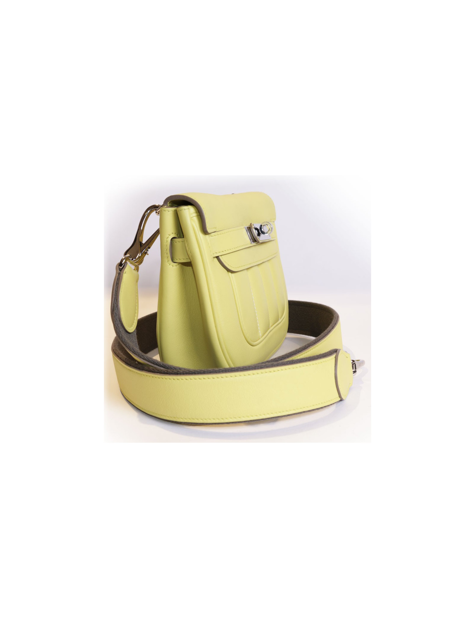 Lovely bag Hermès leather calf Evercolor Chick Yellow sedan. The jewelry is Palladium. Clasp Kelly. Inside, there are two plated pockets and one zipped. The strap is leather and fabric color tow and it is removable. Letter Q in a square. In excellent condition. Been very little. Length: 21 cm, height: 15 cm, depth: 6 cm, shoulder strap: 114 cm will be delivered in his box and his Hermès dustbag