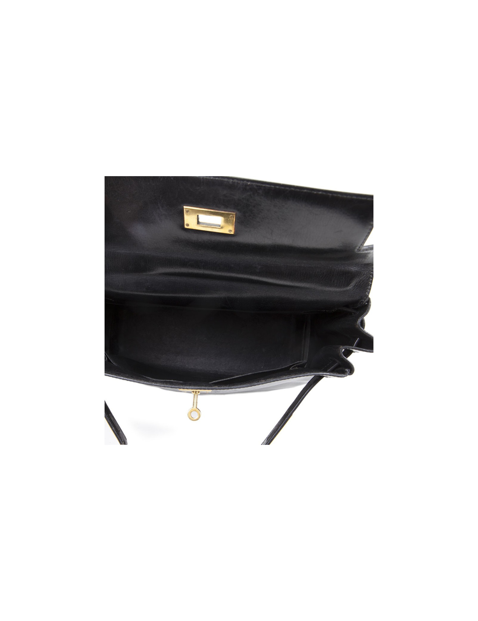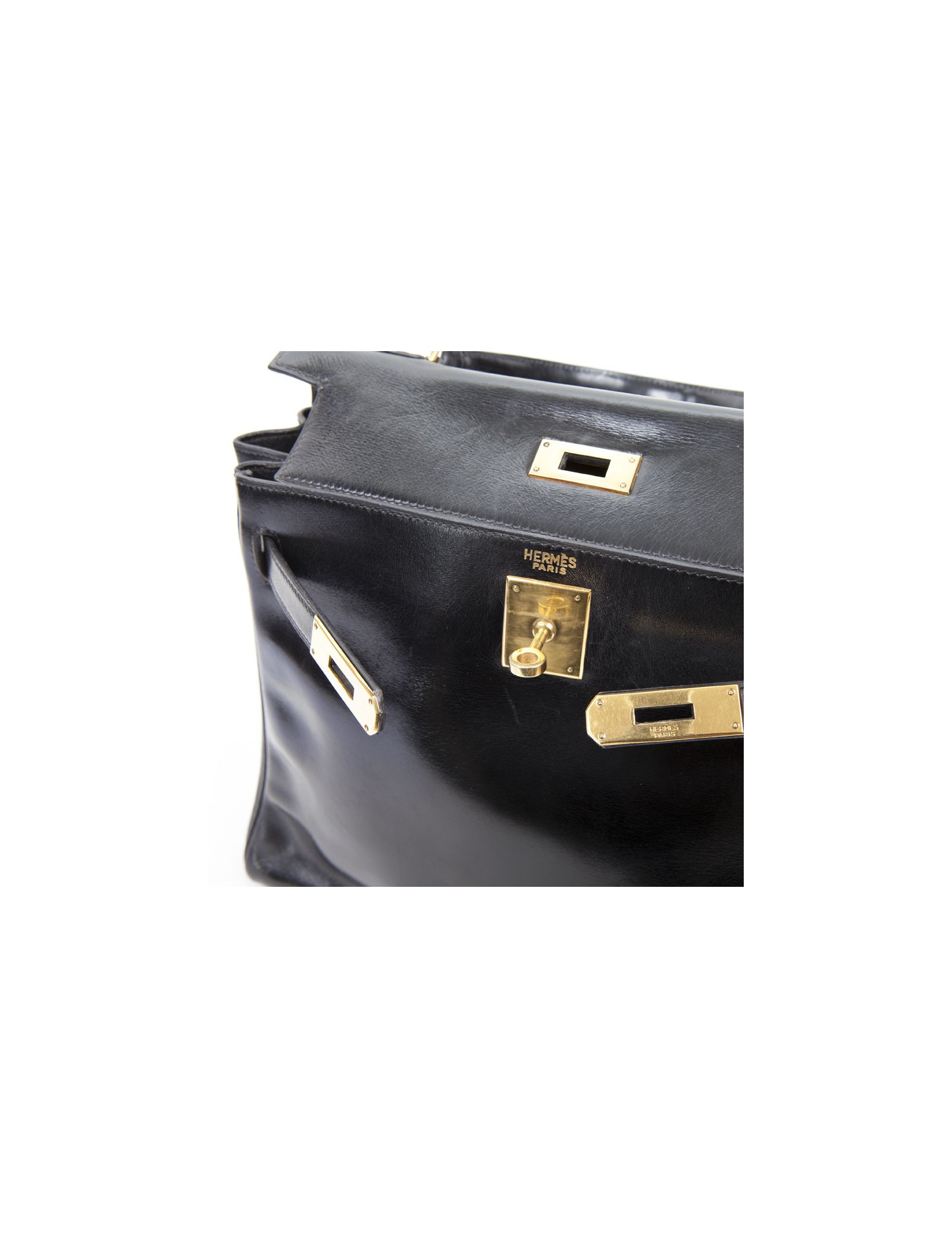 Rare! Bag 'Kelly 28' of Hermès leather black box. The jewelry is plated gold. The Interior is black leather with 3 plated pockets. Letter B in a round. State vintage. The corners are not damaged. The Cove, the zipper and Bell have been changed.