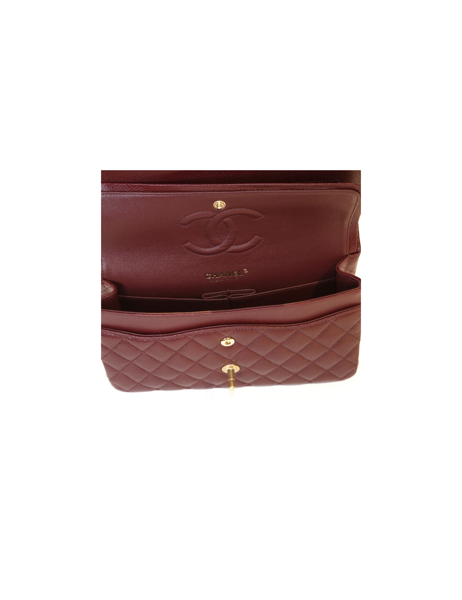 A classic! Bag Timeless from the House of Chanel bordeaux caviar quilted leather. The jewelry is matte gold metal. Clasp 'CC'. Double flap. Inside, 3 plated pockets and rear 1 Pocket plated. Hologram: 2159... and authenticity card. In excellent condition, worn once.