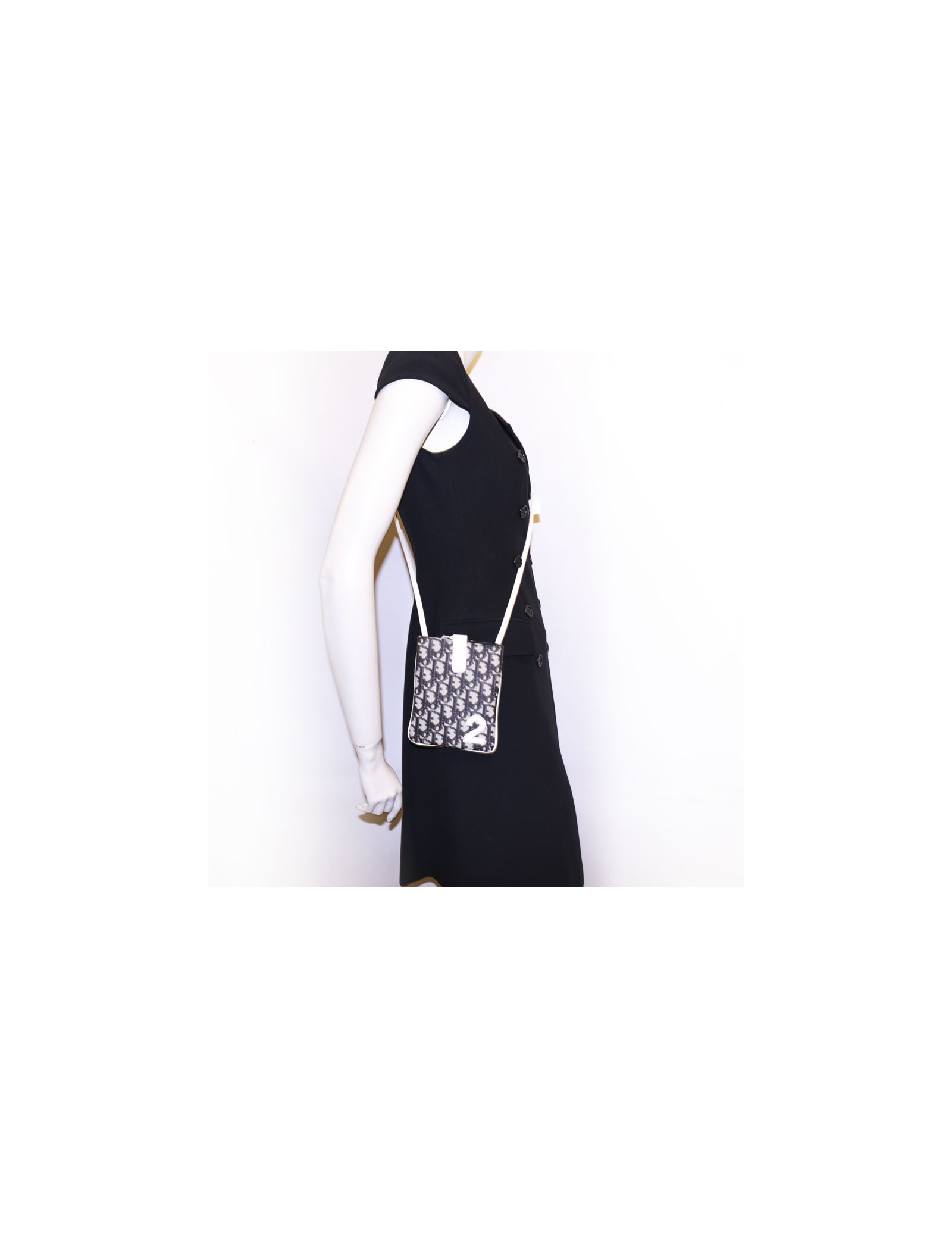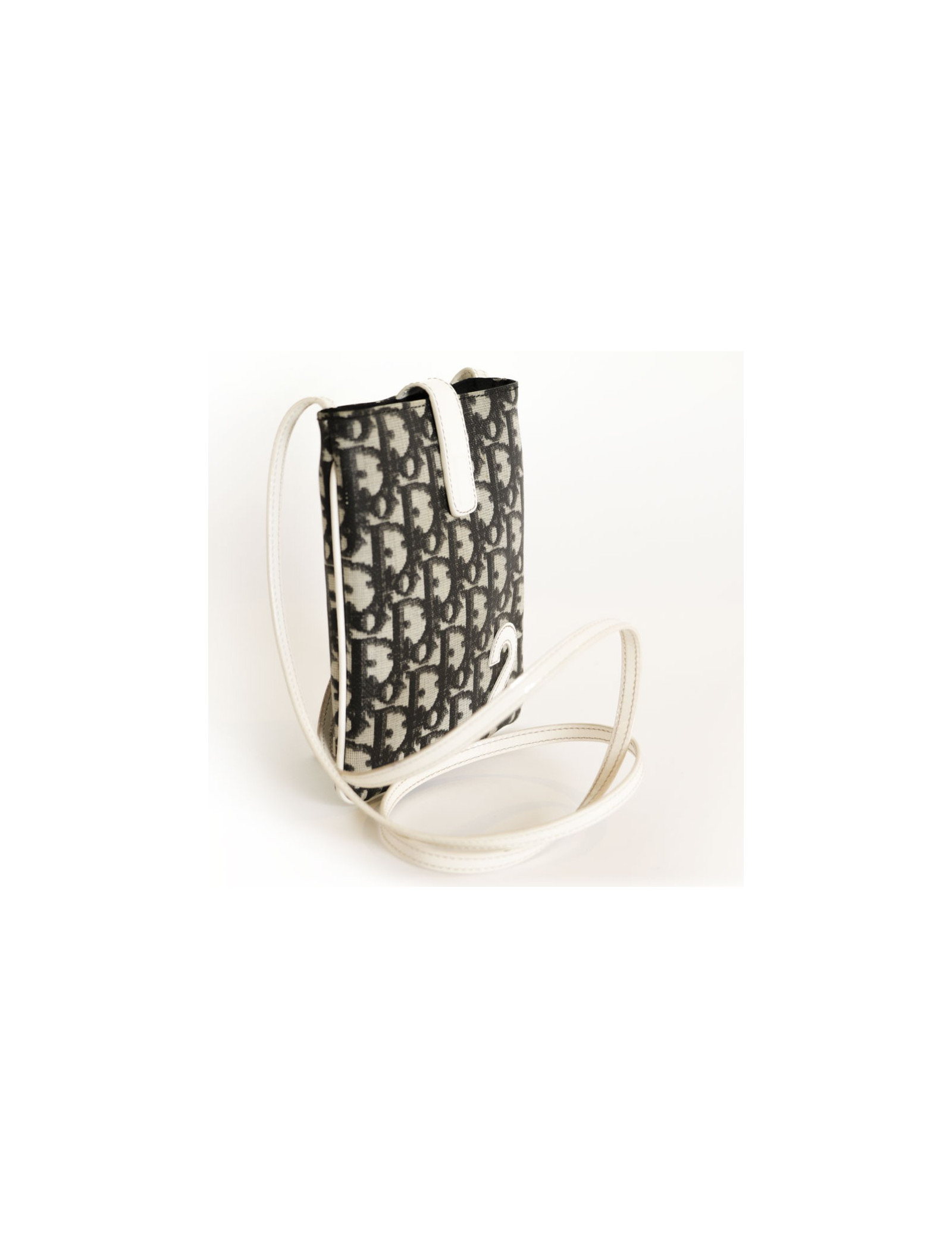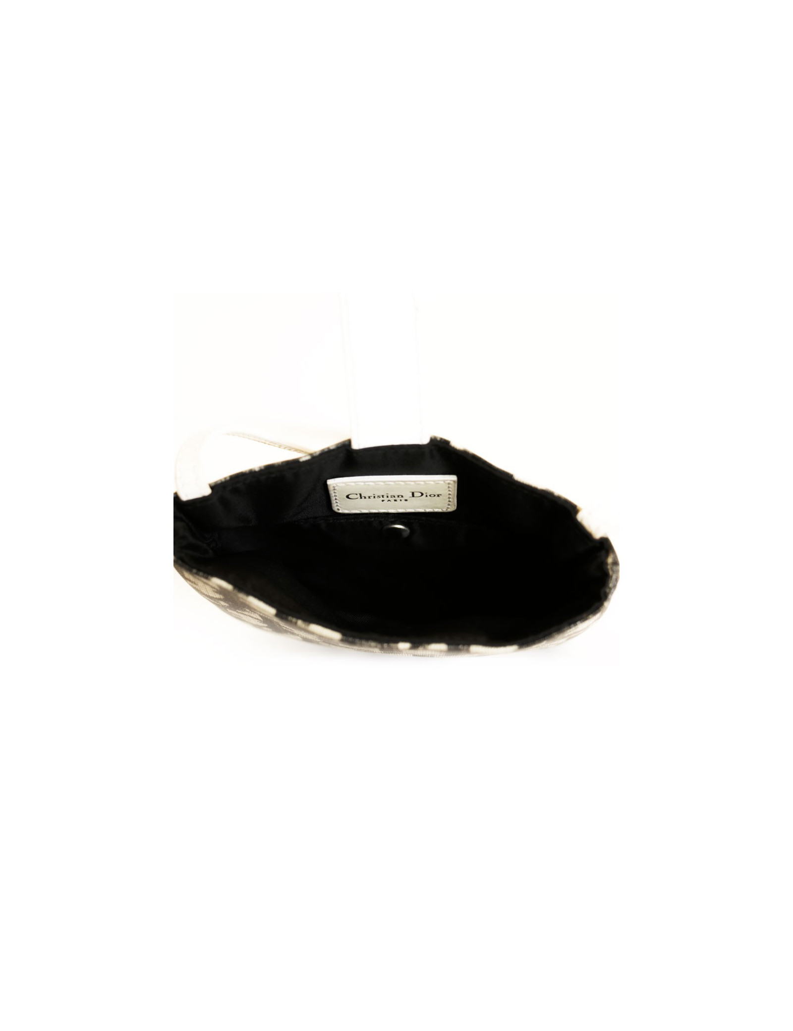 Dior monogram canvas pouch, vintage. serial number BM-0012. The lining is black fabric with an inner pocket. The Cove and the clasp (closes by one love) is white patent leather...