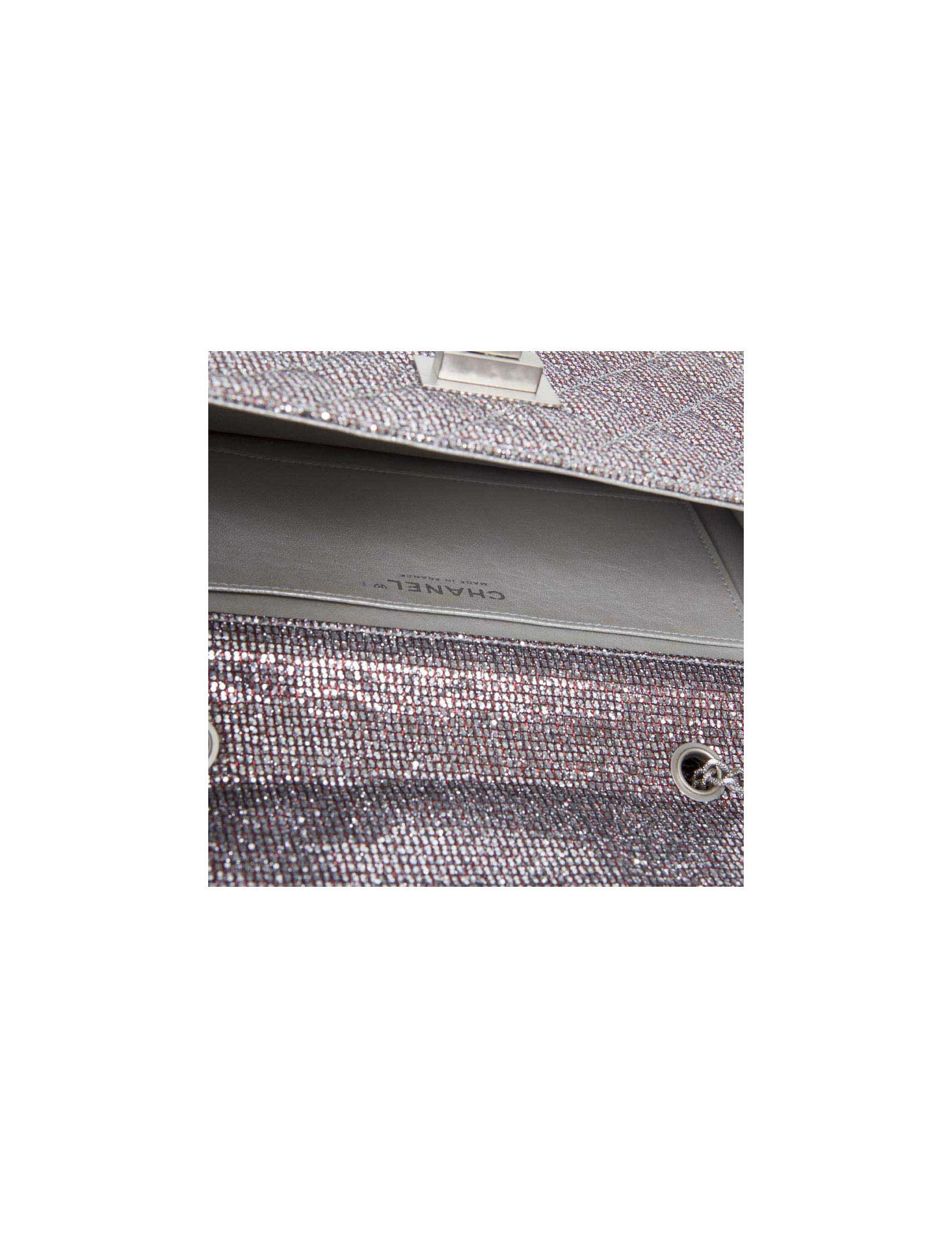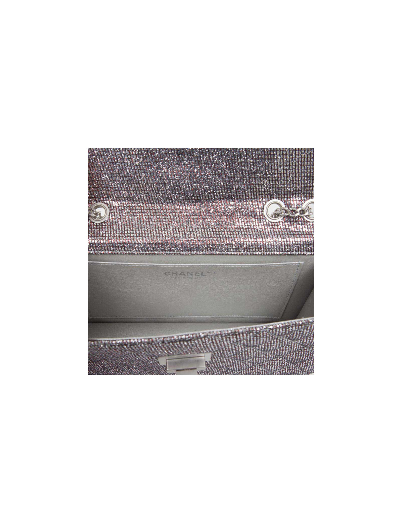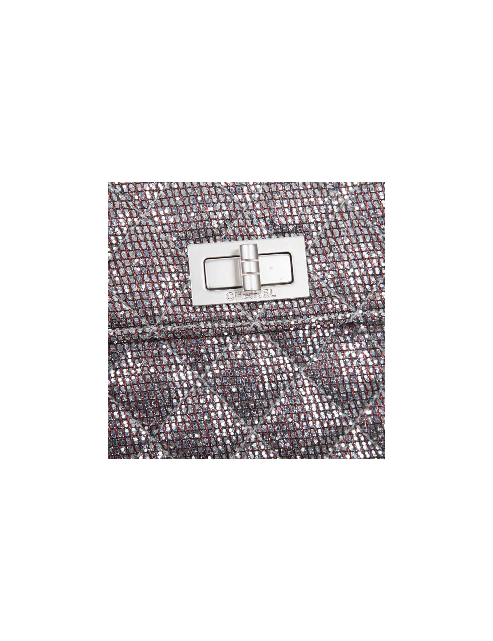 Lovely bag of the night of the House of Chanel, padded and glittery red and silver. The jewelry is silver. Clasp 2.55. The Interior is grey leather. Hologram: 1576... No authenticity card. Small spot at the bottom of the bag. In very good condition.