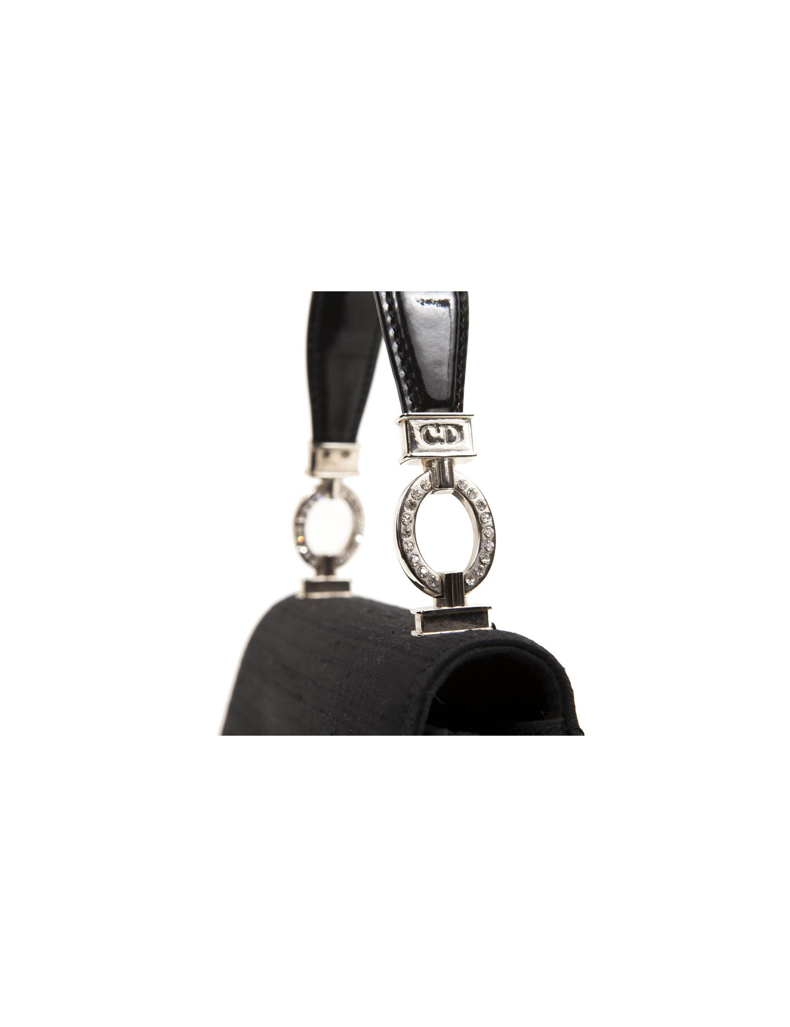 Lovely evening bag Christian Dior, wild silk black with a Cove Black patent leather, like CD, silver metal and shiny.