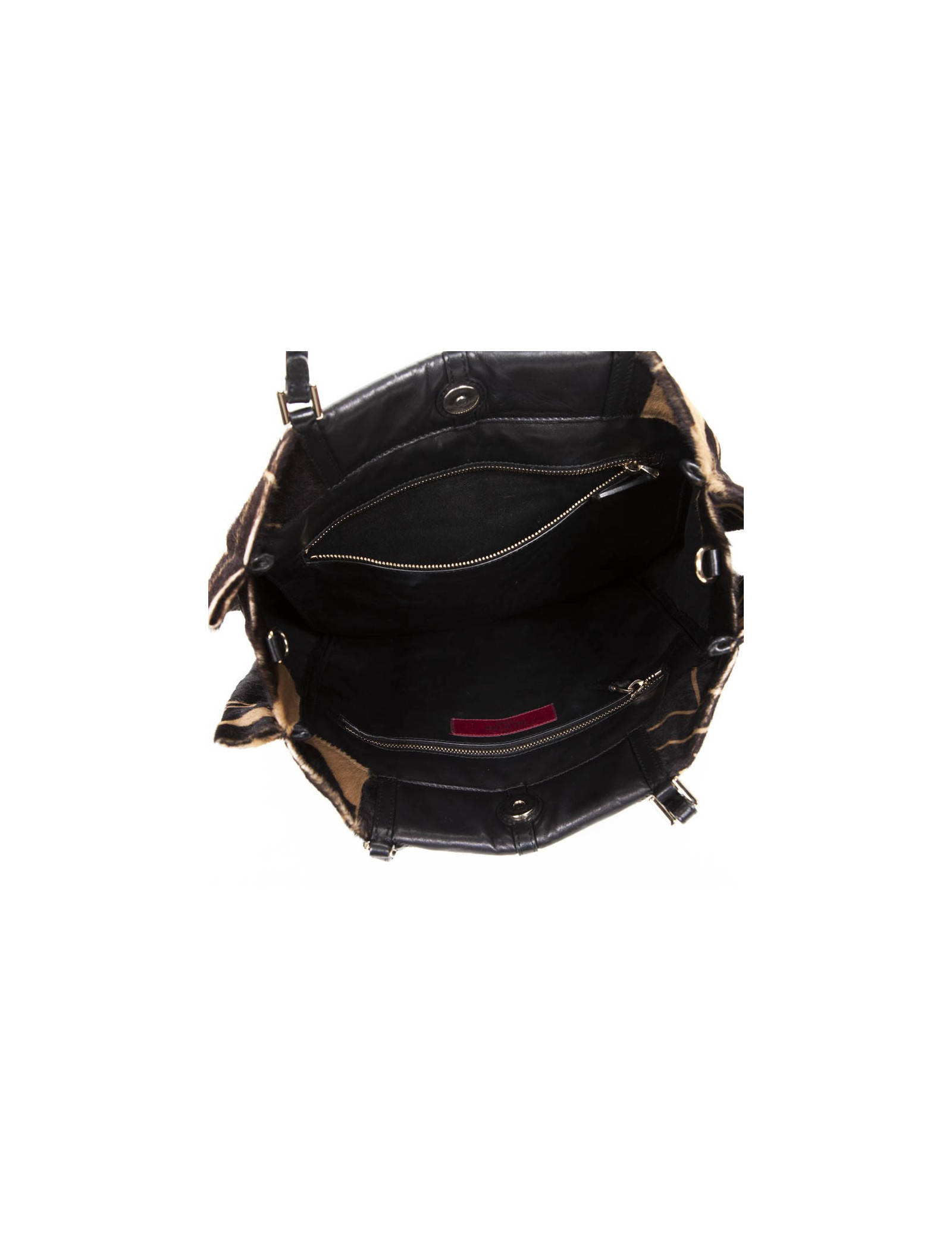 The lining is in black textile and the two zipped pockets are in black leather.