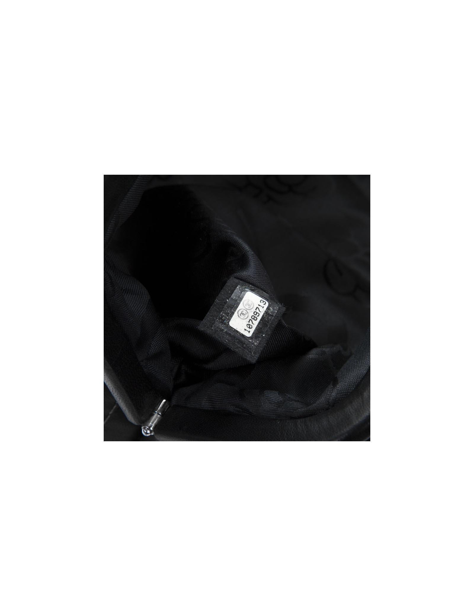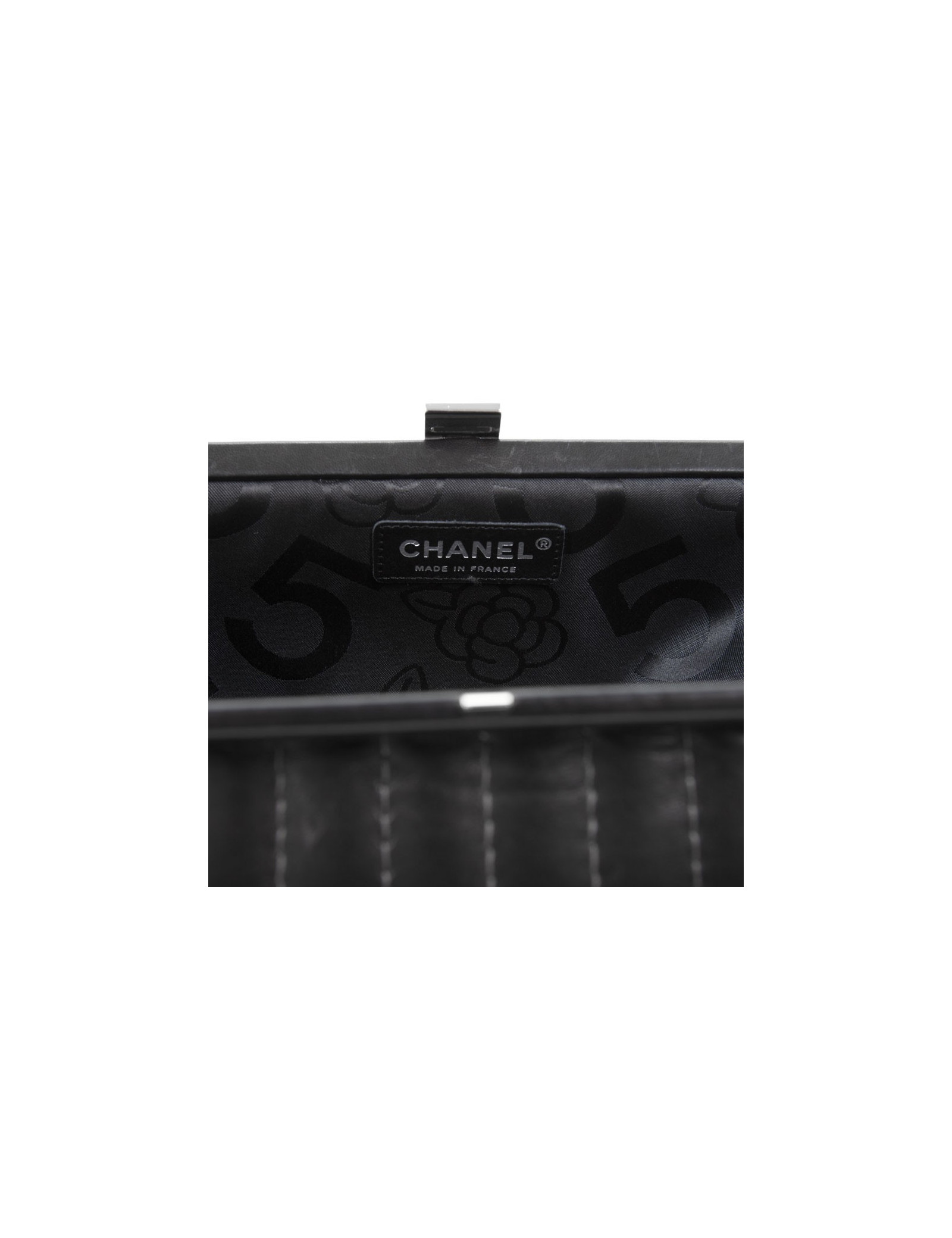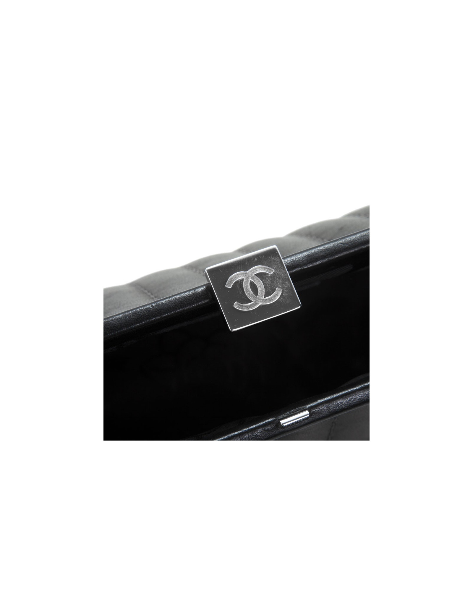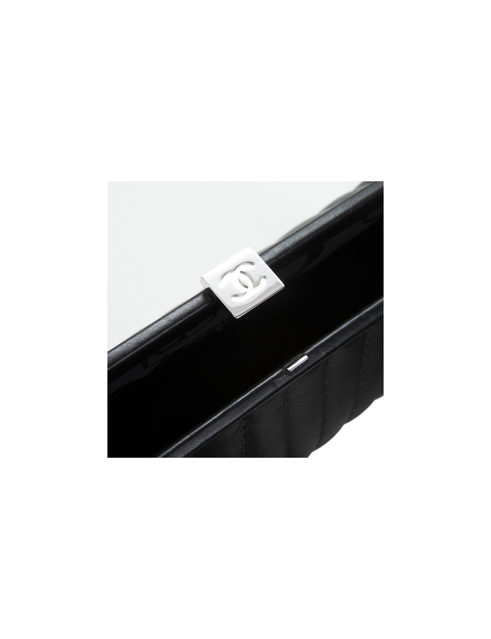 The House of Chanel's black smooth lamb leather pouch. CC silver metal clasp. Grey topstitching. The Interior is black monogram satin. Hologram: 1070... In very good condition. Scope once.