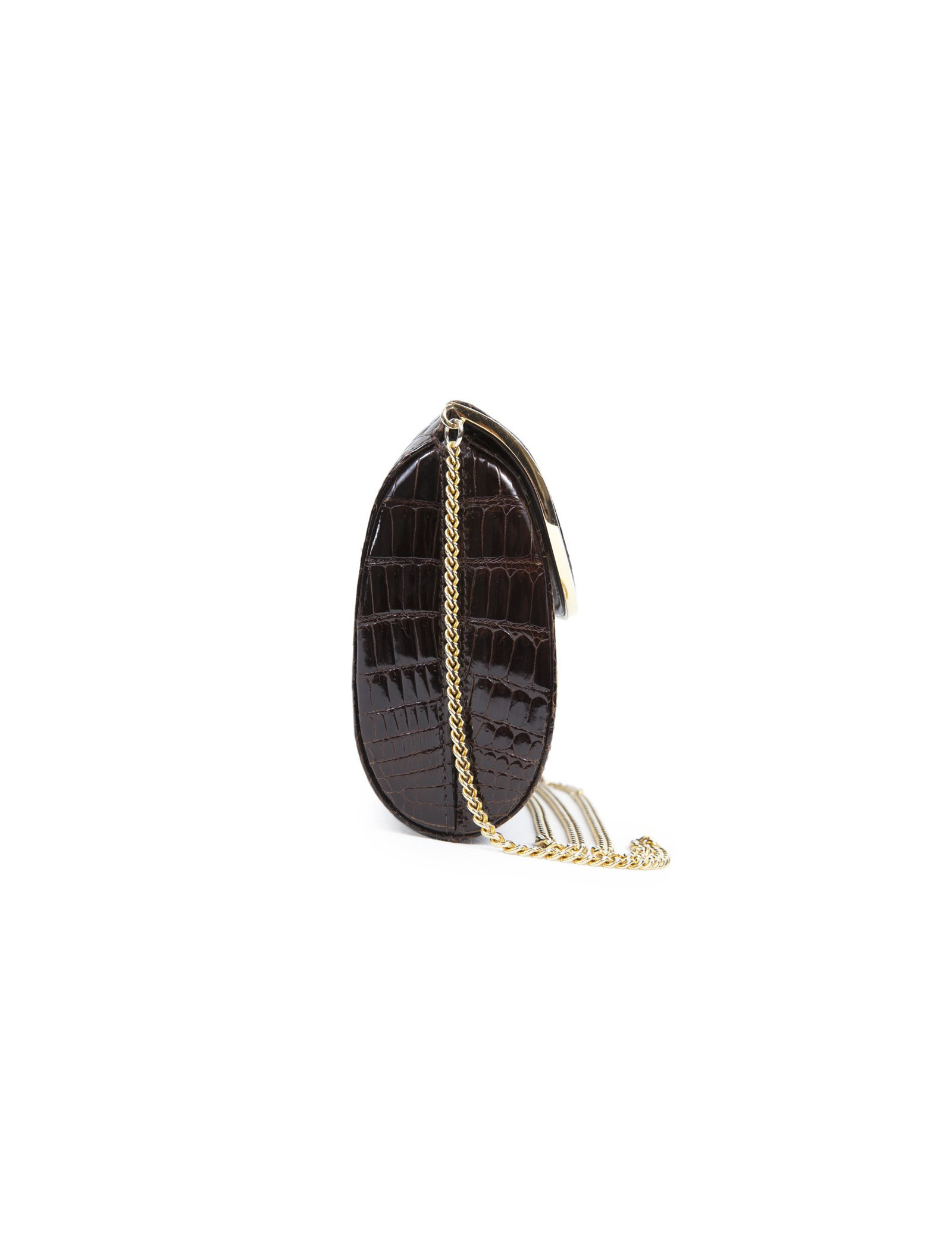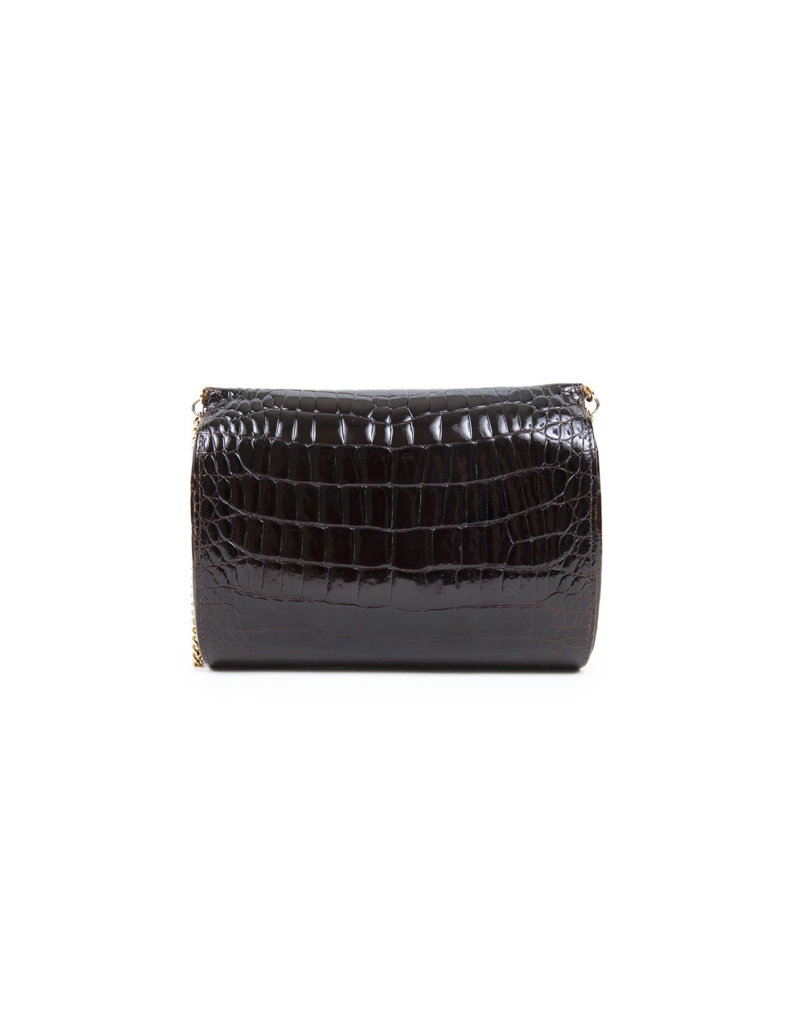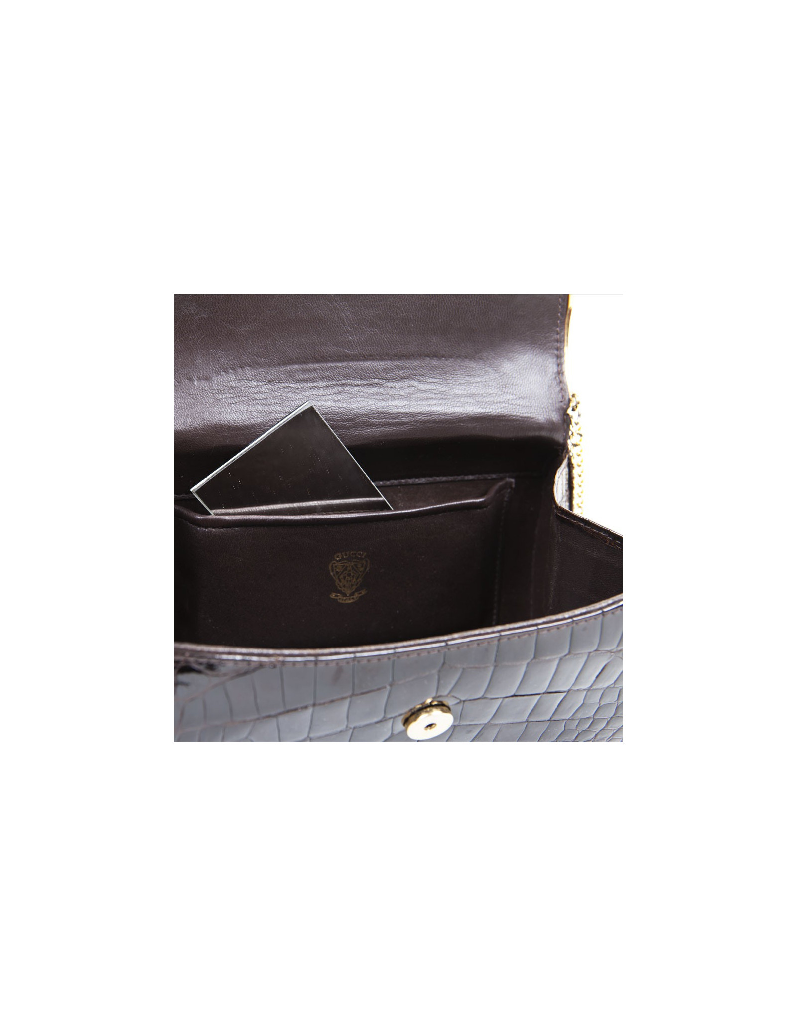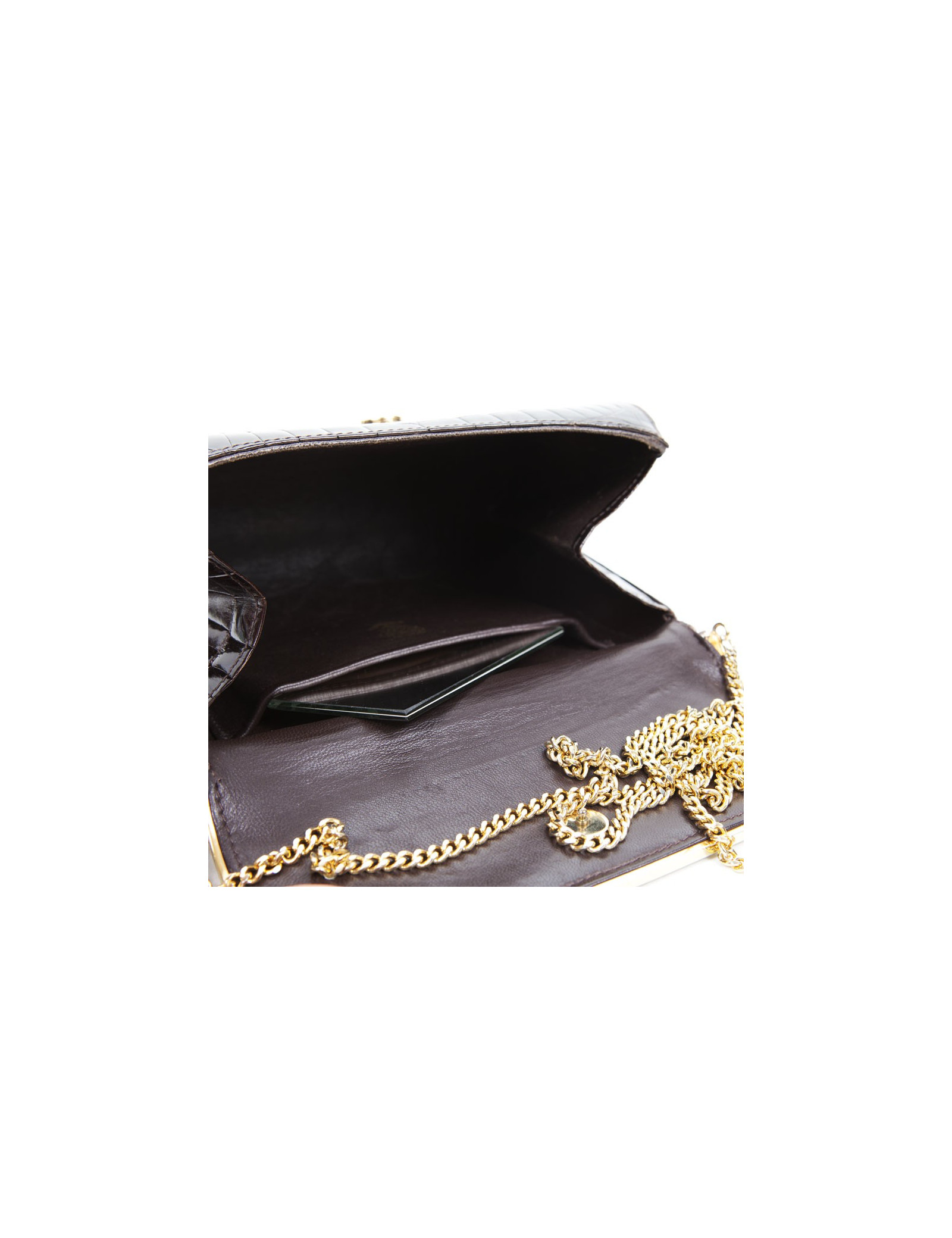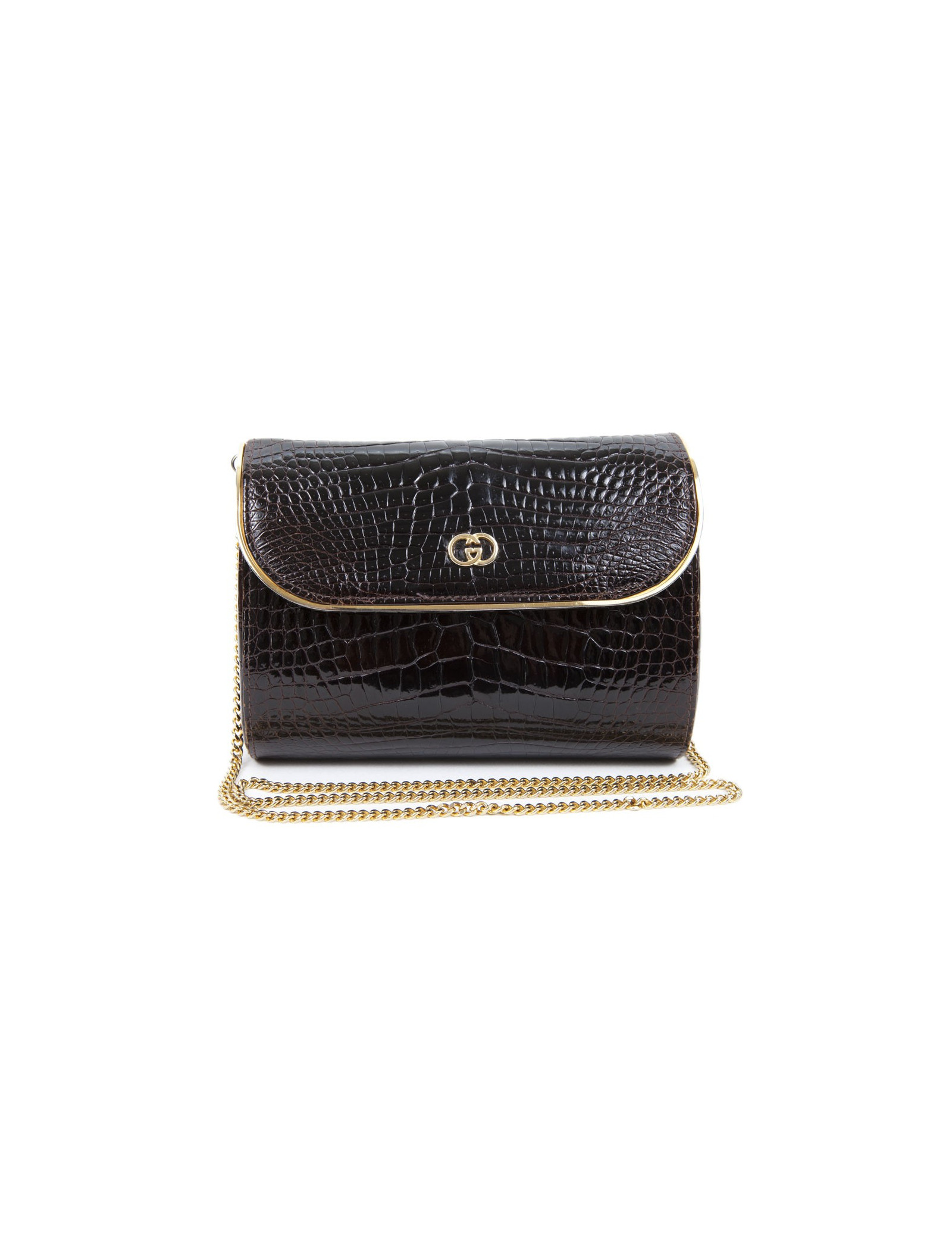 Vintage! Clutch in Brown crocodile of the House of Gucci. The jewelry is gold metal. Snap button closure. The Interior is brown leather with a small patch pocket. The shoulder strap is in golden chain. State vintage.