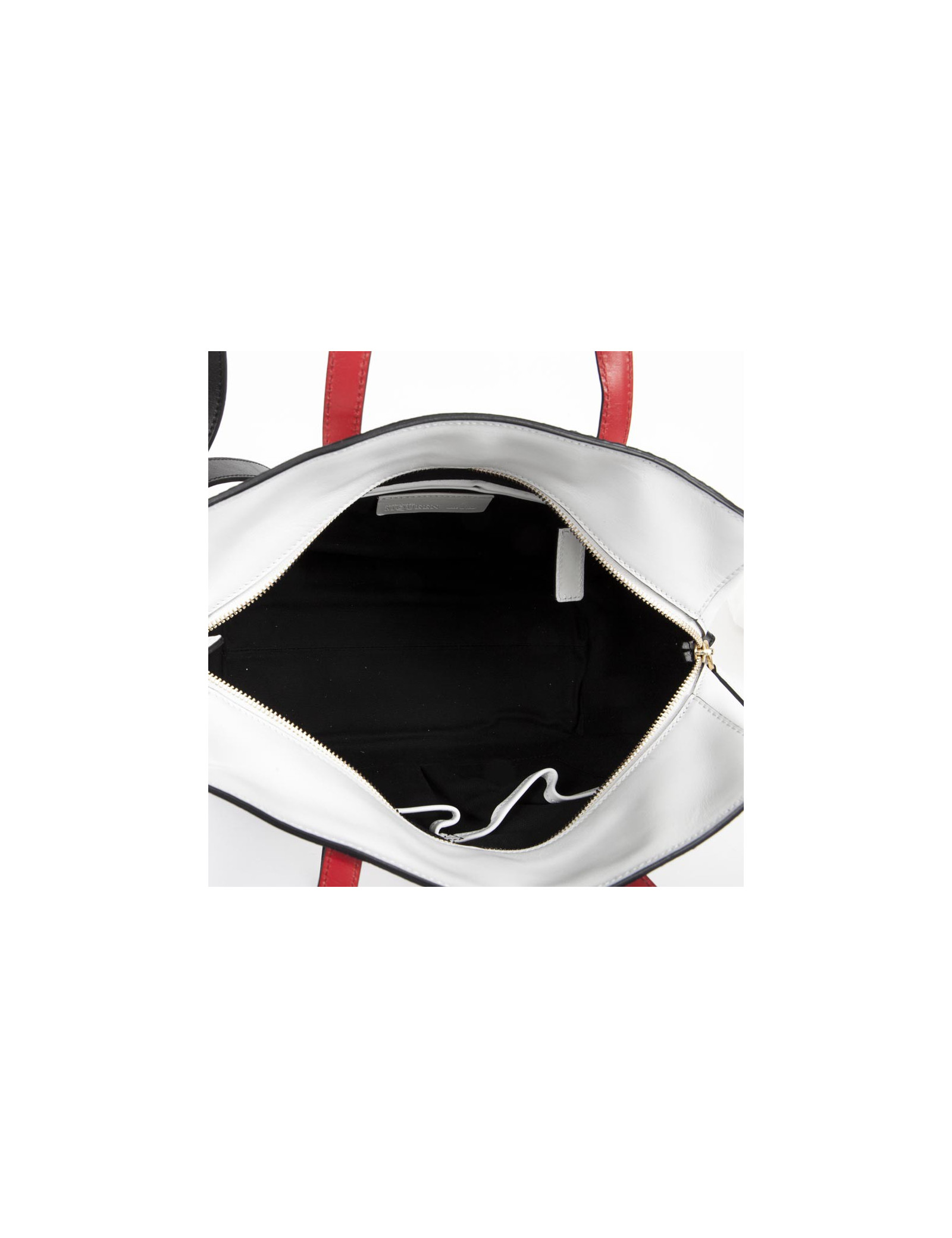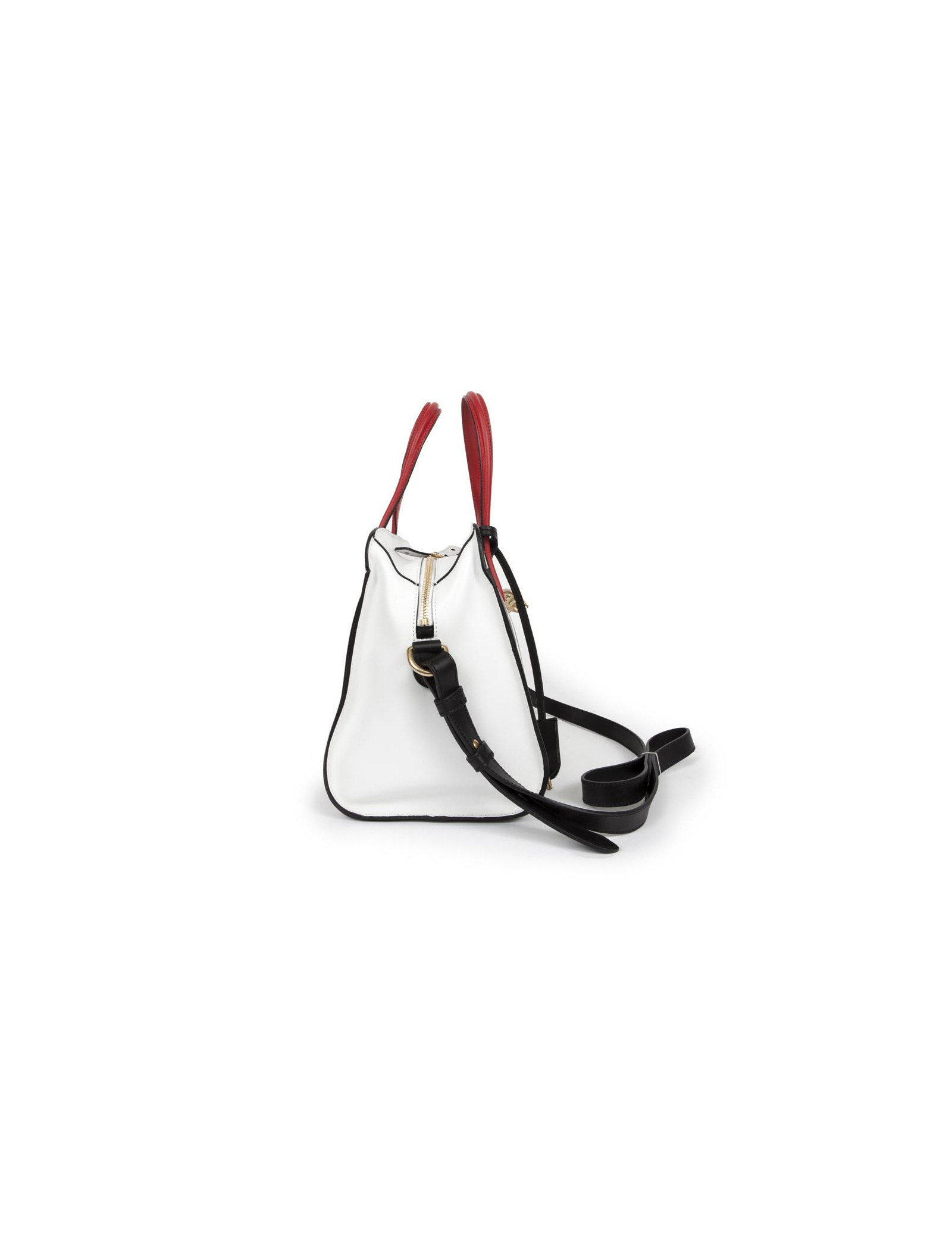 on the sides. The Red handles and sides white smooth leather. padlocks, keys, zipper, Tinker Bell