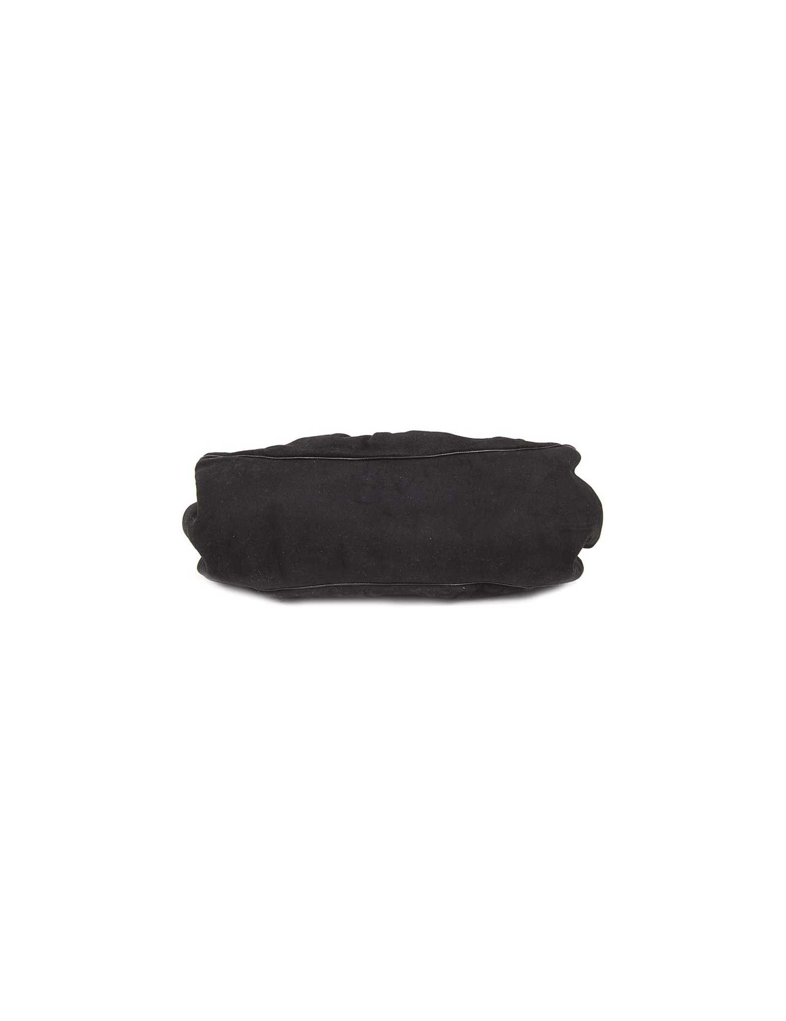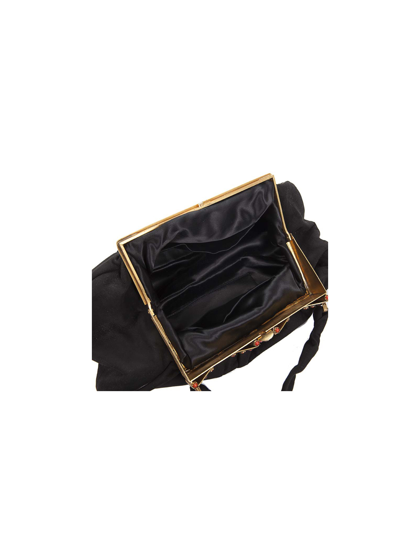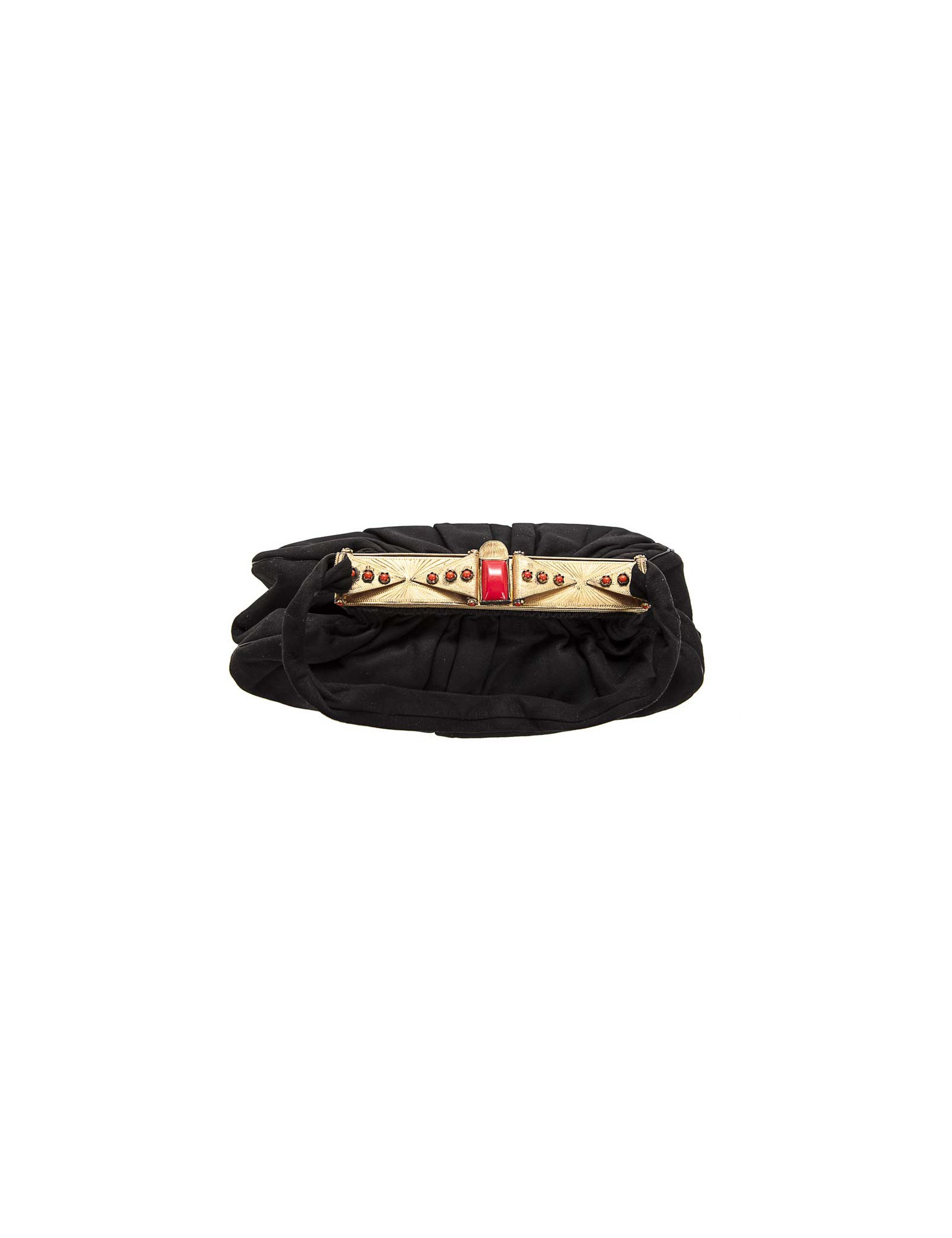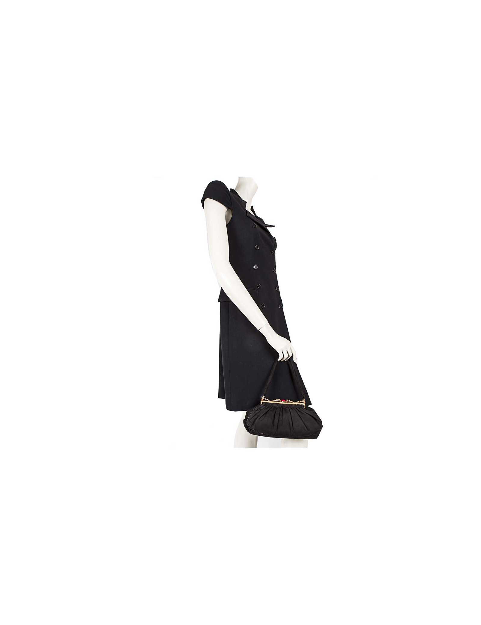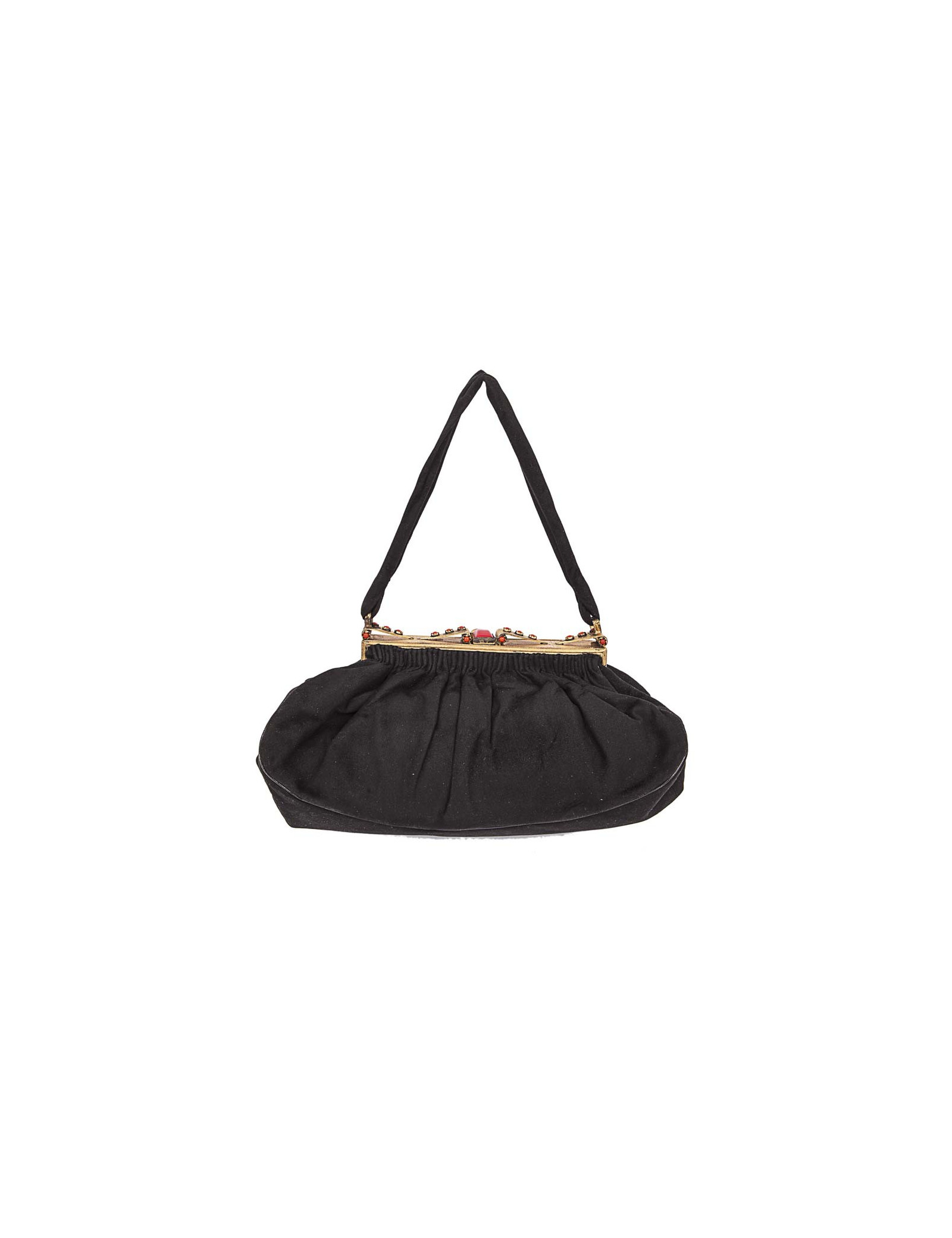 Vintage! Bag in Black Suede from the 1940s. Carried in the hand or arm. Clasp in gold metal and ornamental red and coral. The Interior is black satin with 2 plated pockets. In very good condition.