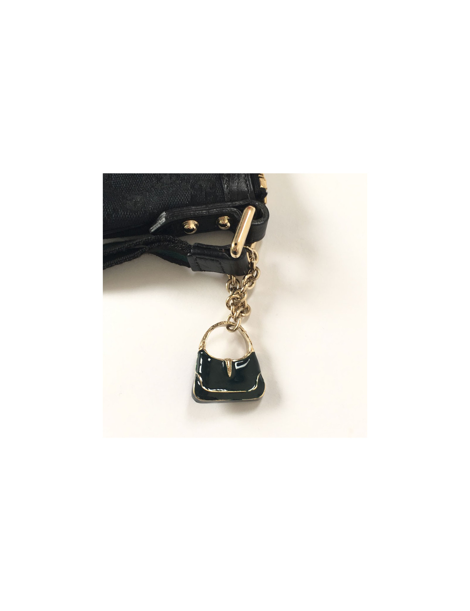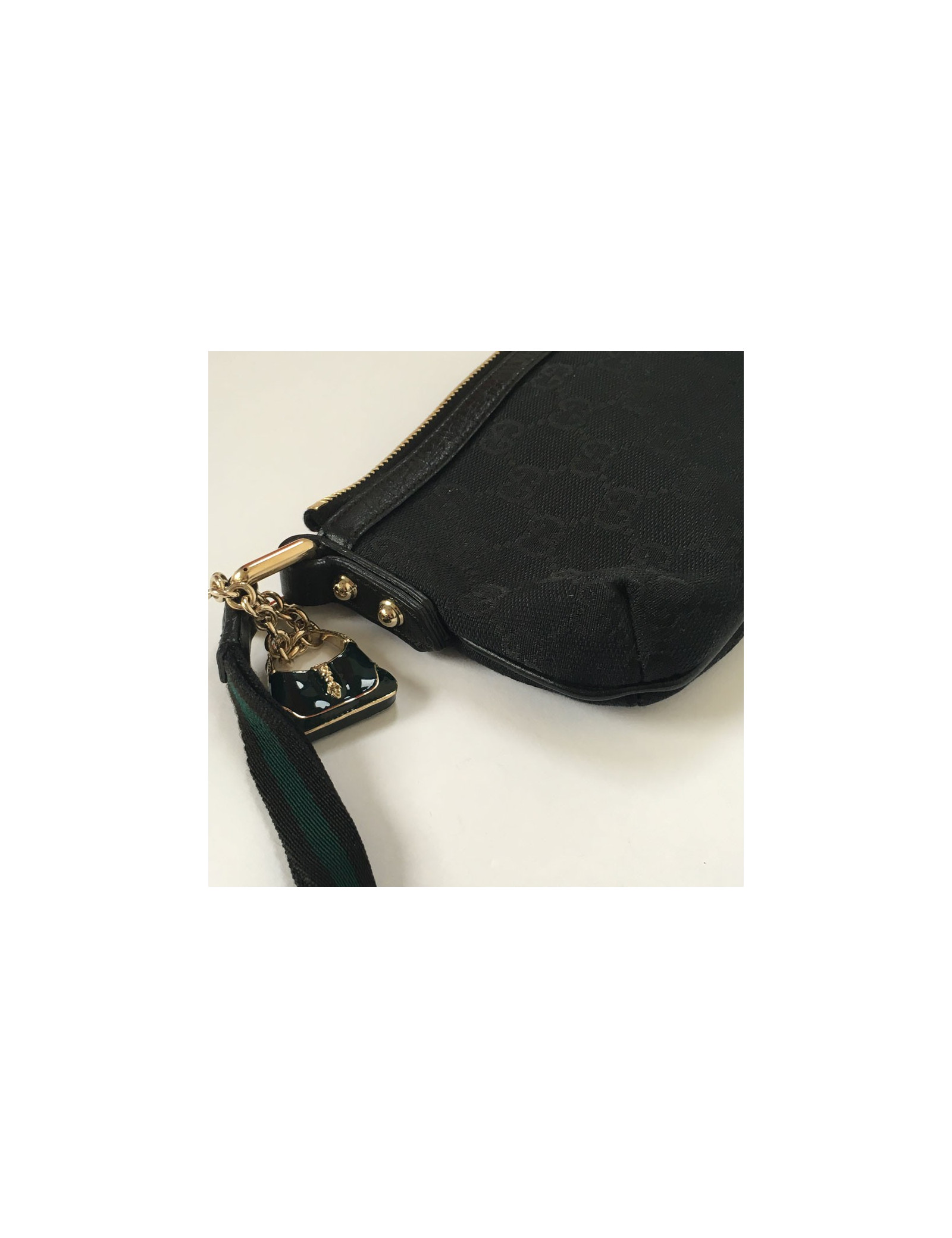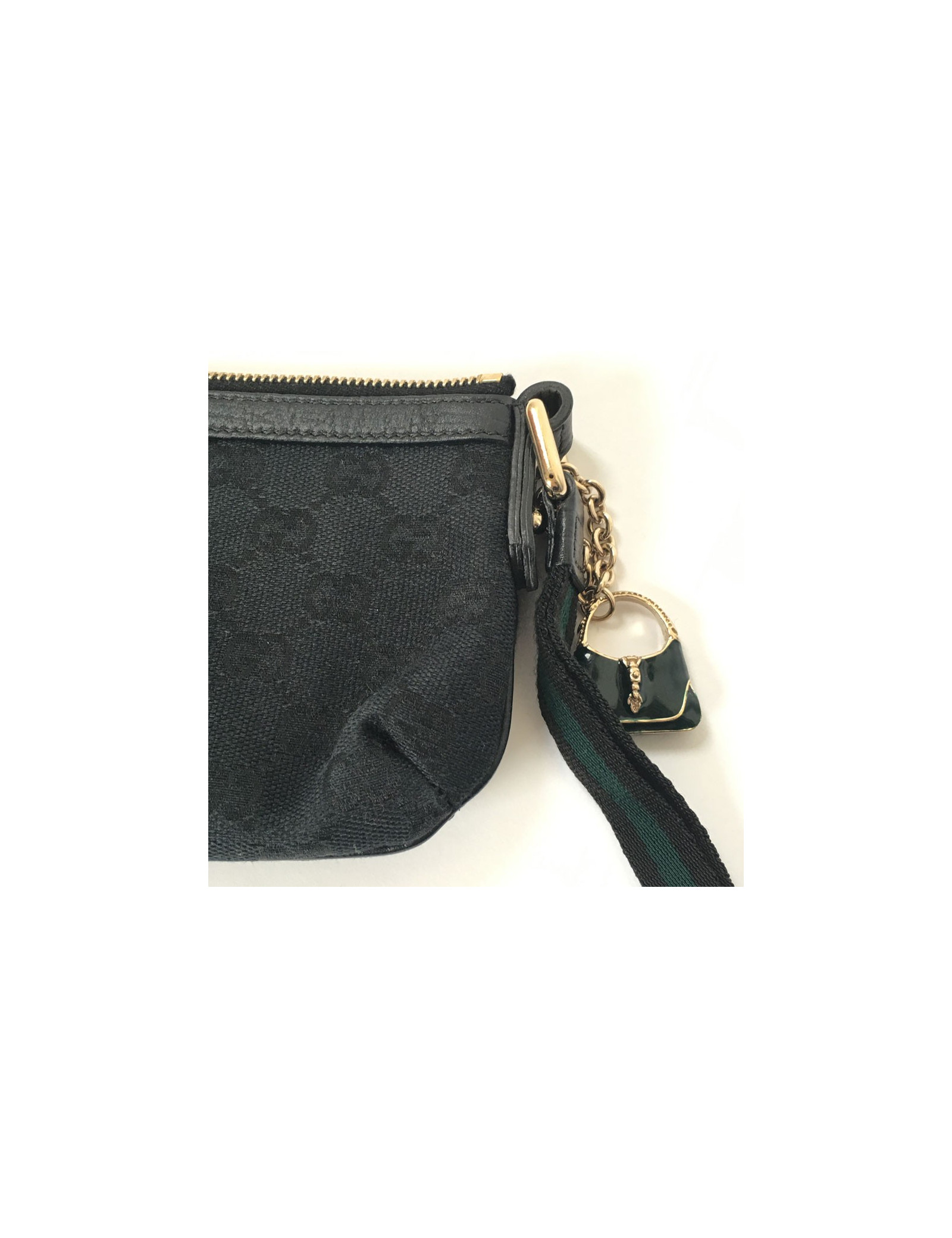 GUCCI wallet zip black monogram fabric. A charm "bag" metal color pale gold is attached to the zipper. Inside, black fabric, lies a small pocket. Small Cove for the wrist.