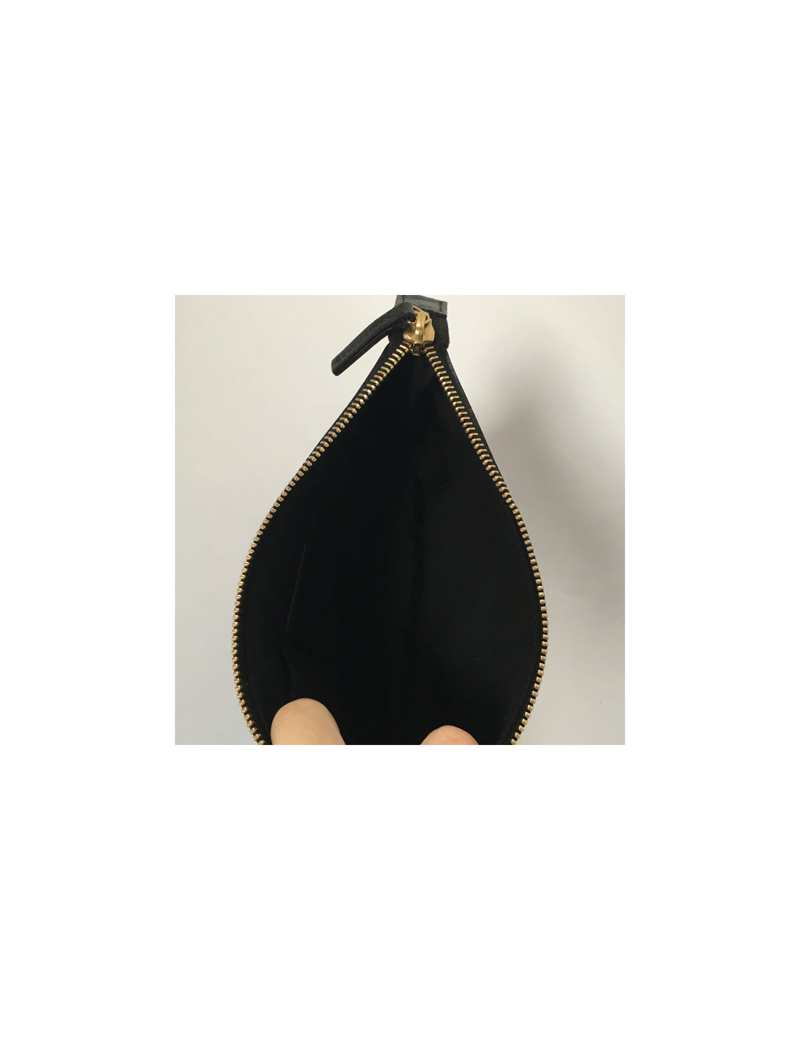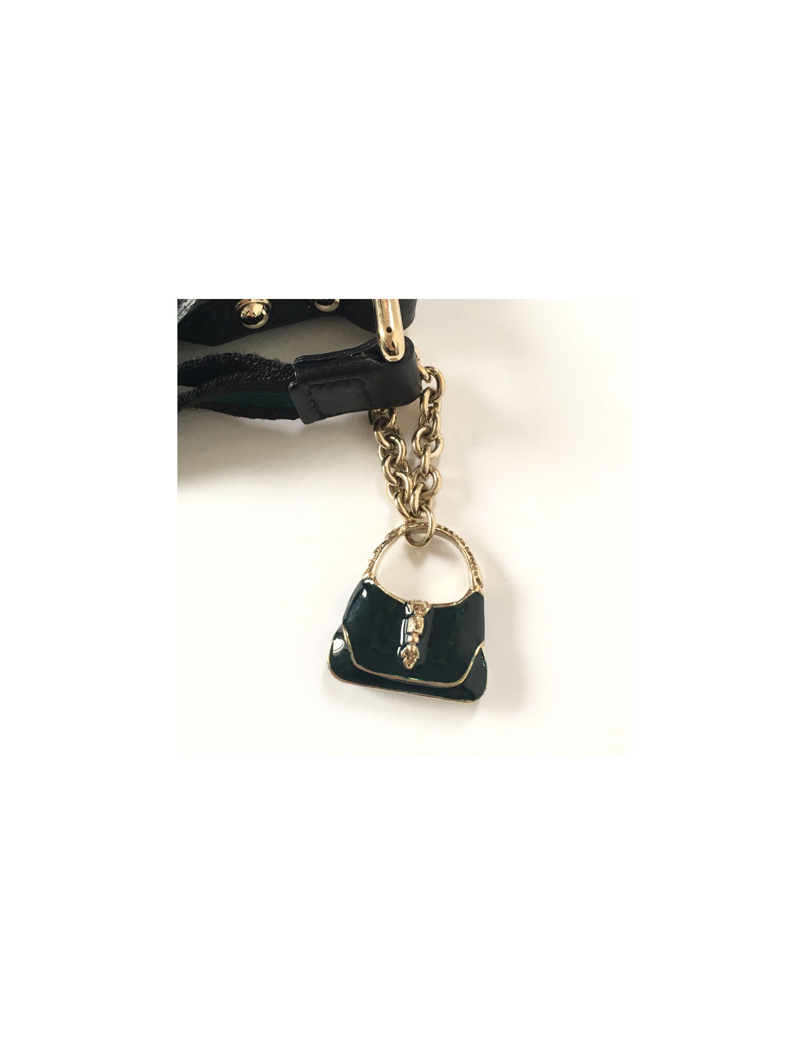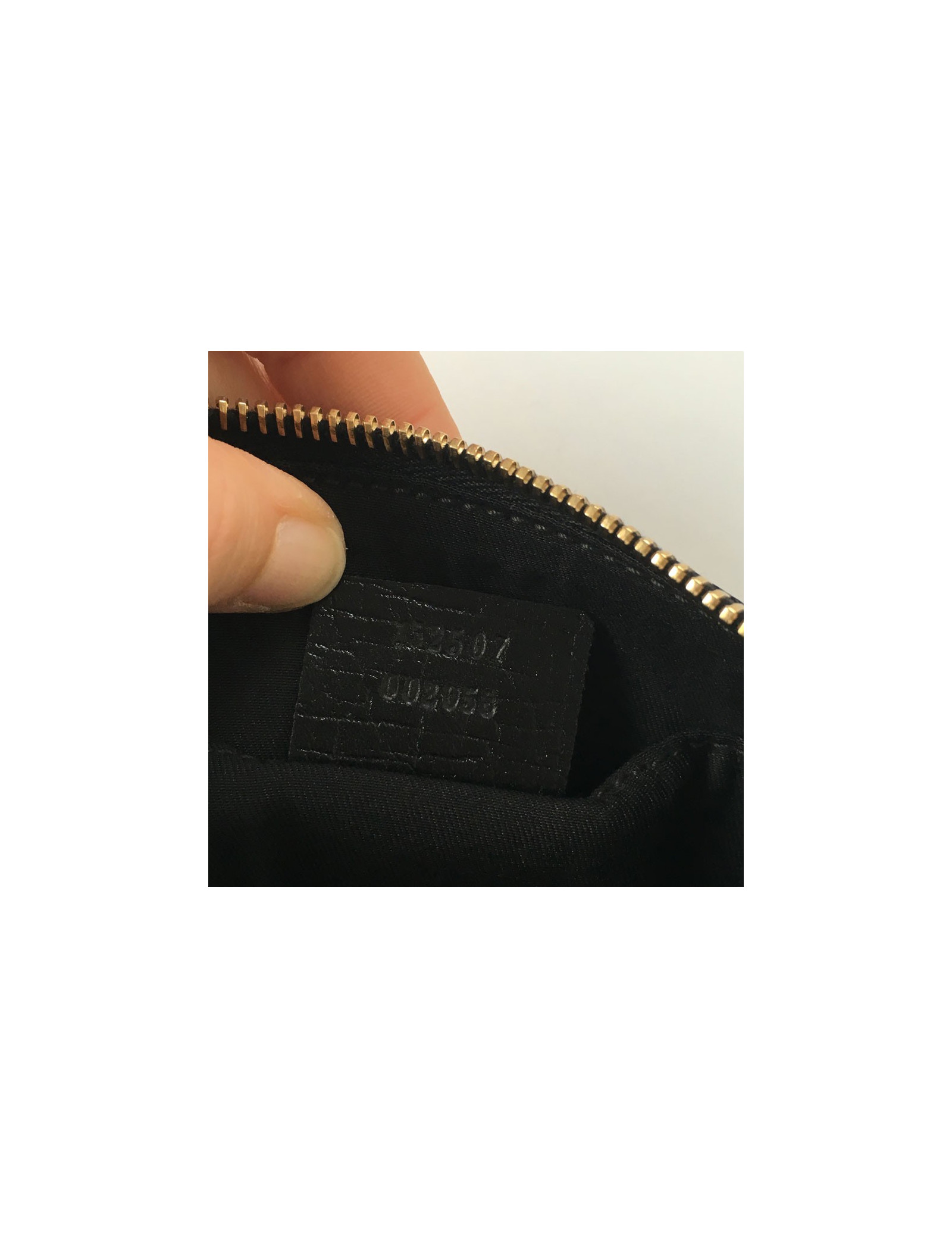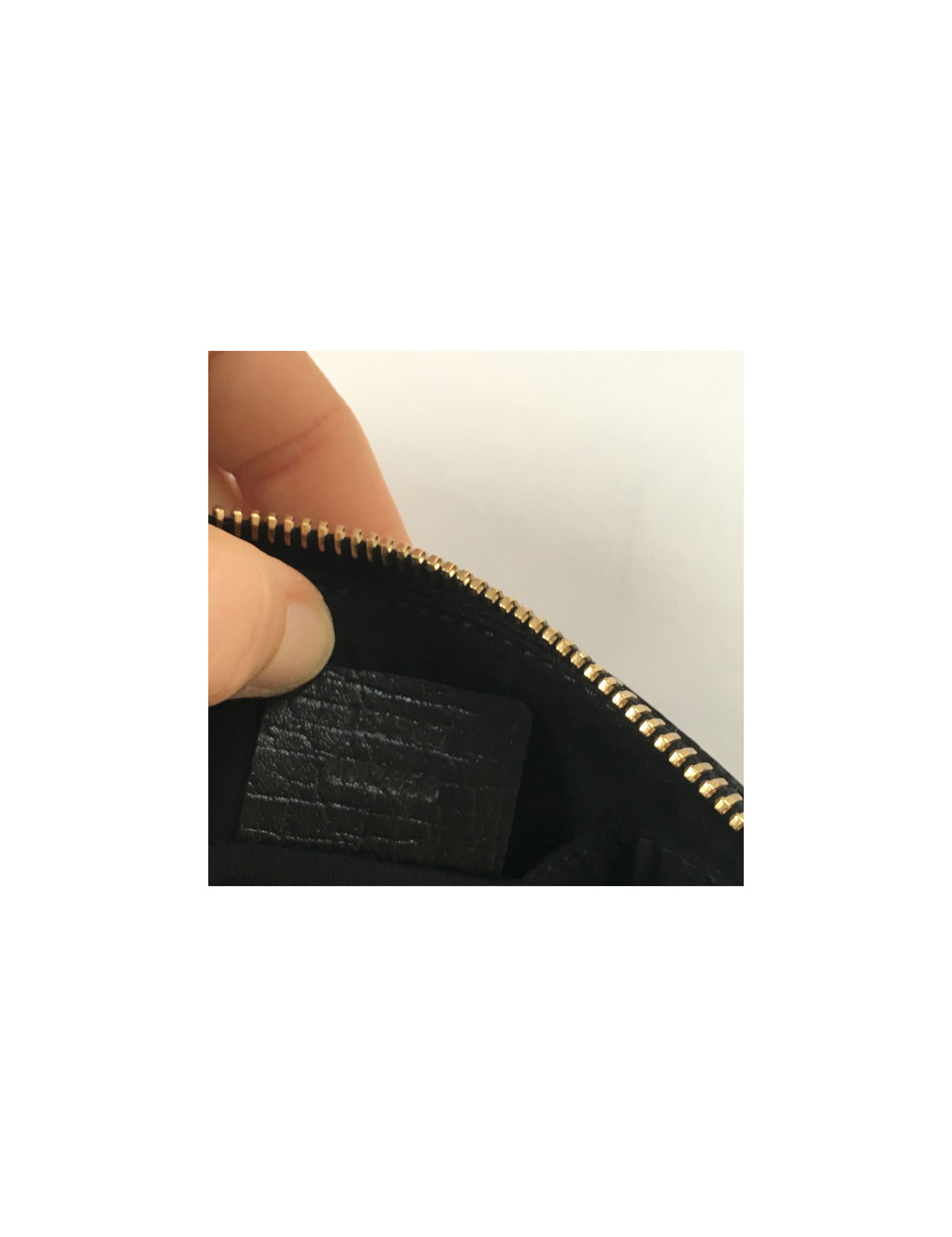 GUCCI wallet zip black monogram fabric. A charm "bag" metal color pale gold is attached to the zipper. Inside, black fabric, lies a small pocket. Small Cove for the wrist.
