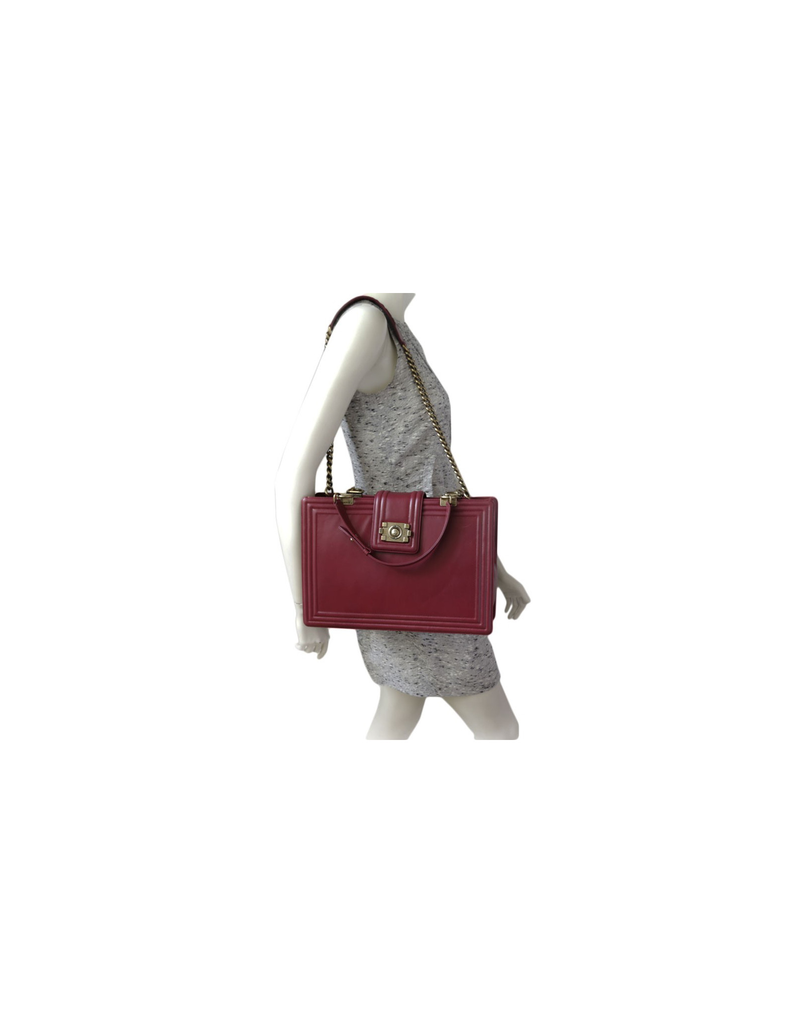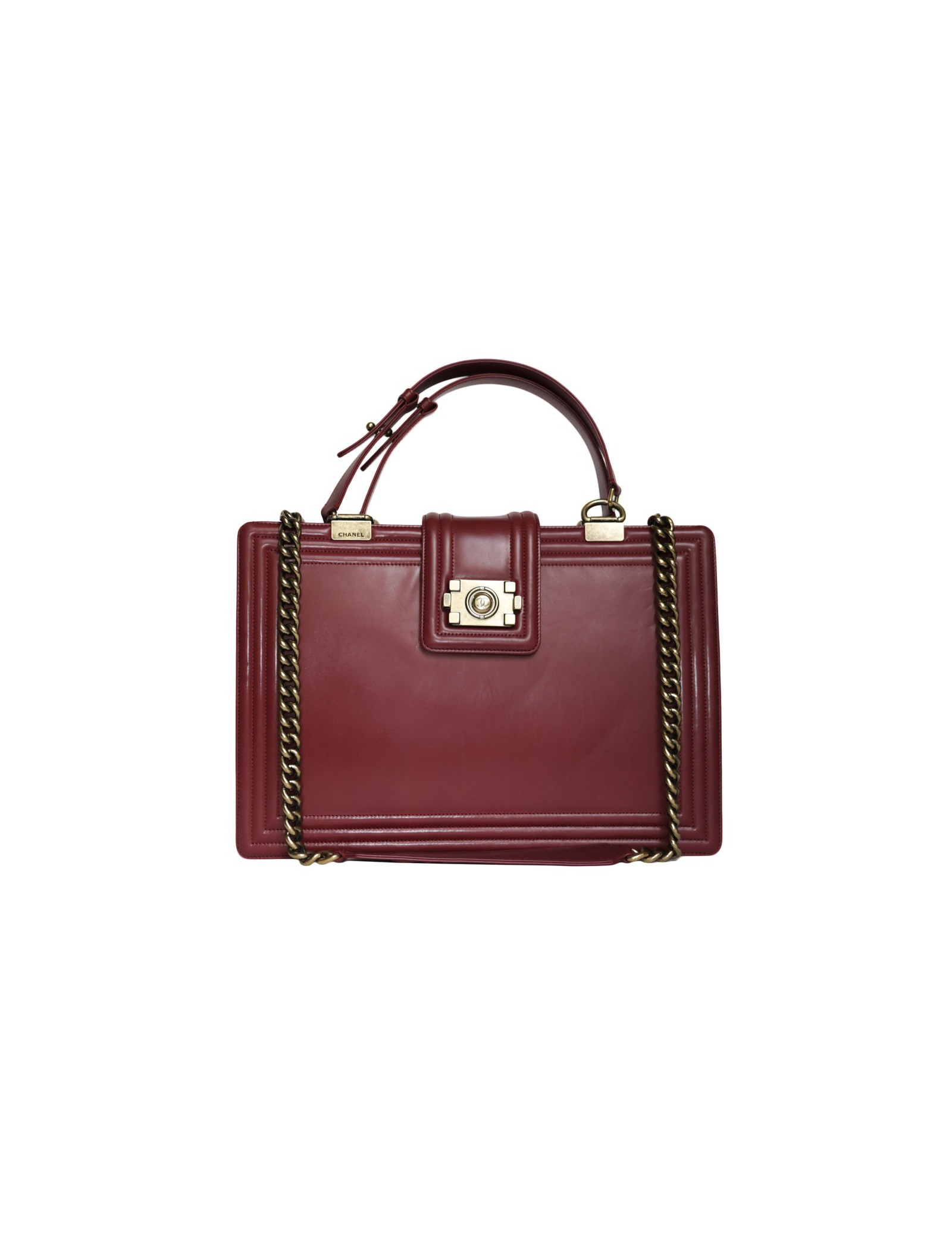 Bag Tote in Maroon smooth lambskin of the House of Chanel. Clasp "boy". The hardware is gold copper. Door by hand with two handles and shoulder with a strap. The Interior is in Brown canvas with 3 pockets including 1 zipped, 1 for smartphone and a plated.