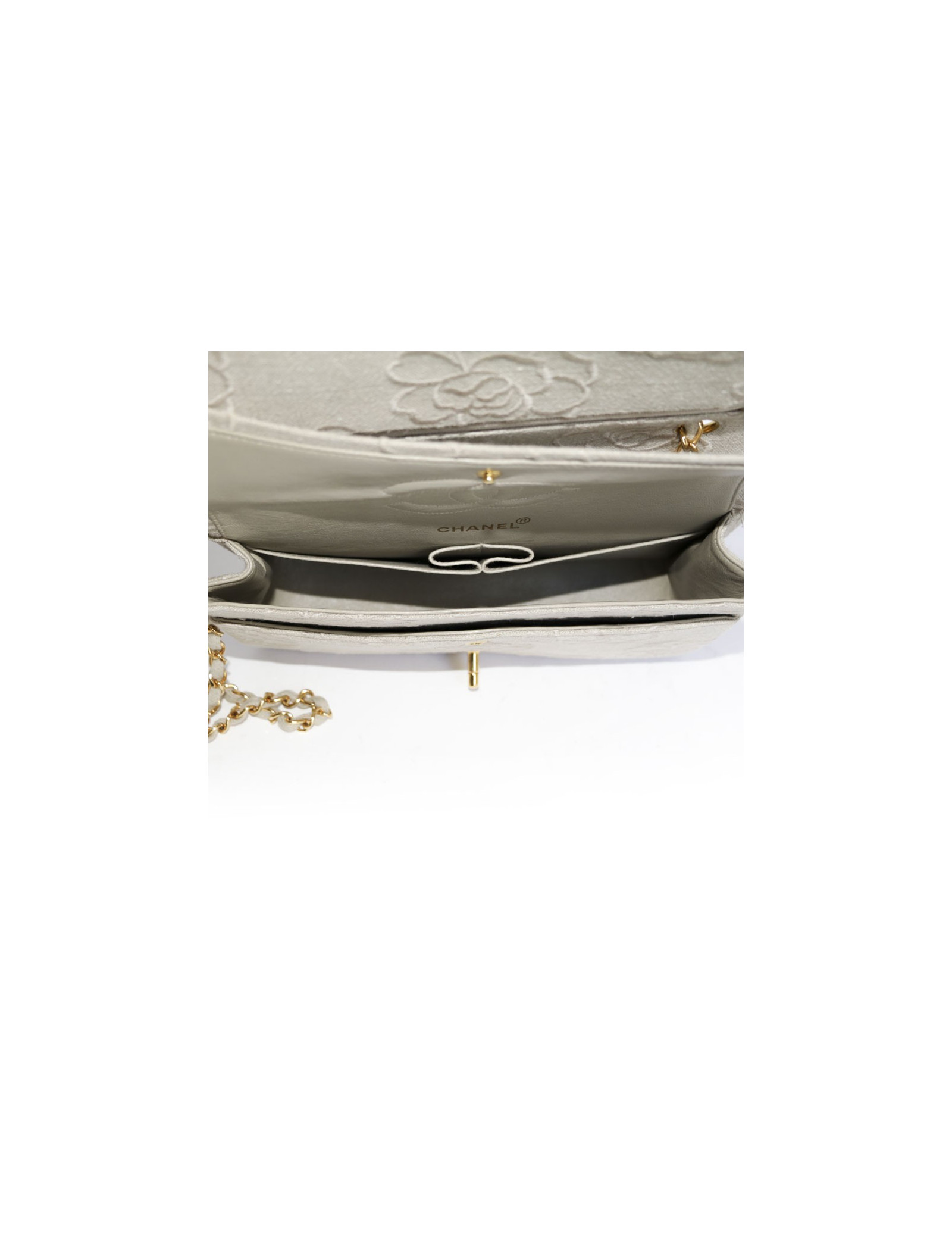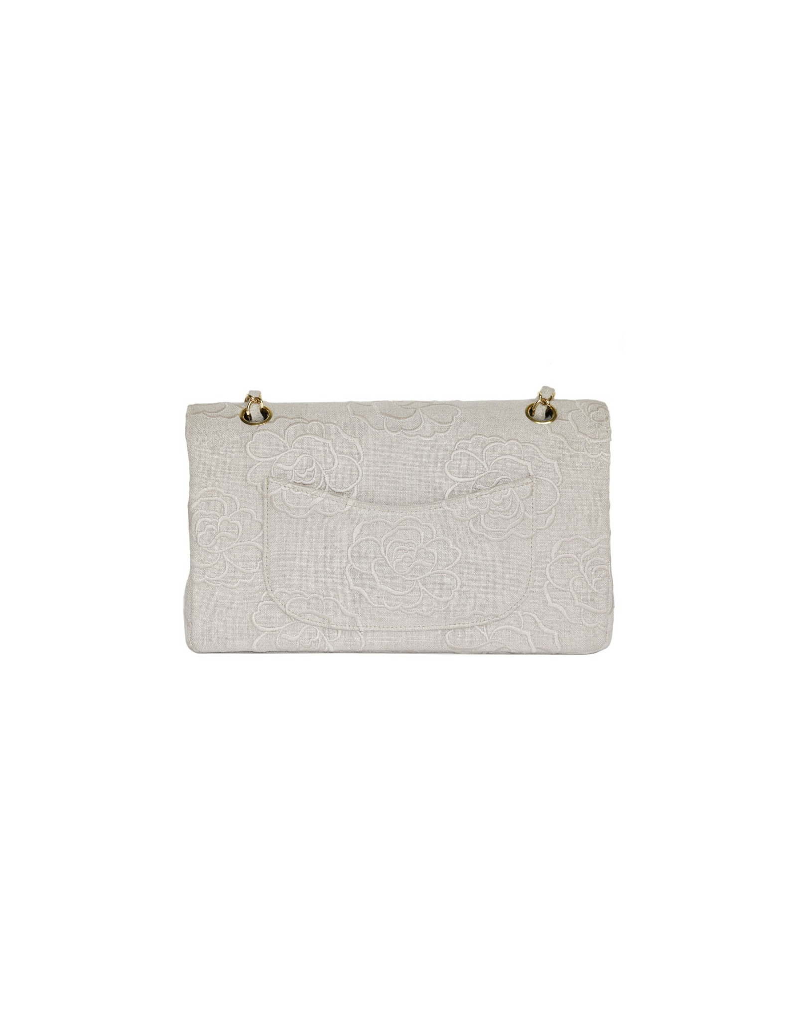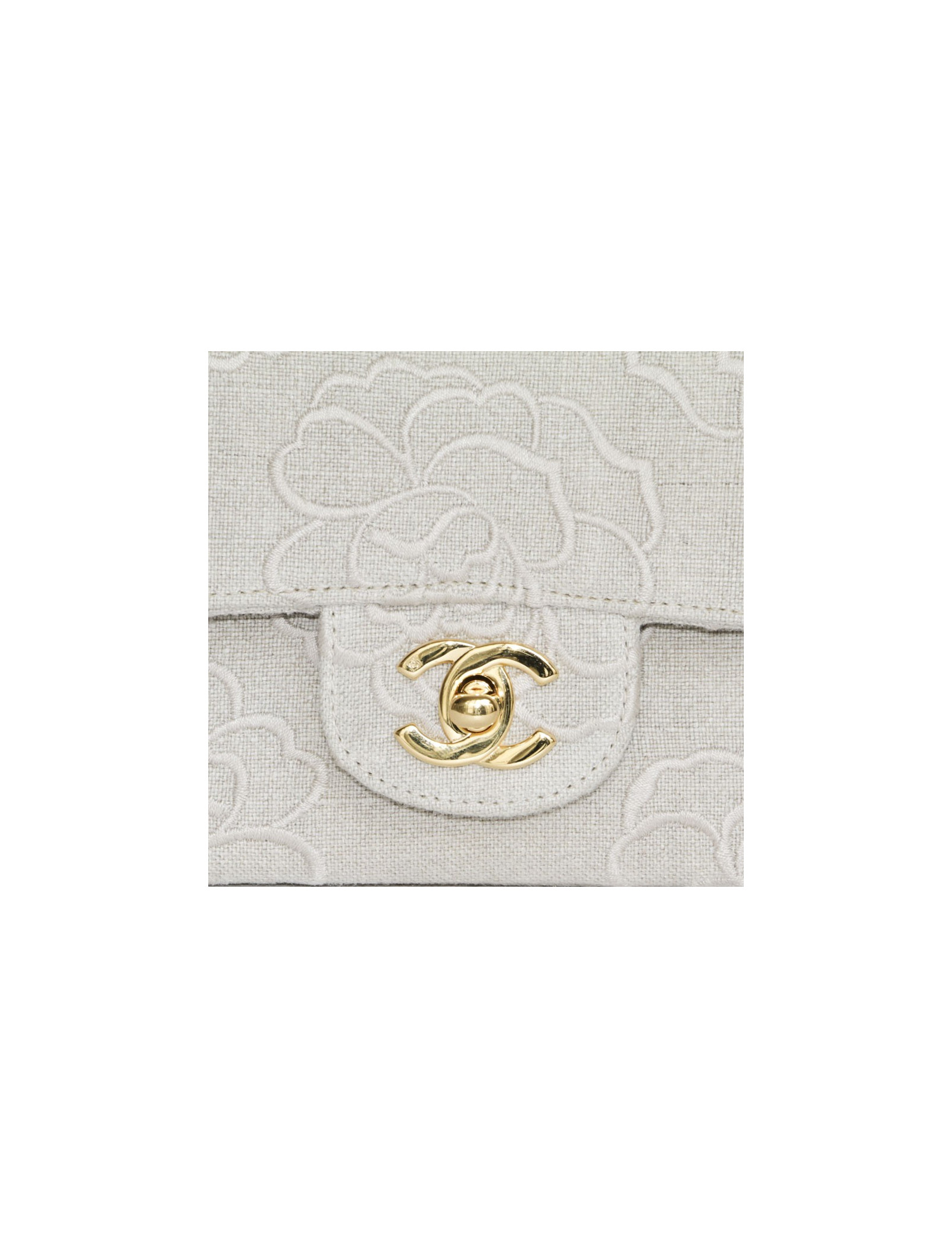 Bag 'Timeless' in Ecru canvas embroidered the House of Chanel Camellia. Clasp 'CC'. Golden jewelry. Double flap. The Interior is Ecru color with 3 plated pockets leather. Hologram: 5172... No authenticity card.