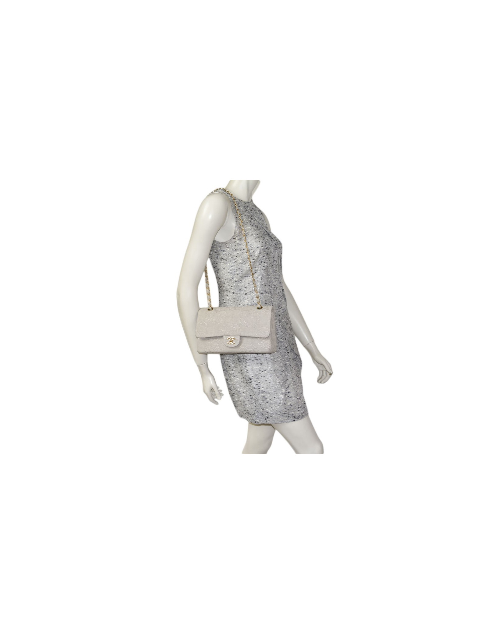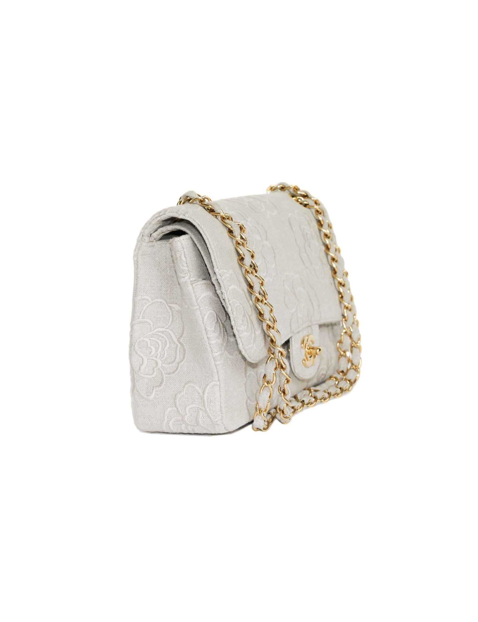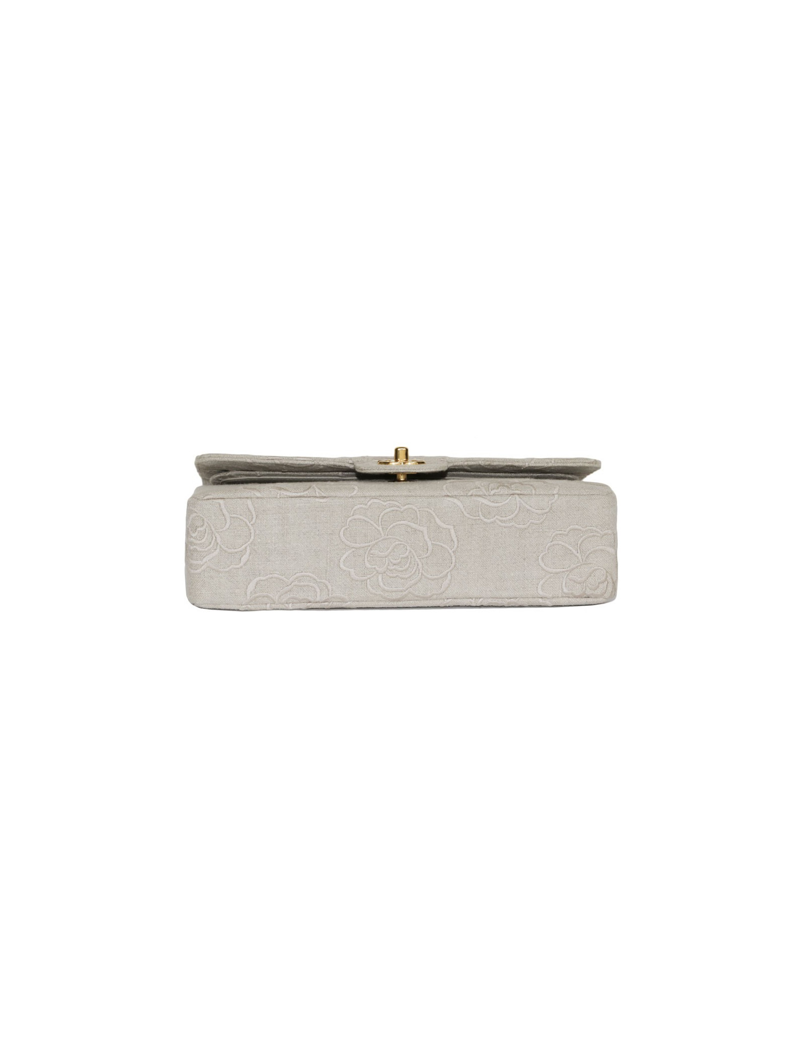 Bag 'Timeless' in Ecru canvas embroidered the House of Chanel Camellia. Clasp 'CC'. Golden jewelry. Double flap. The Interior is Ecru color with 3 plated pockets leather. Hologram: 5172... No authenticity card.