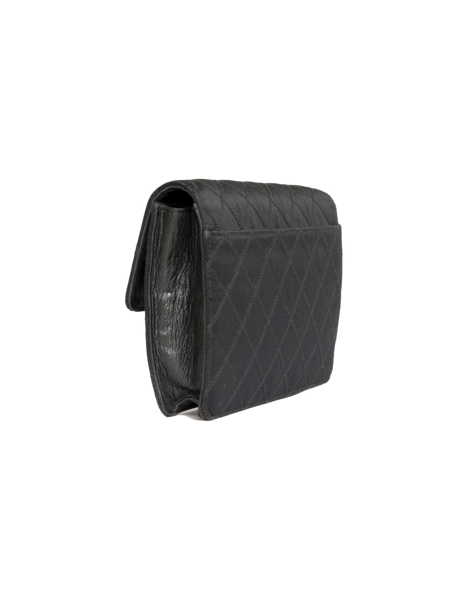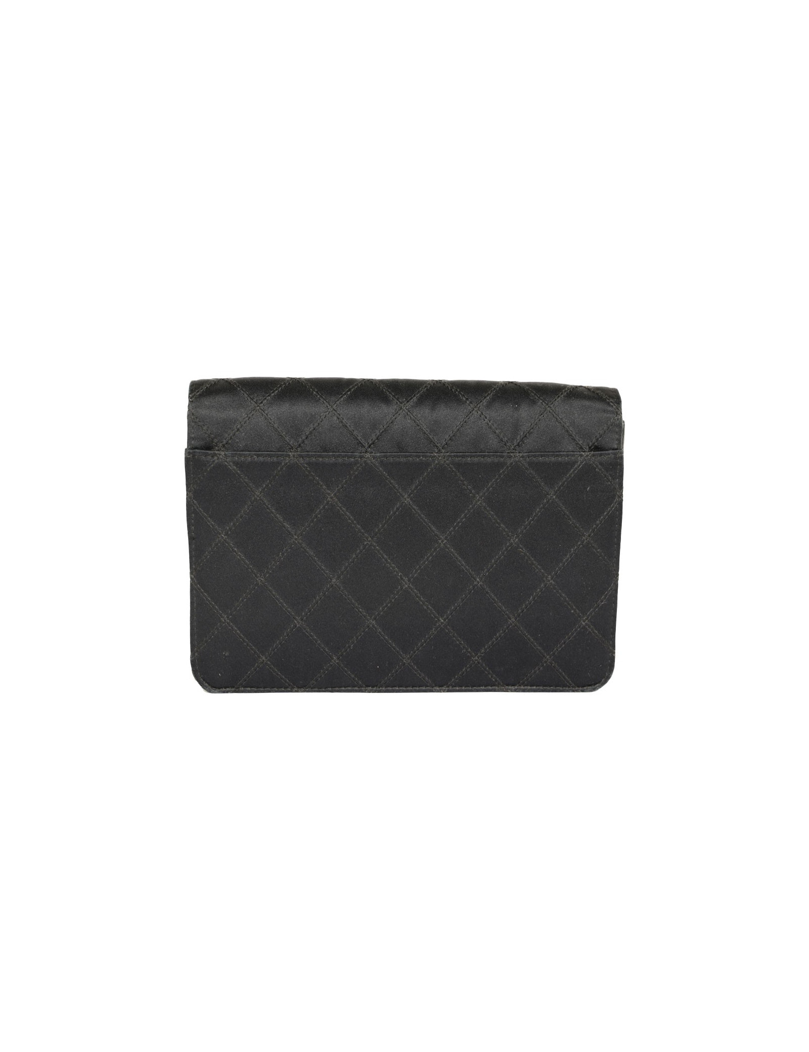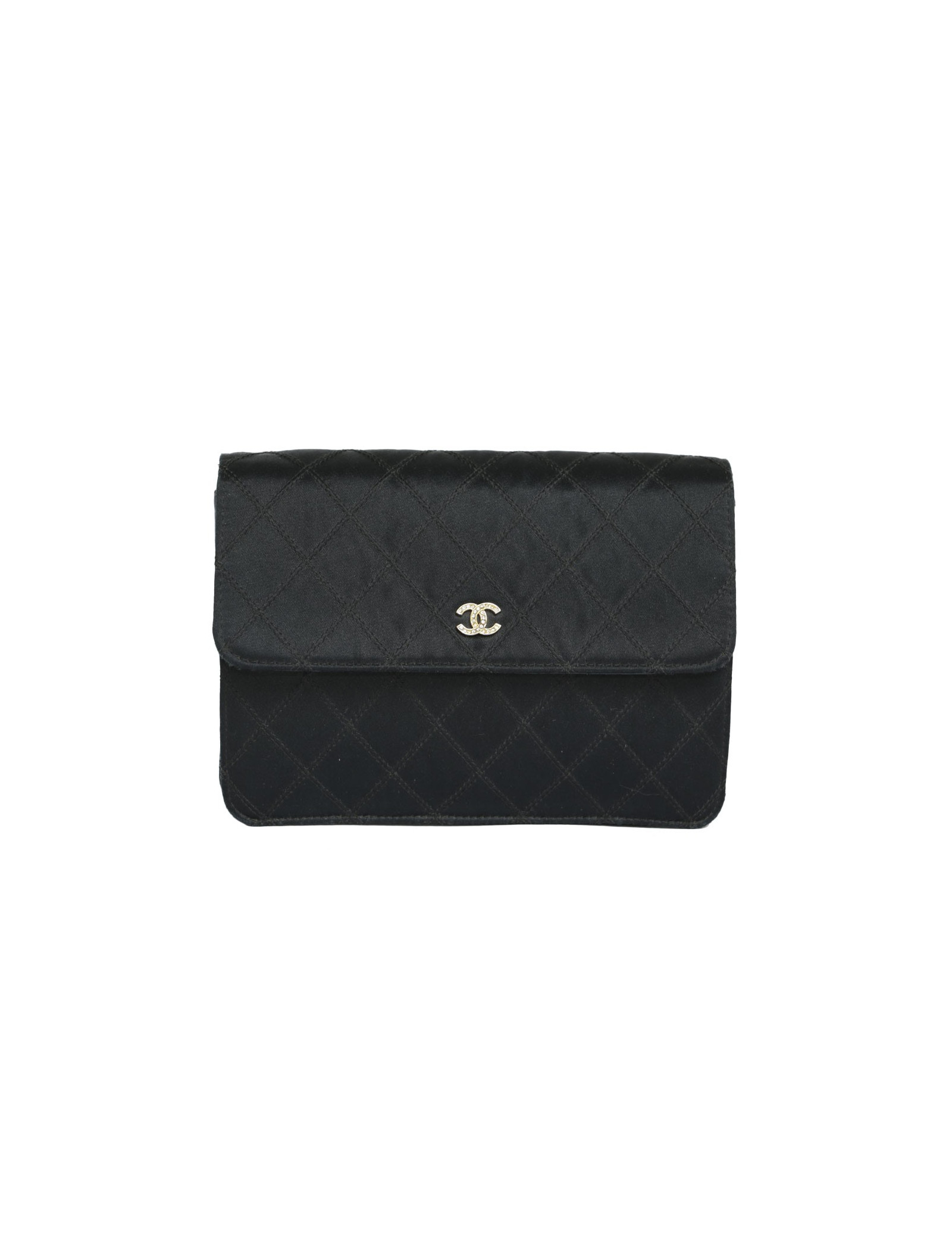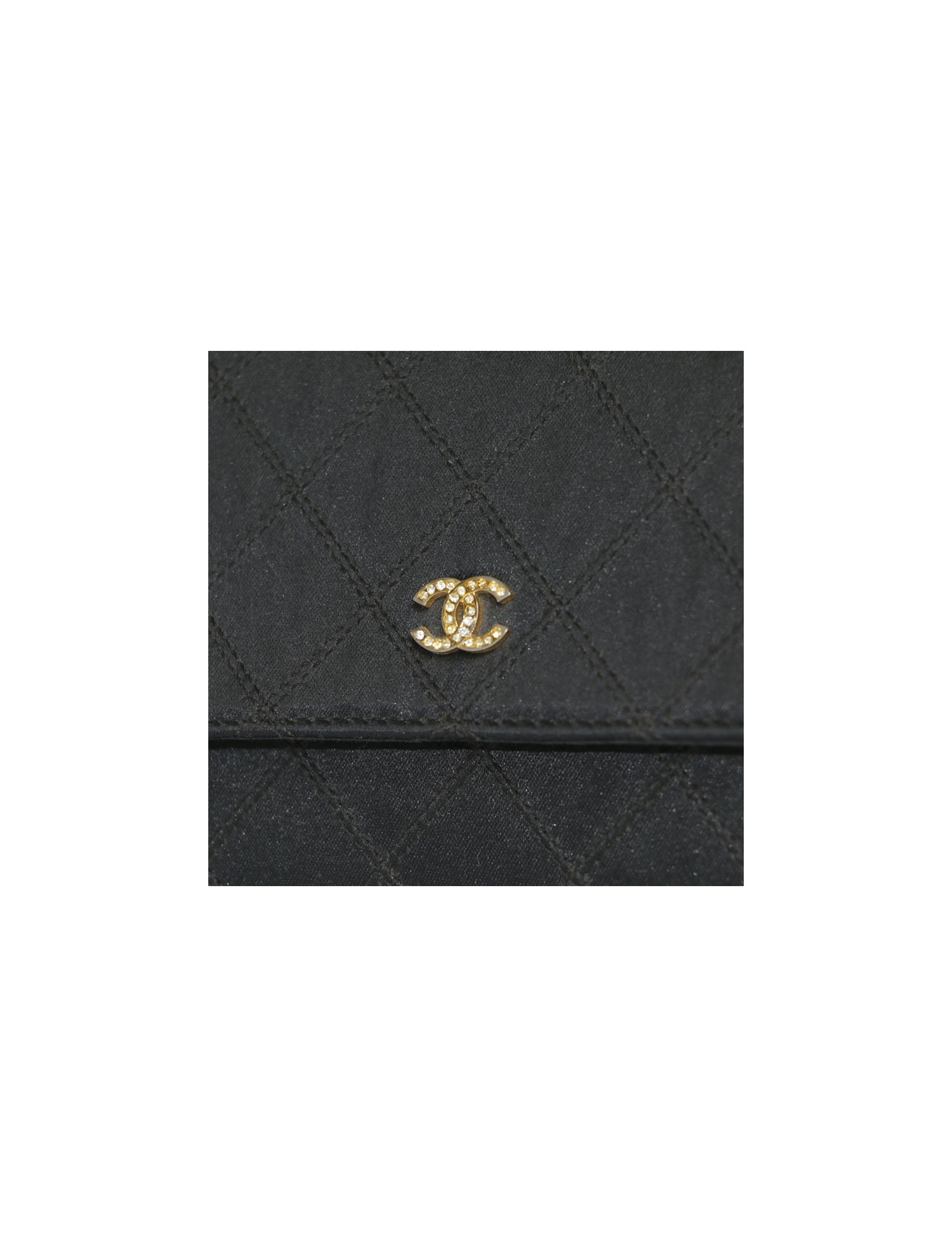 Bag / cover of the night in the House of Chanel's black silk, quilted. Golden jewelry. The Interior is wild silk and black leather with a flat and zipped pocket. Hologram: 0738... No authenticity card. Door hand. Double C with Rhinestones.
