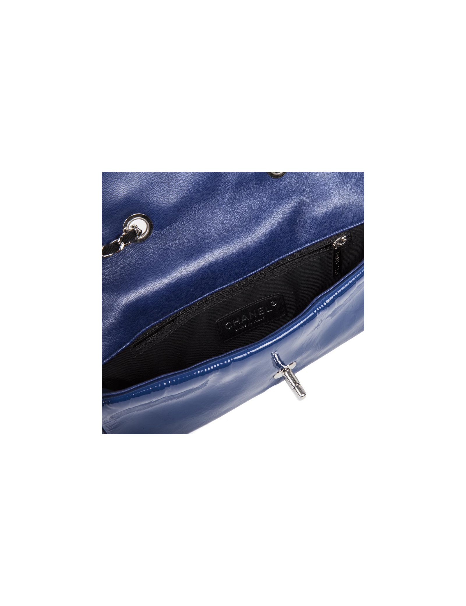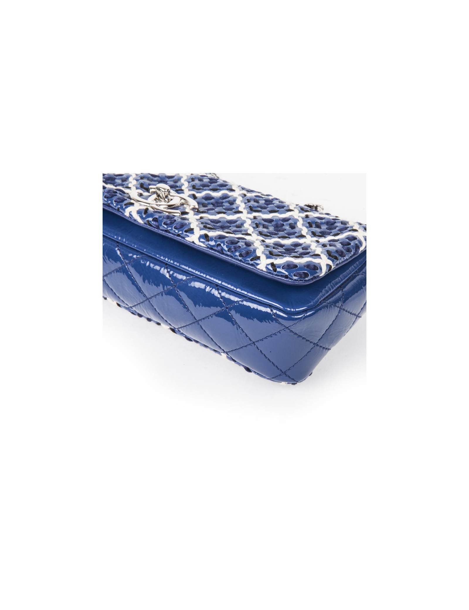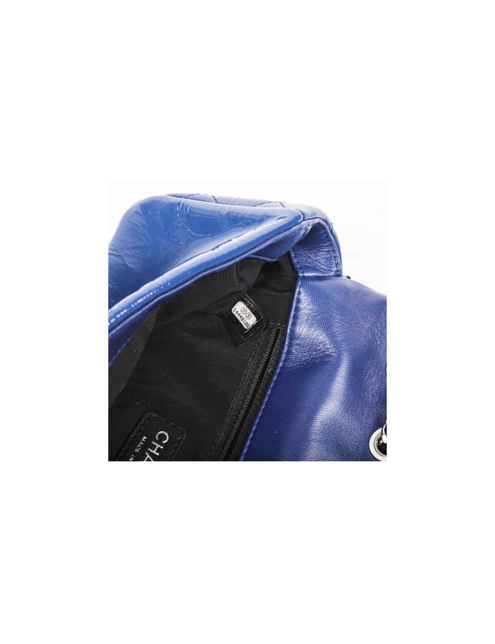 Chanel bag wand patent leather blue Gypsy, rabat and back embroidery of white, blue and black way son quilted, silver chain and large grains tape strap black, CC interwoven silver metal clasp. Hologram 1444... Without authenticity card. Worn on the shoulder.