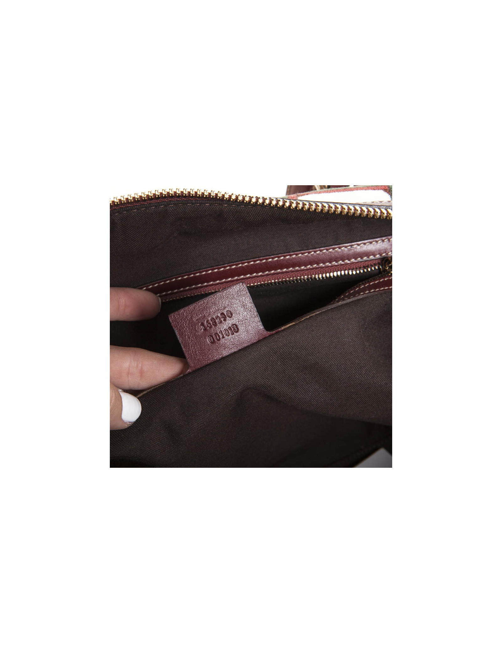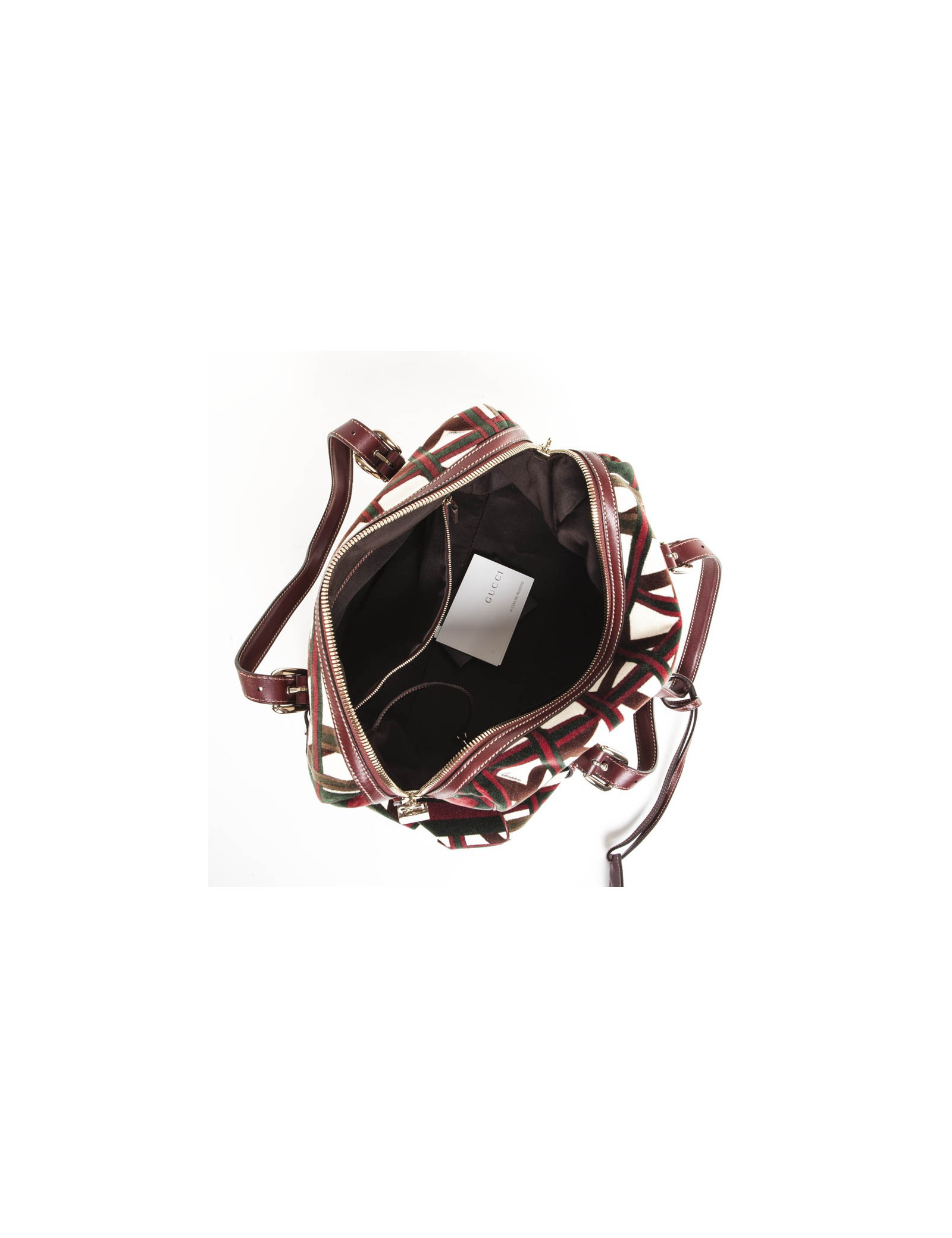 Bag shopping bag in Velvet reasons bolduc and the Gucci Burgundy leather. Pale golden jewelry. At the front, the "JAWS" emblem of the House of Gucci. Zipped. The Interior is in Brown fabric with a large zipped pocket and a pocket for smartphone. In very good condition.