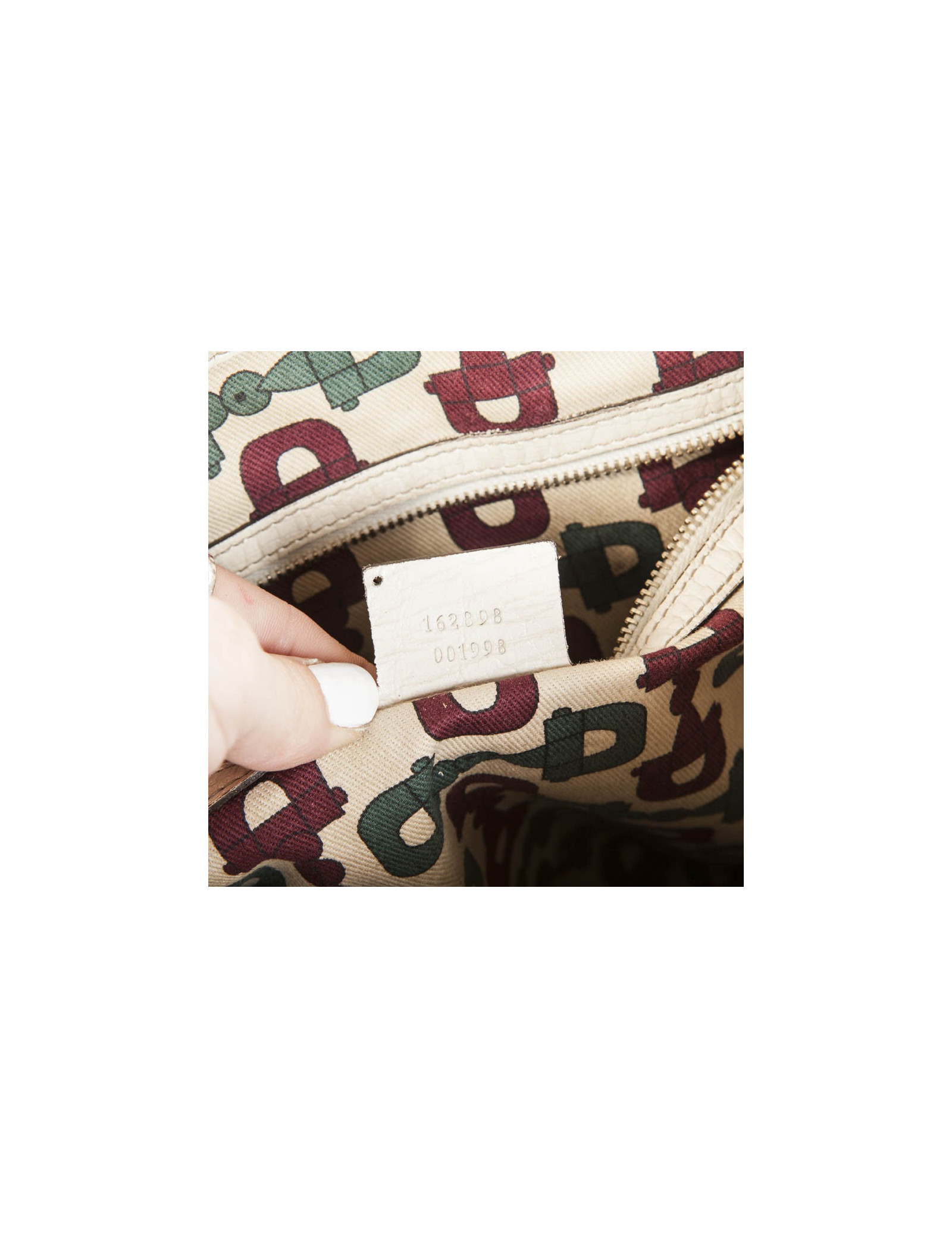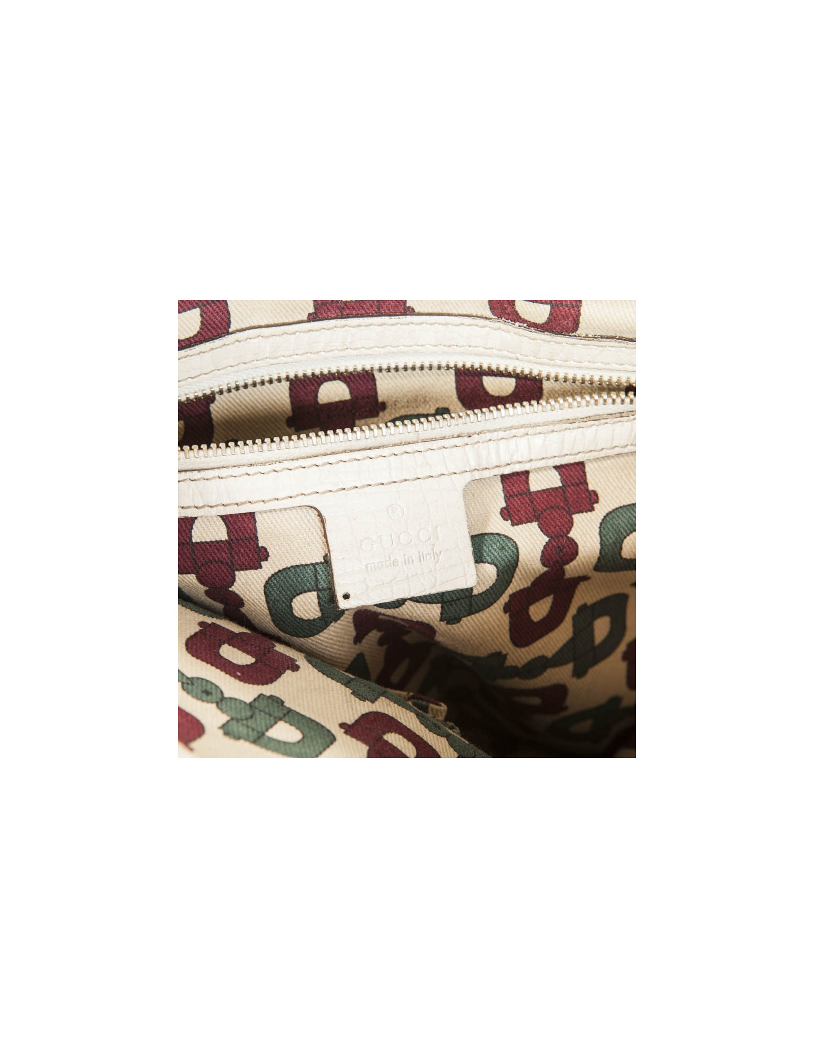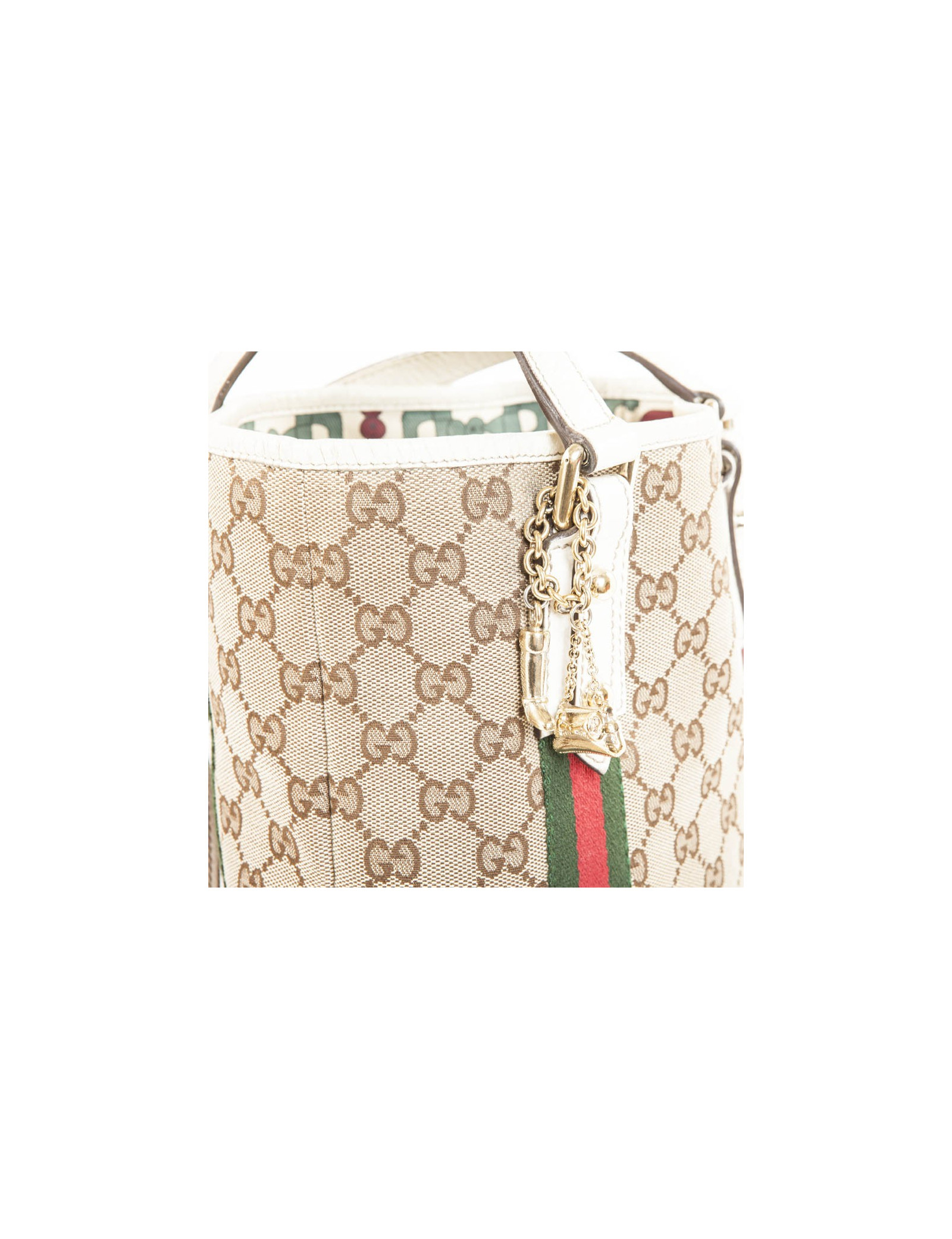 Gucci canvas monogram and ivory leather vintage bag. Charms hanging from the bag Gucci representing a "JAWS" bag and a cavalier boot gold metal.