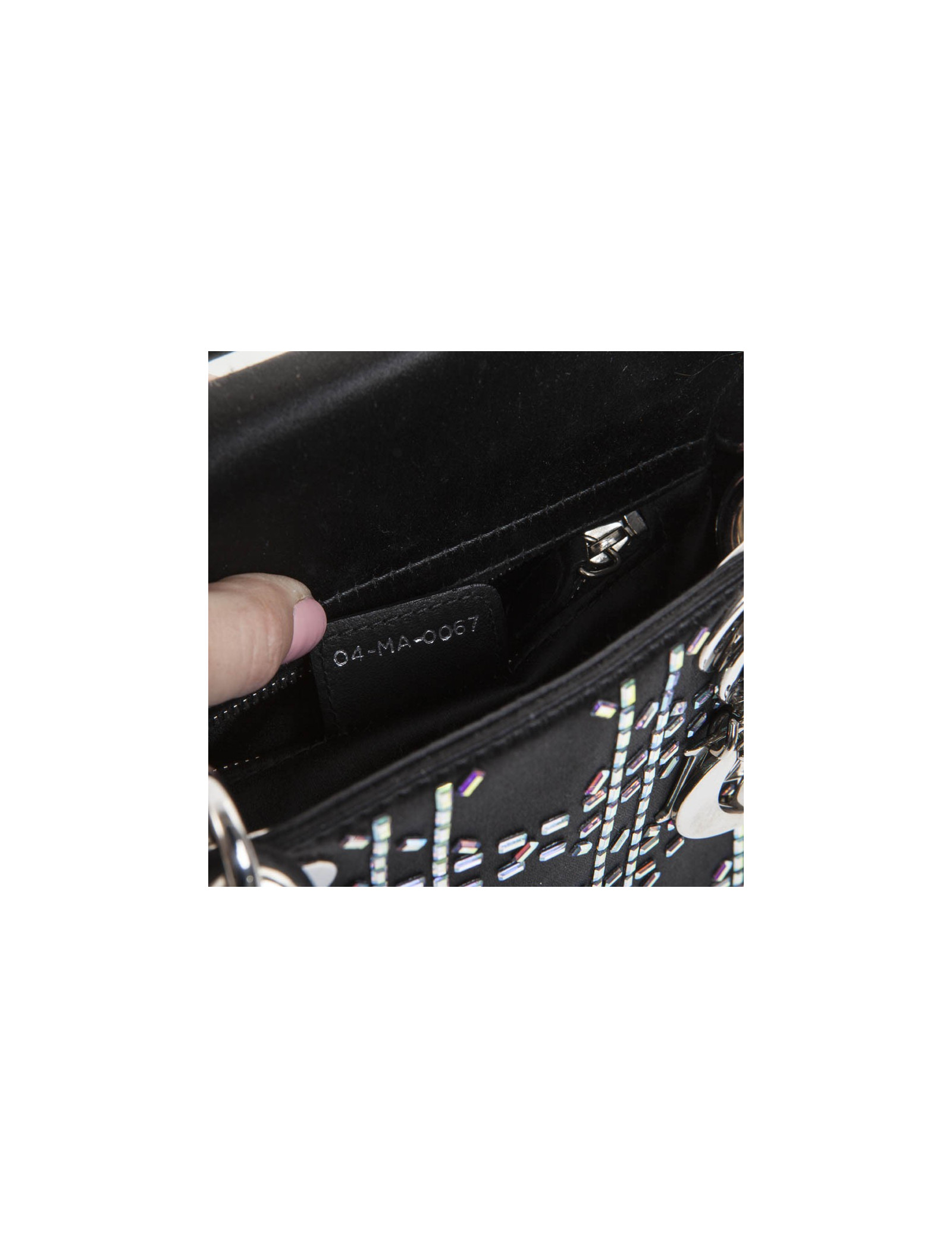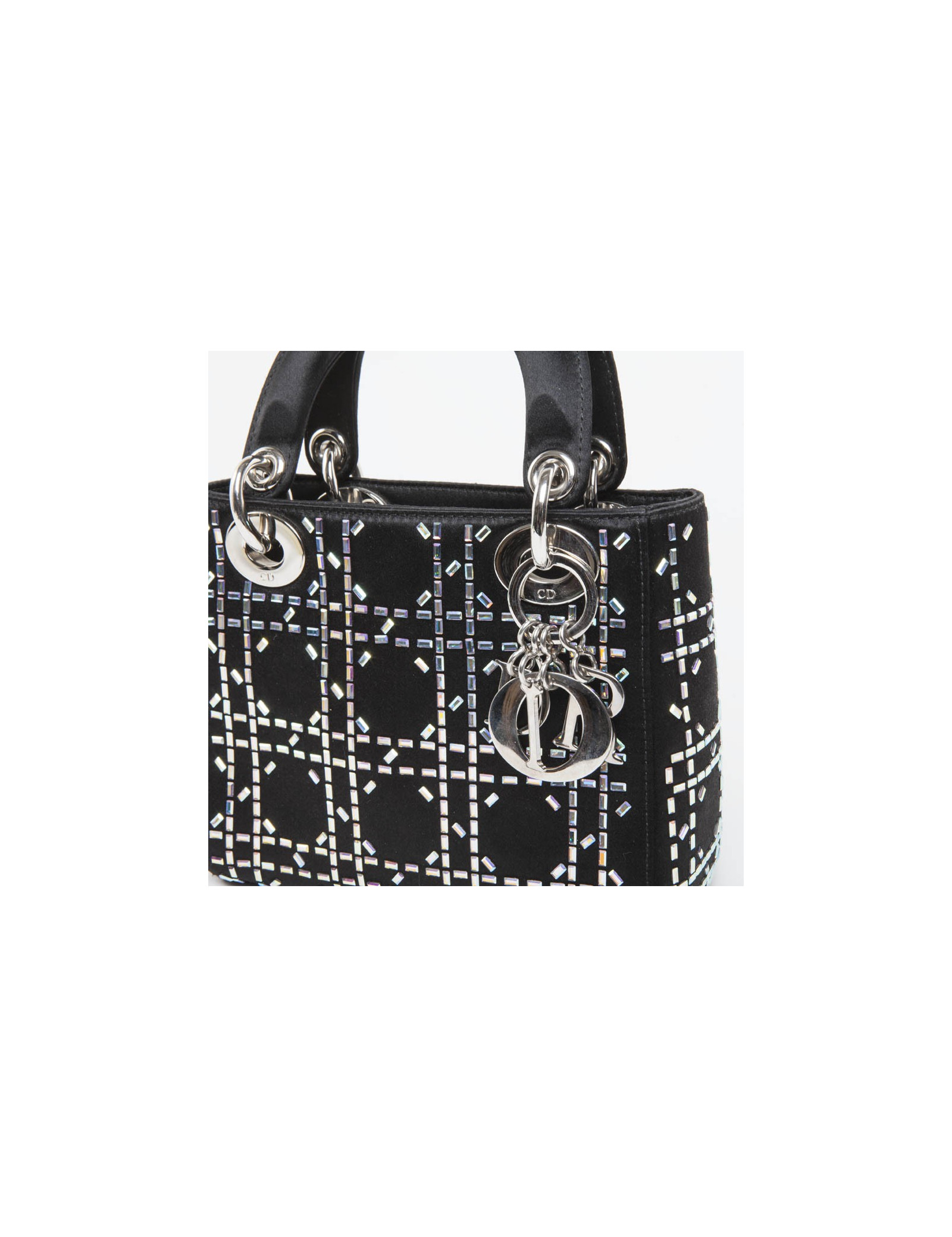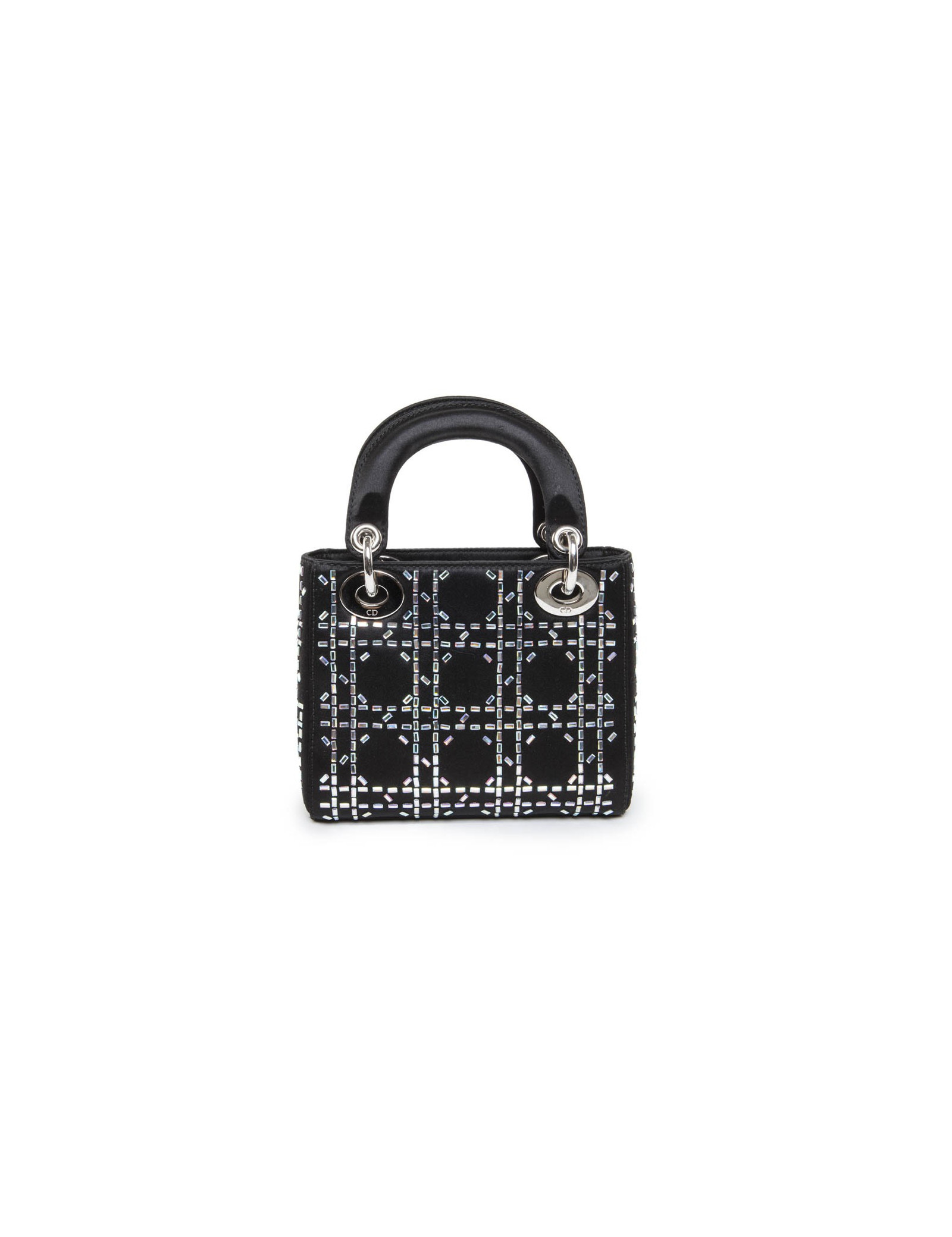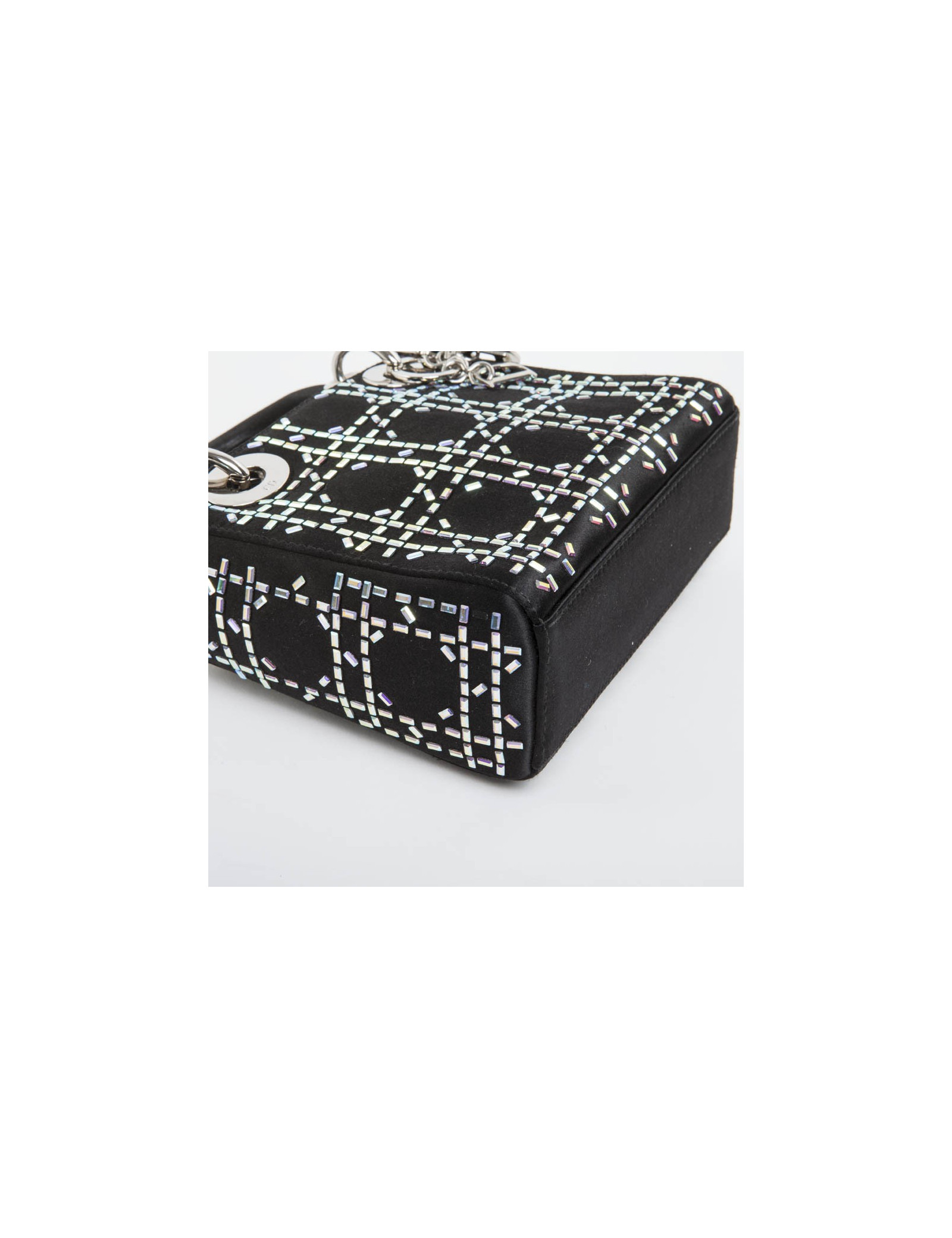 Limited series. Mini D Lady D evening bag from Maison Christian Dior in black silk satin and shiny Swarovski brilliants with an emerald cut. Silver palladium hardware. Serial number: 04MA0067.