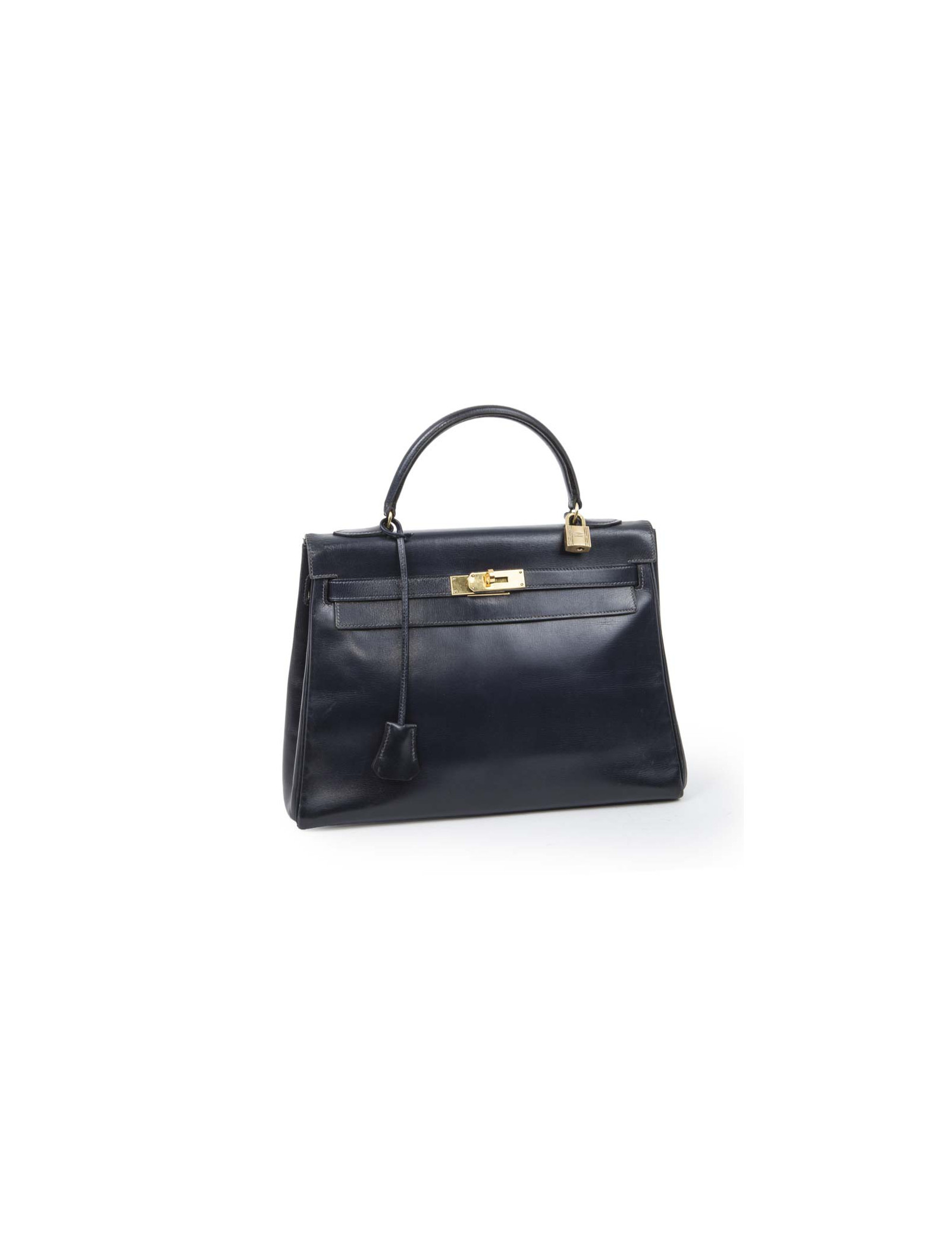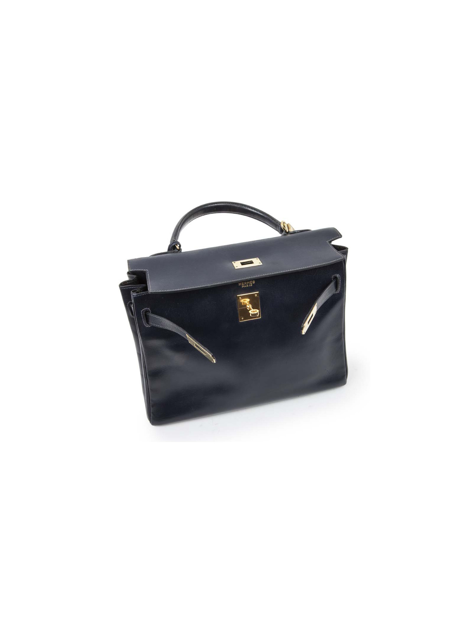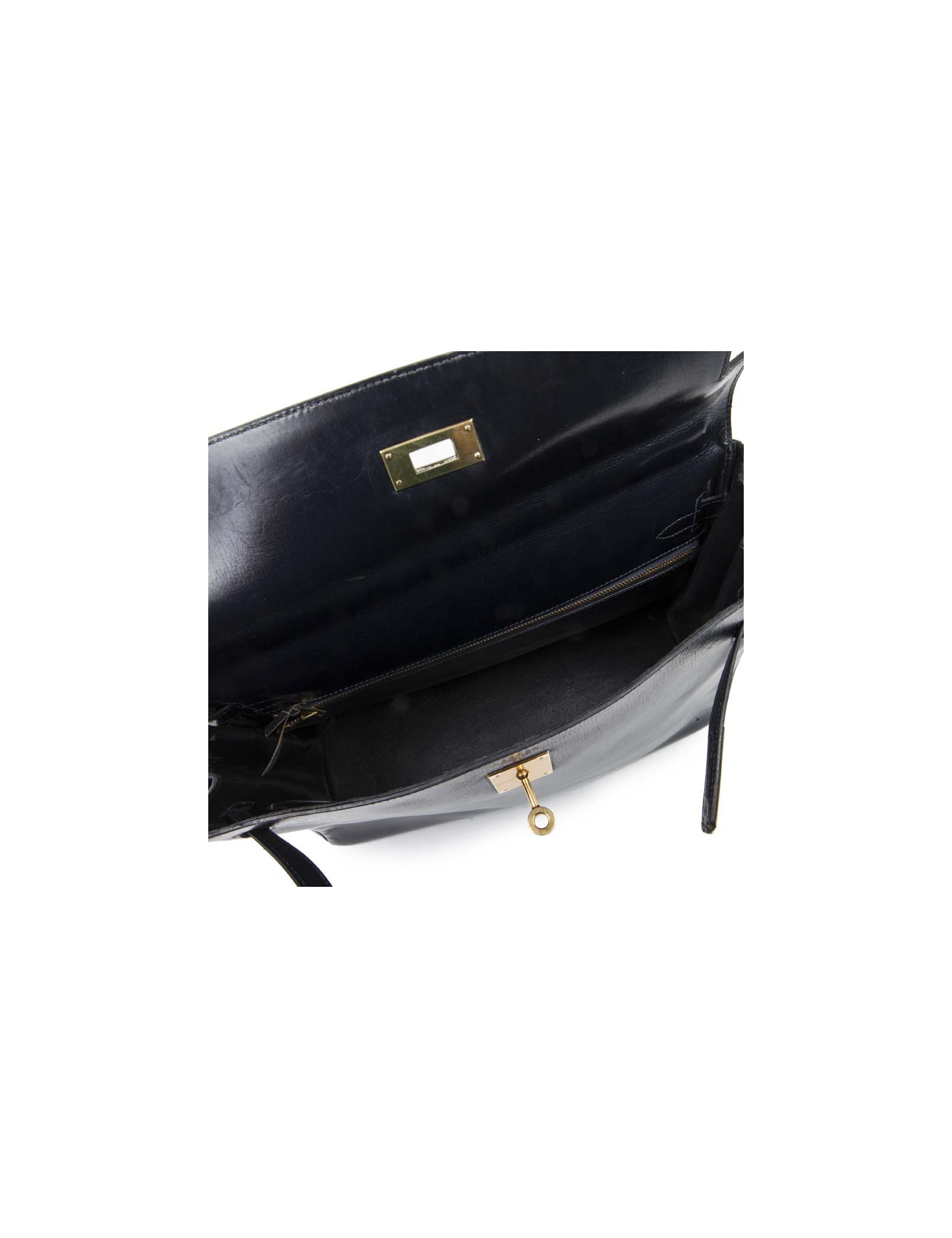Vintage! Sac Kelly 32 en cuir box bleu nuit de la Maison Hermès. Lettre T année 1964. Bijouterie dorée. Tirette, clochette, cadenas et clefs. A l'intérieur, 3 poches plaquées dont 1 zippée. Etat vintage. Usure des coins : 2 coins arrière très légèrement déchirés, les deux coins avant juste usés.