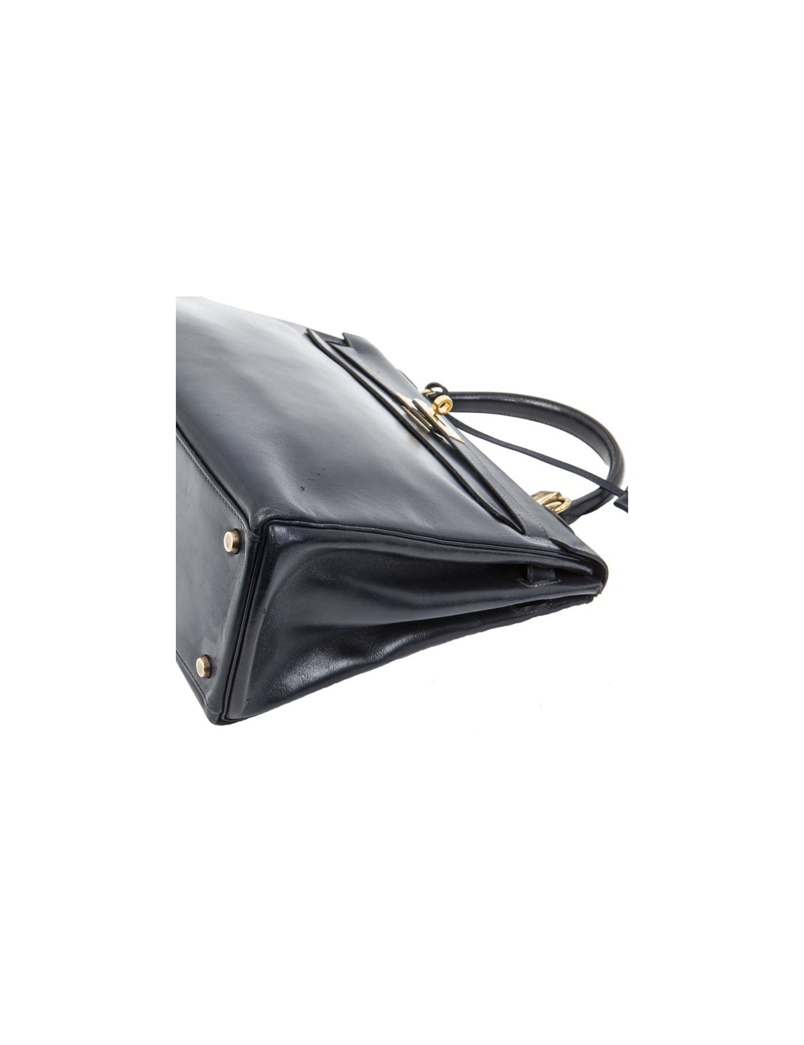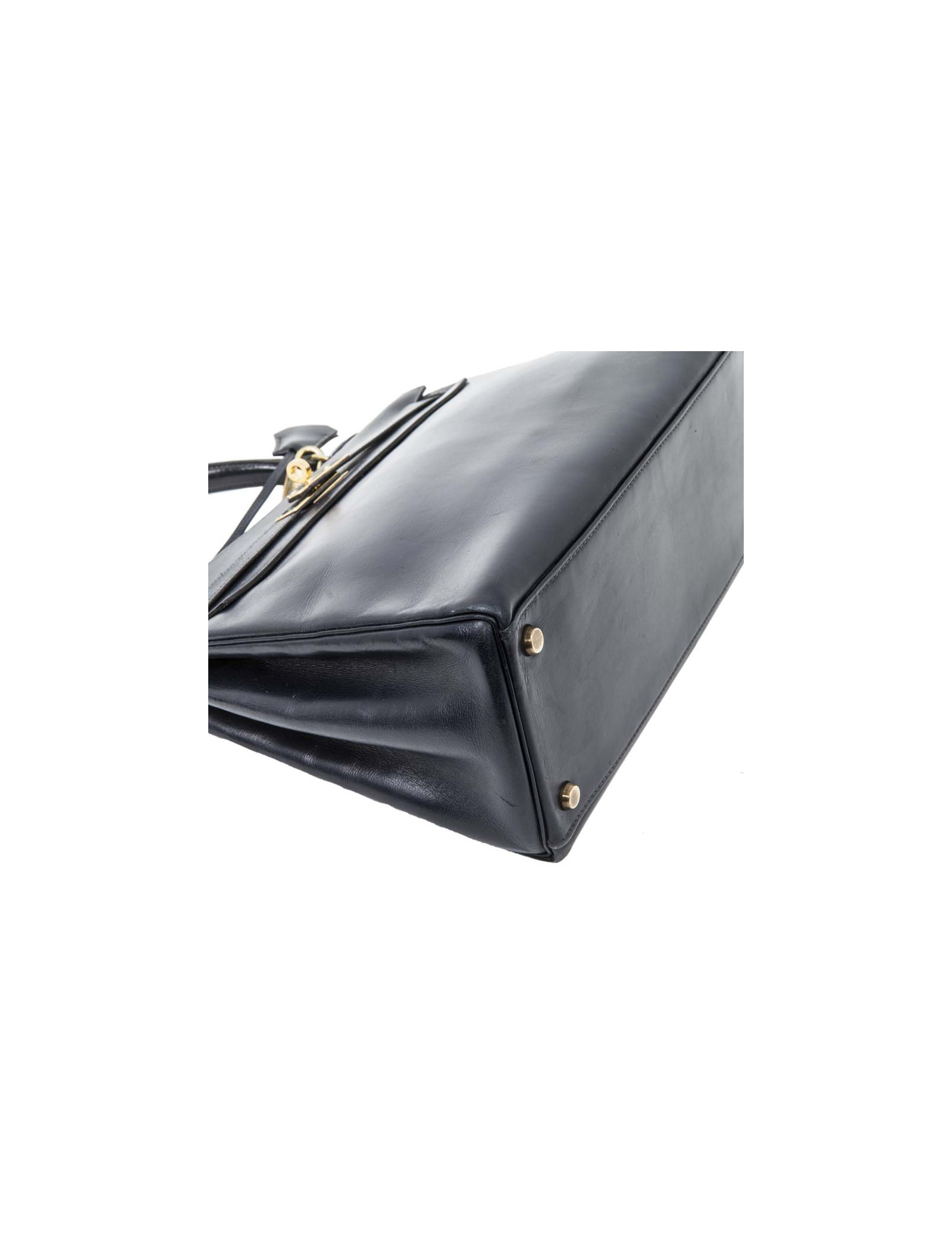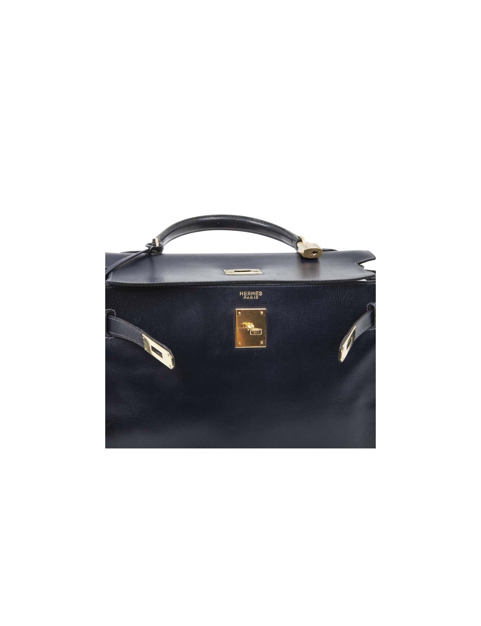 Vintage! Sac Kelly 32 en cuir box bleu nuit de la Maison Hermès. Lettre T année 1964. Bijouterie dorée. Tirette, clochette, cadenas et clefs. A l'intérieur, 3 poches plaquées dont 1 zippée. Etat vintage. Usure des coins : 2 coins arrière très légèrement déchirés, les deux coins avant juste usés.
