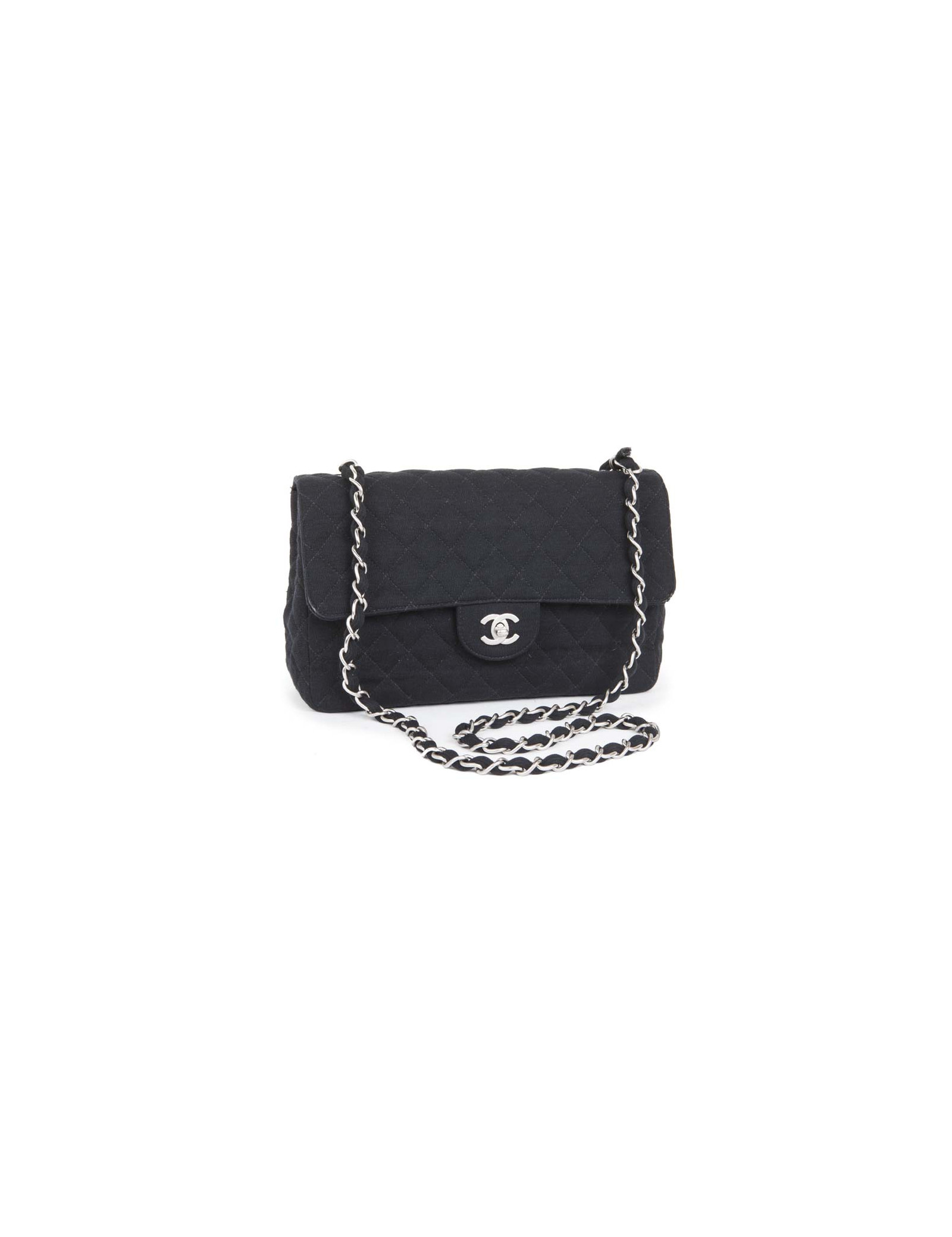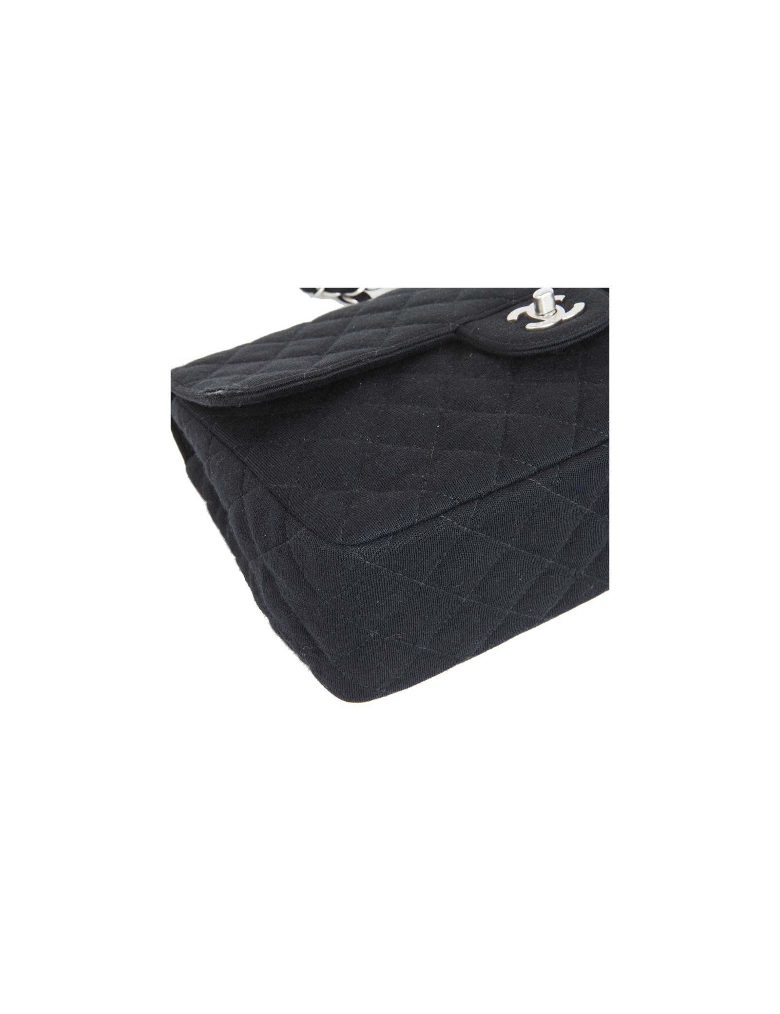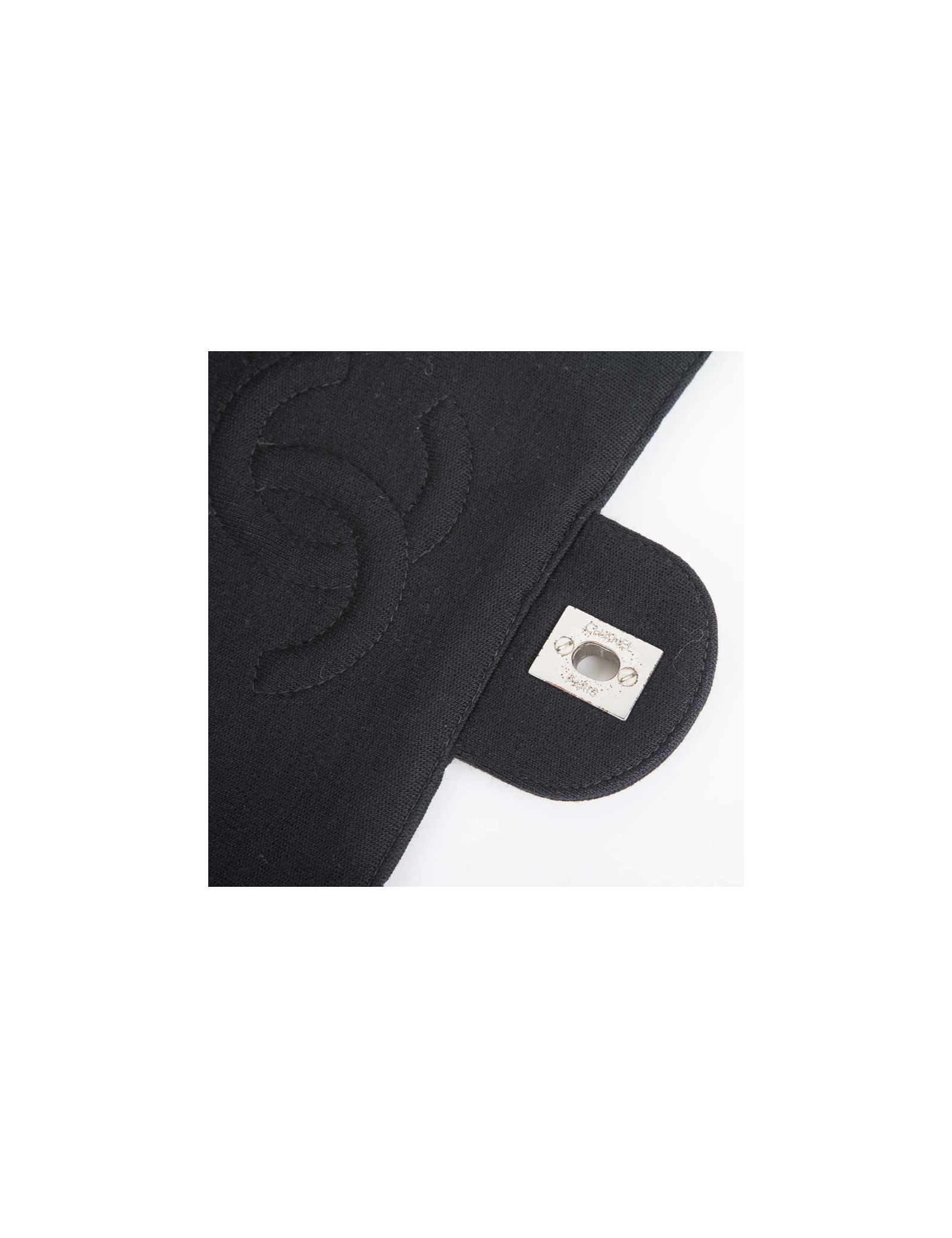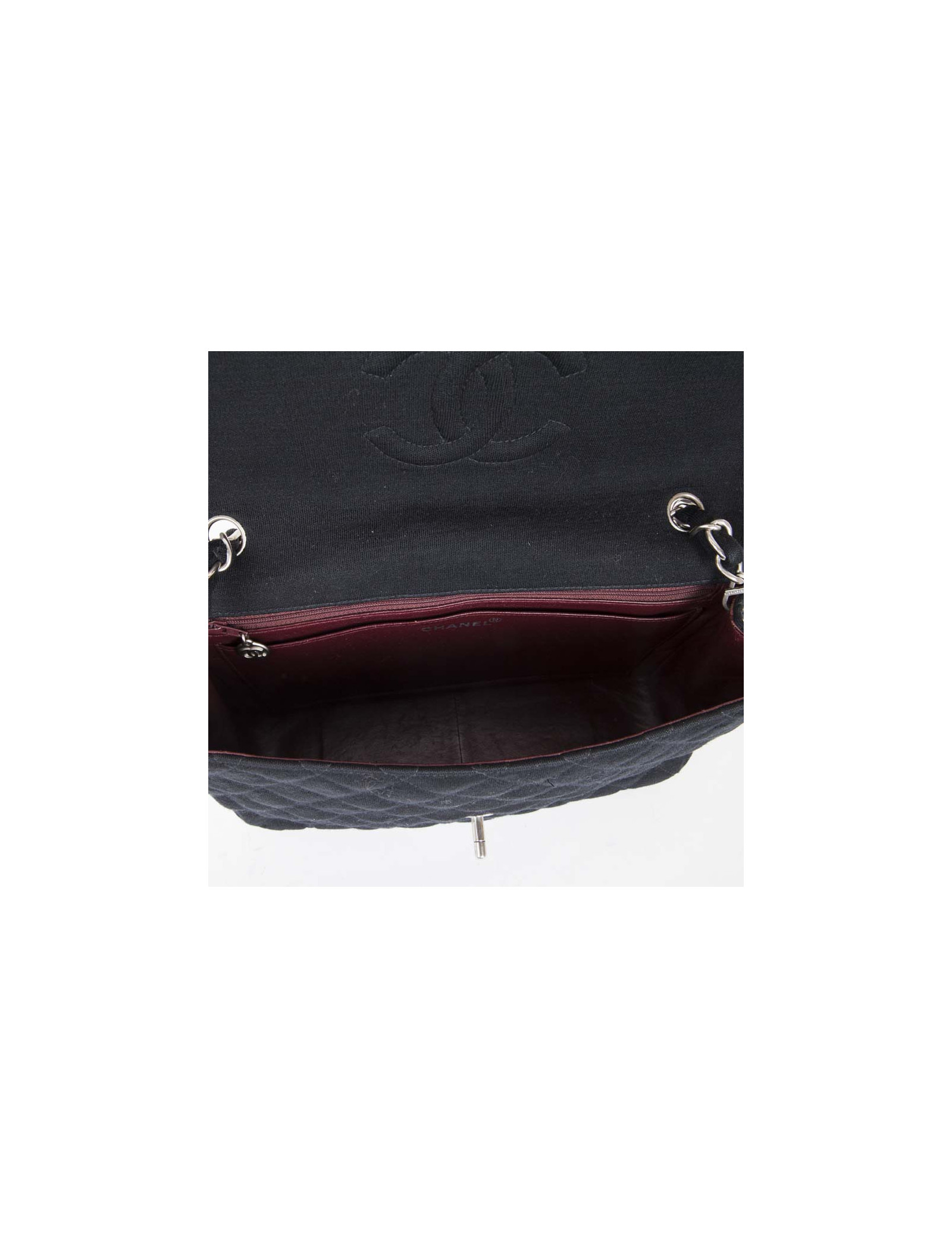 Bag 'Timeless' of the House of Chanel Black Jersey. Matt silver jewelry. The inside is lined bordeaux leather. No hologram authenticity card. Comes from the balances. Worn on the shoulder or crossover. In very good condition (the edge of the flap is slightly damaged, very inconspicuous).