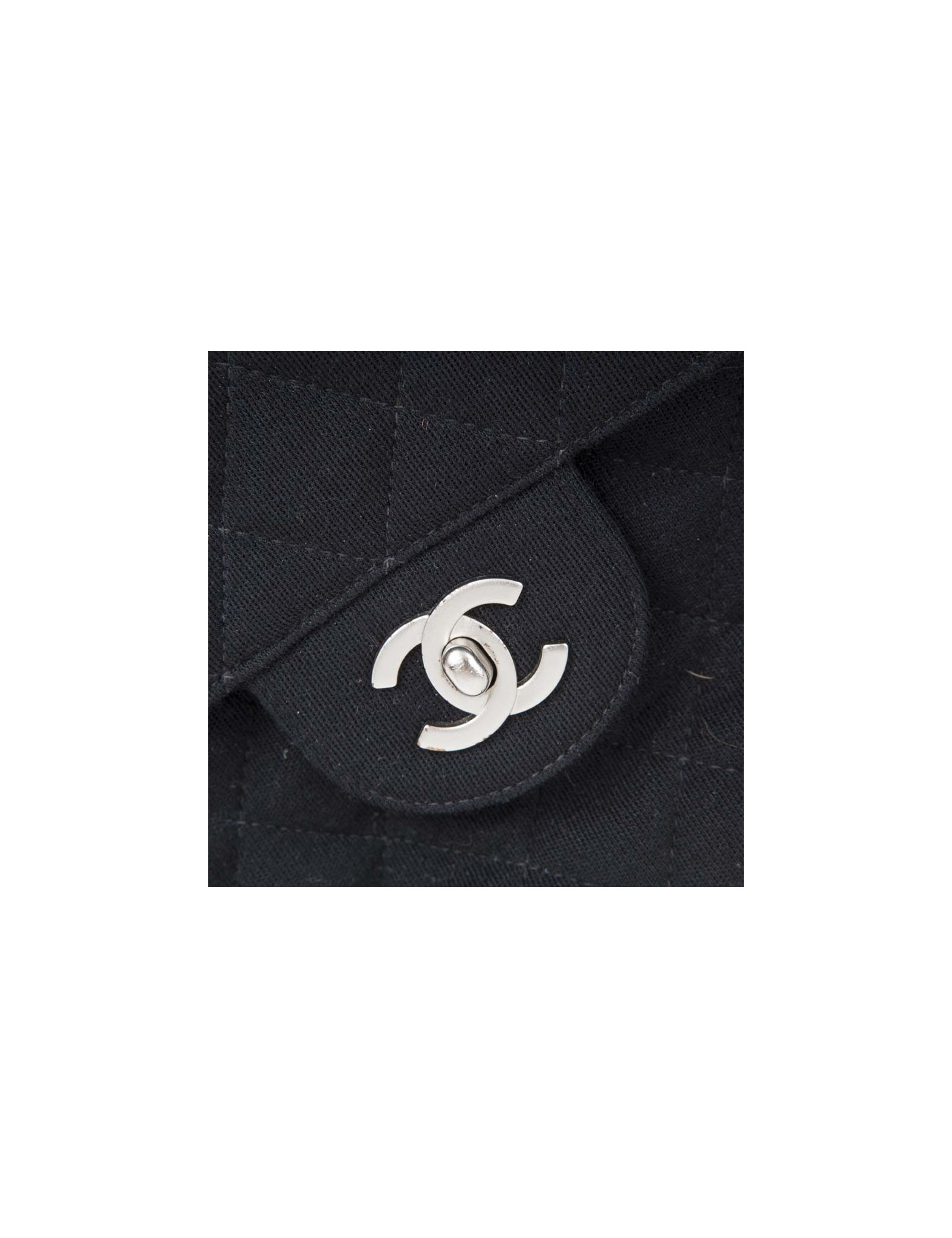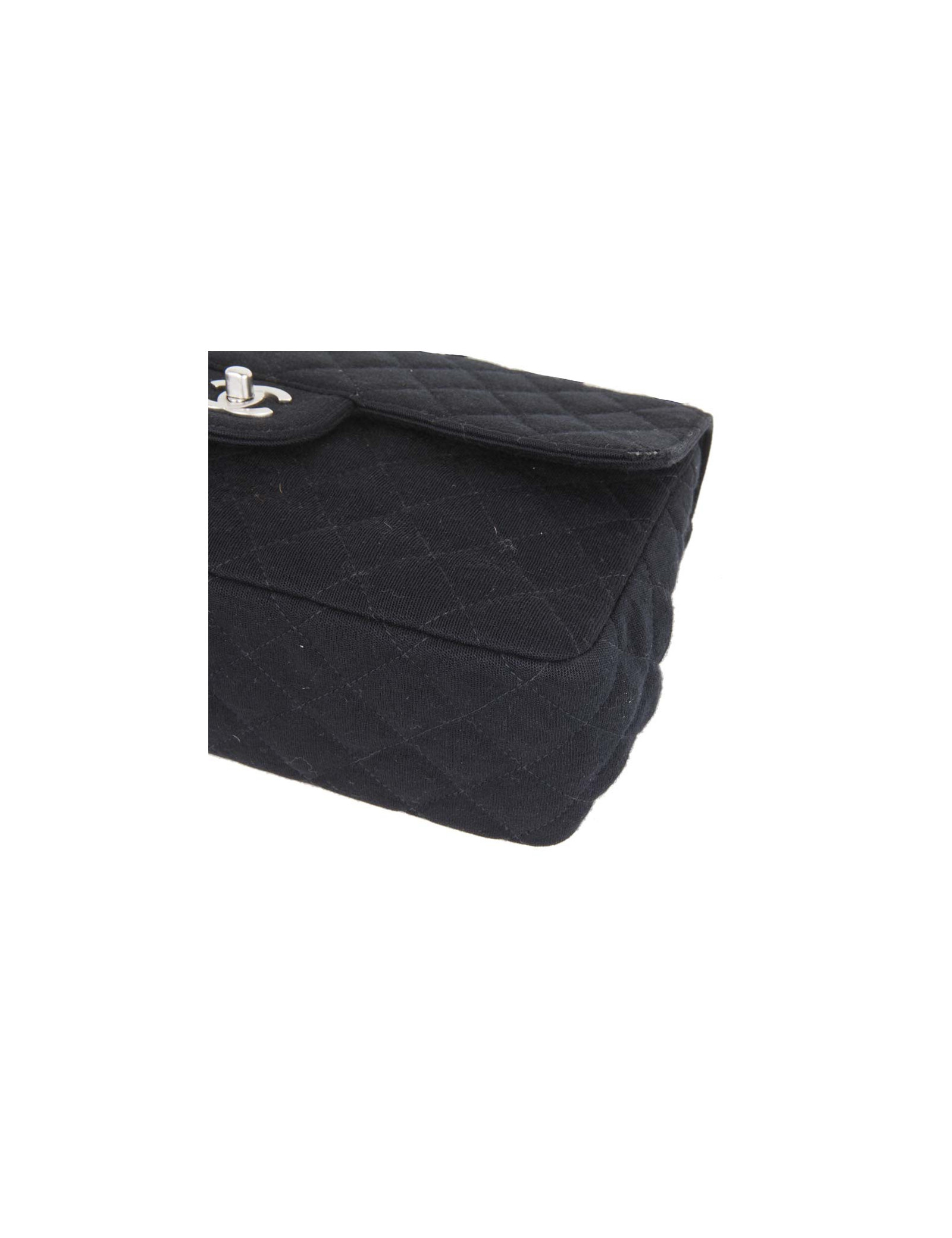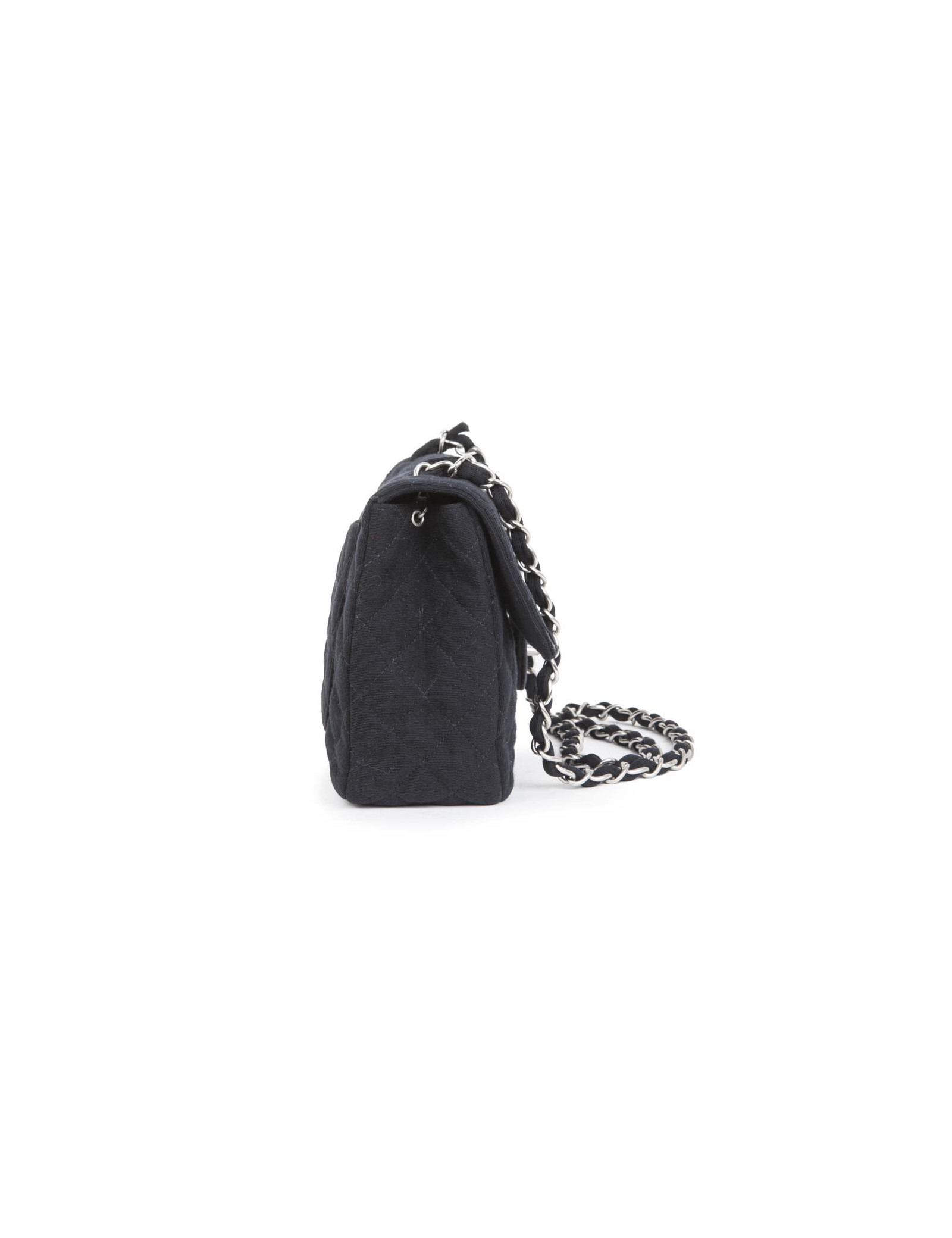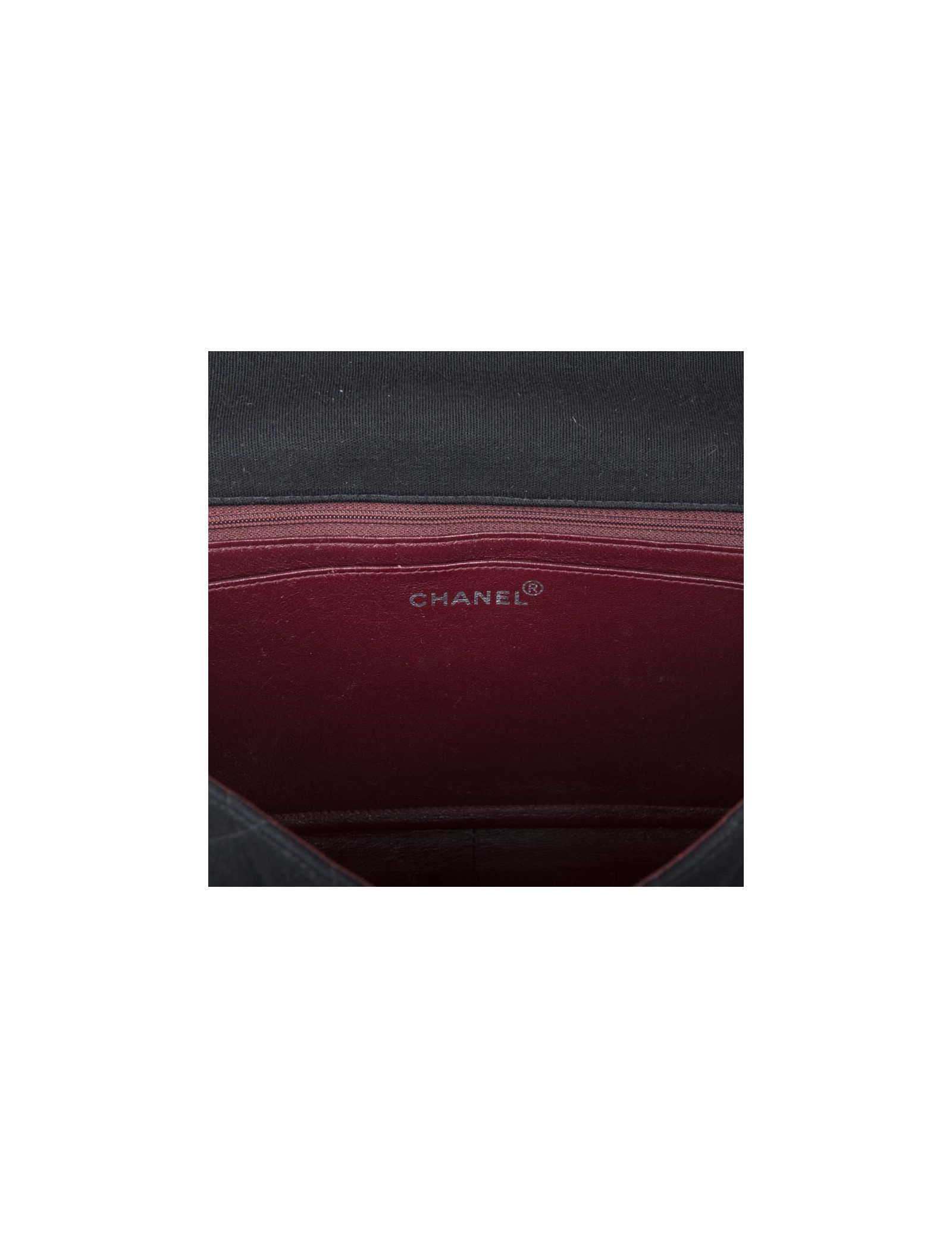 Bag 'Timeless' of the House of Chanel Black Jersey. Matt silver jewelry. The inside is lined bordeaux leather. No hologram authenticity card. Comes from the balances. Worn on the shoulder or crossover. In very good condition (the edge of the flap is slightly damaged, very inconspicuous).