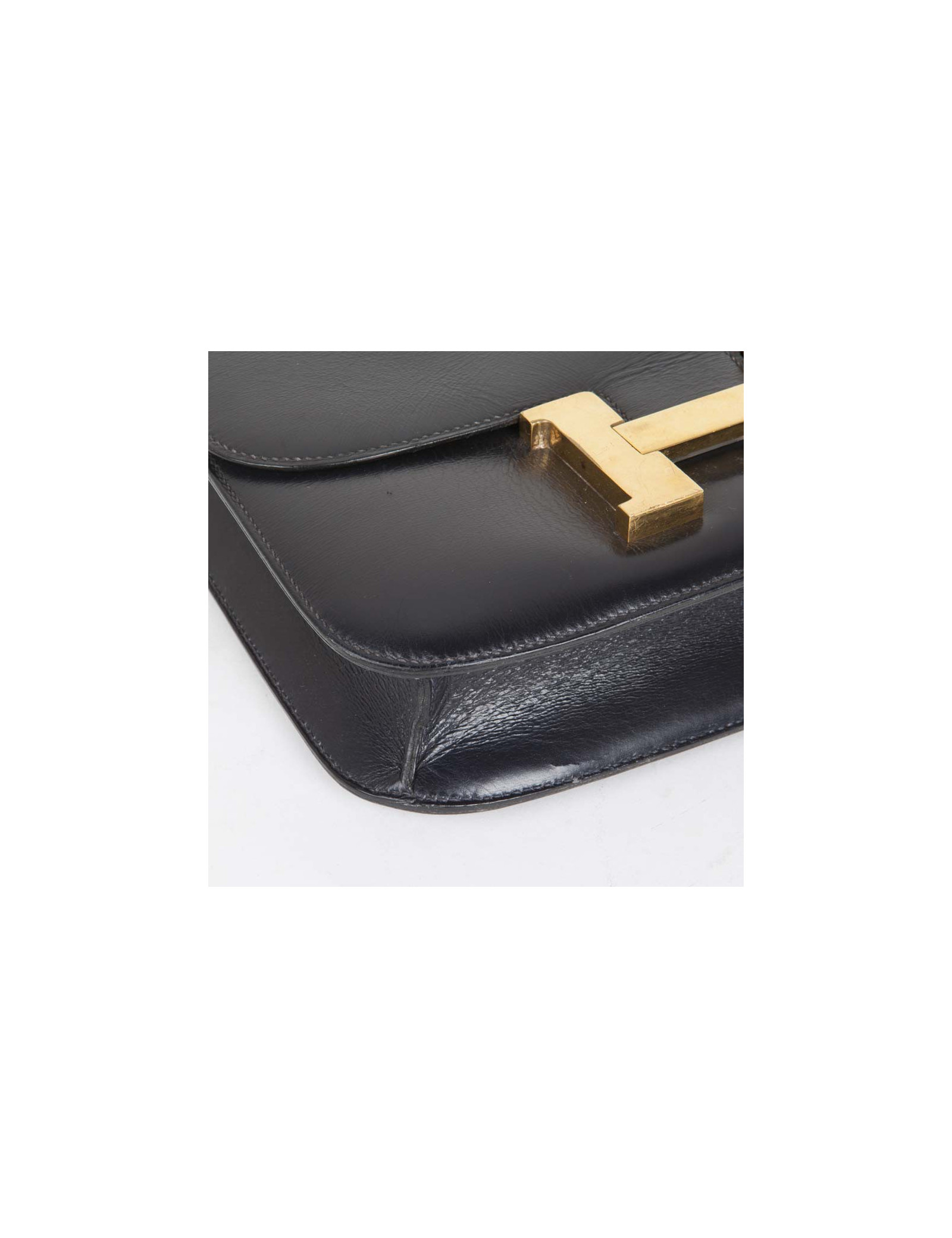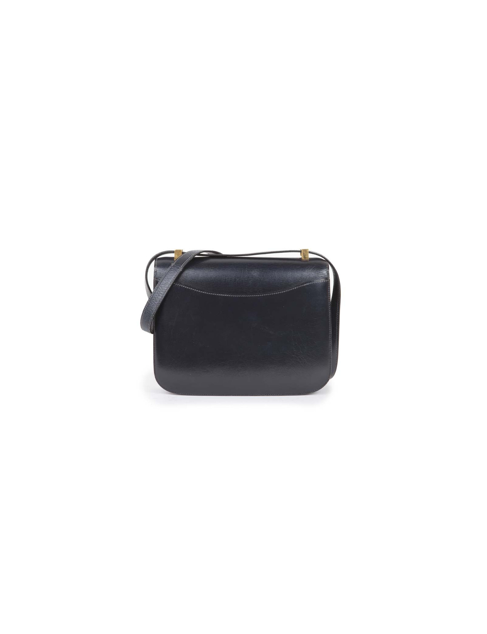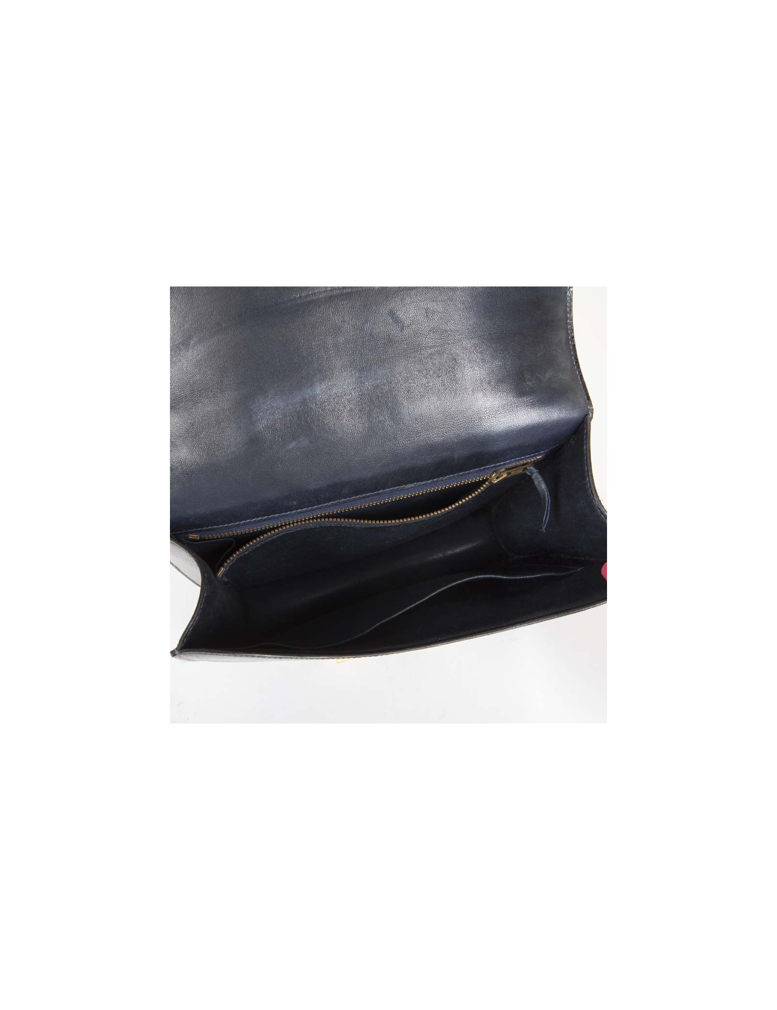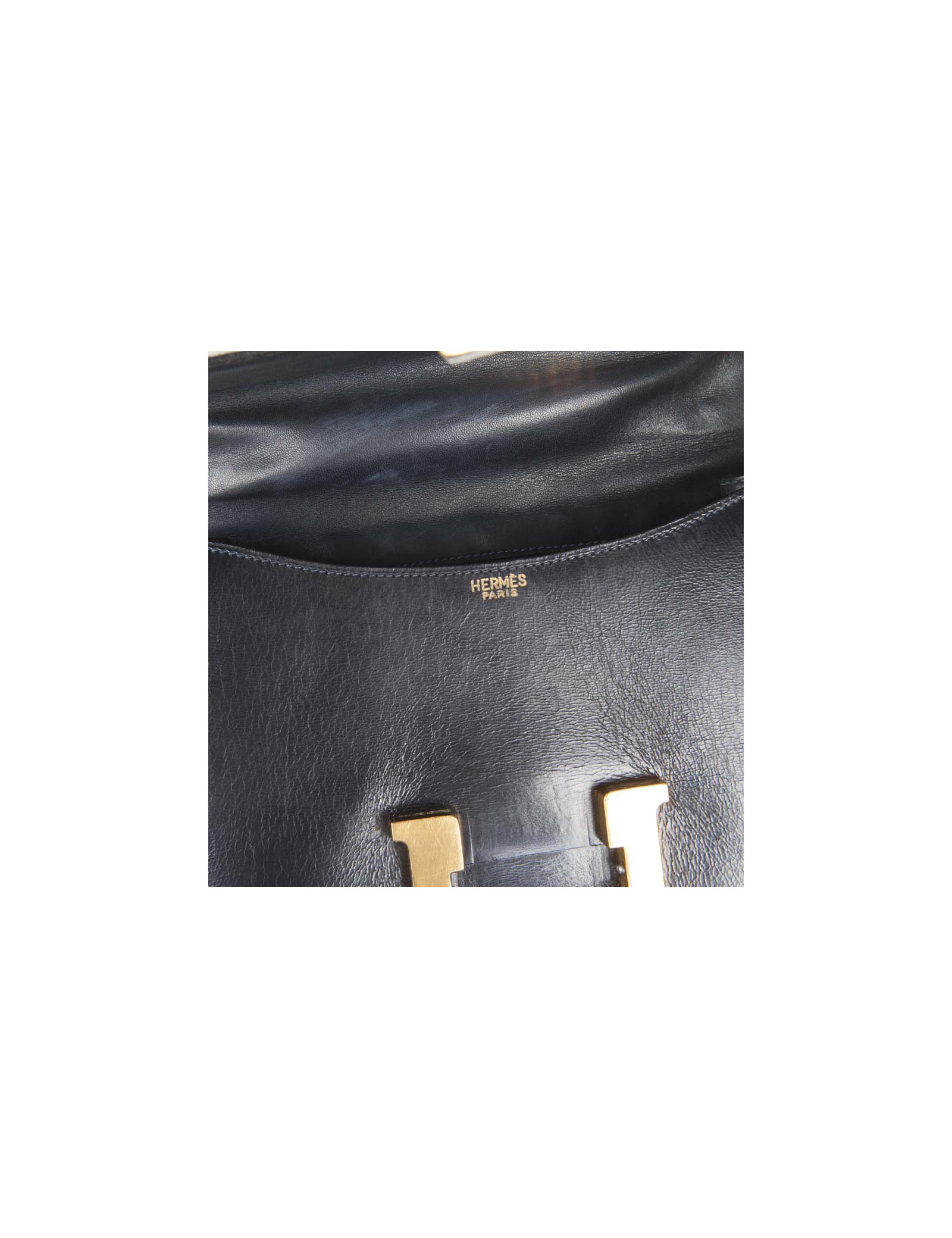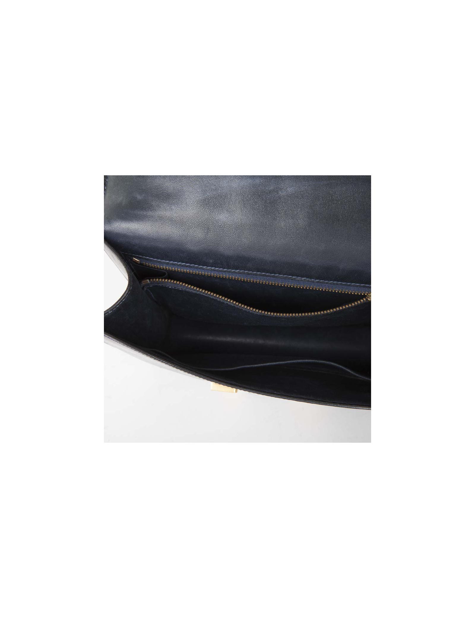 Constance bag by Maison Hermès in navy box leather. Gilded hardware with micro scratches. The interior is innavy smooth lamb leather with two patch pockets, one zipped. Worn shoulder.