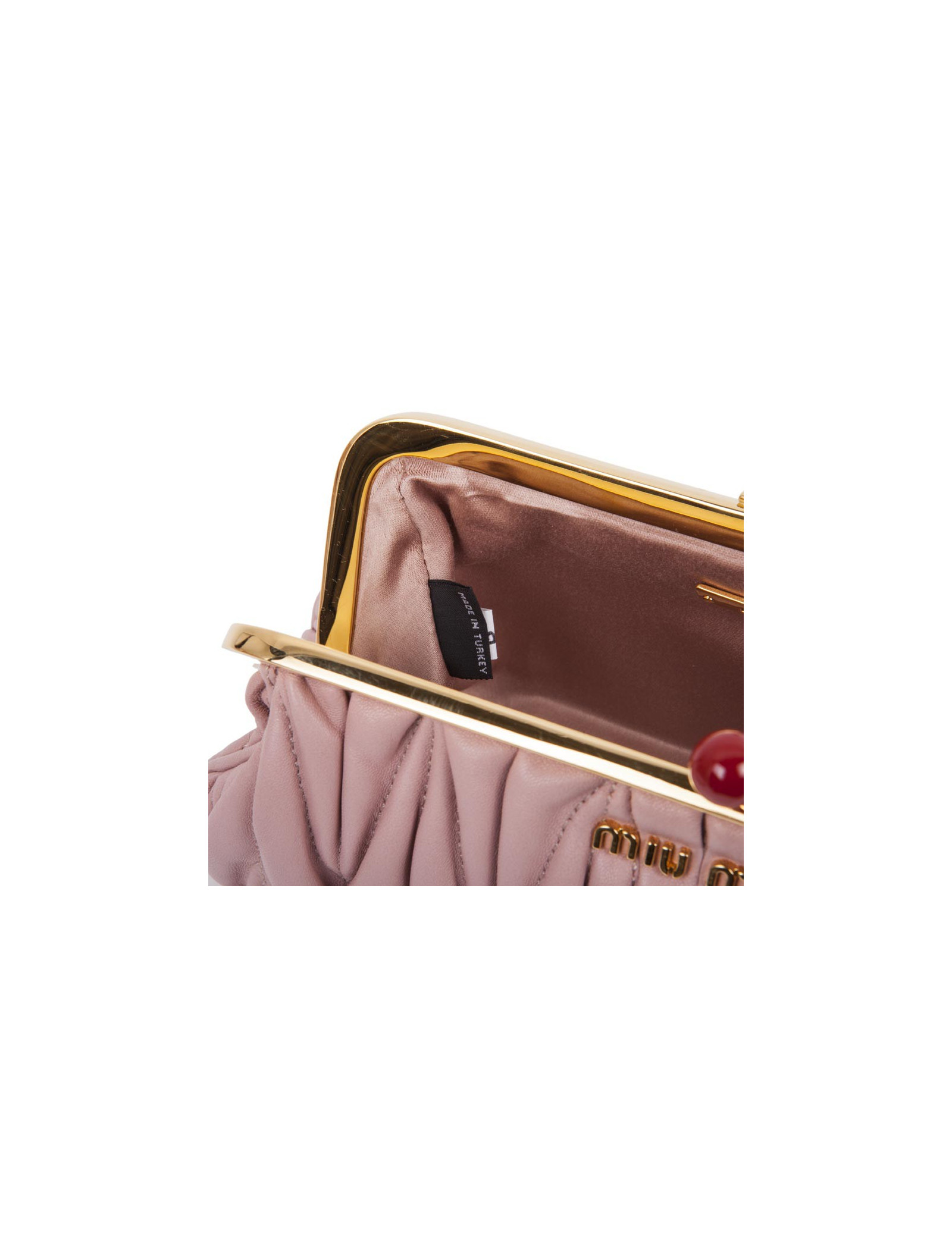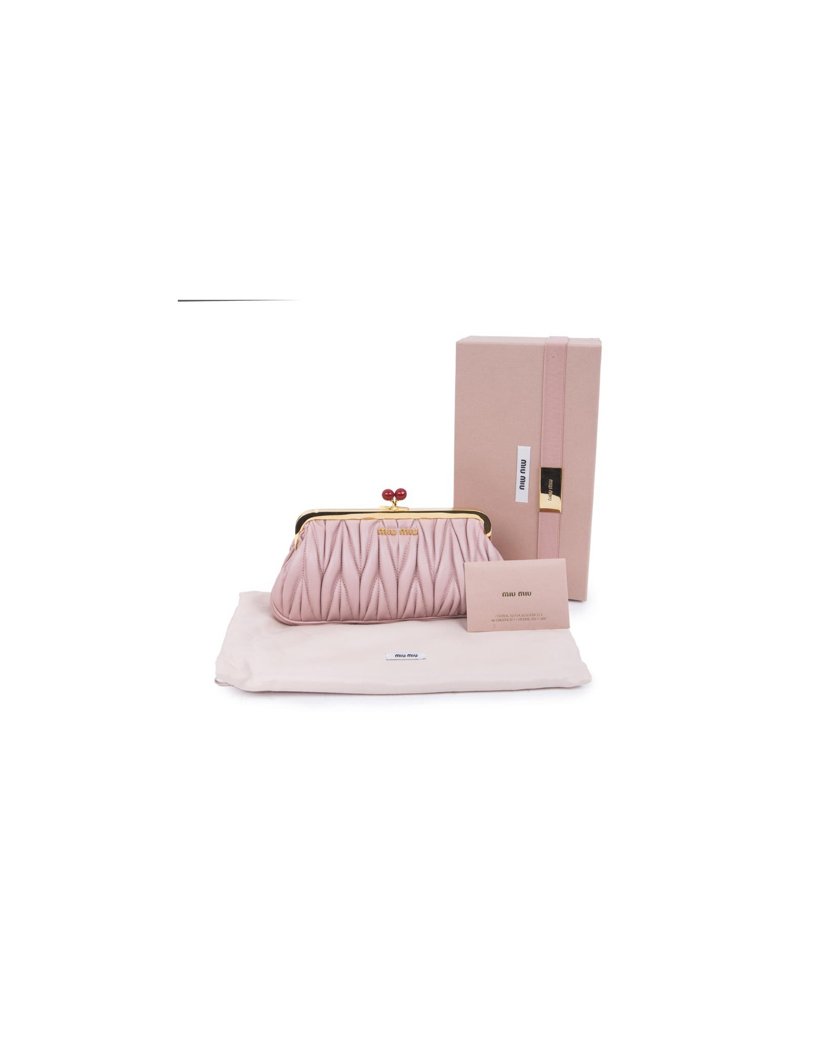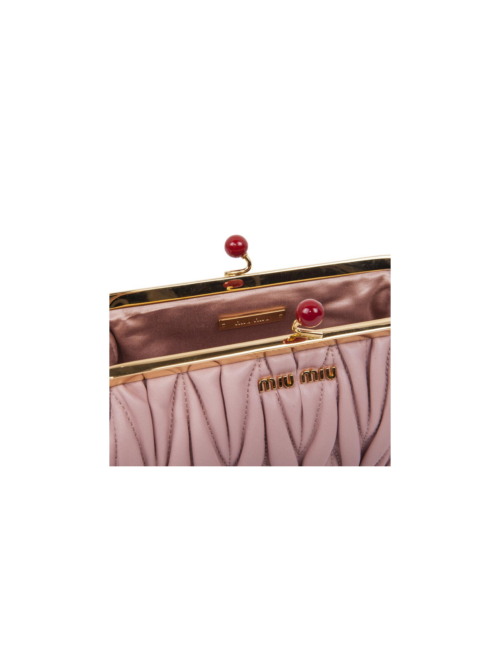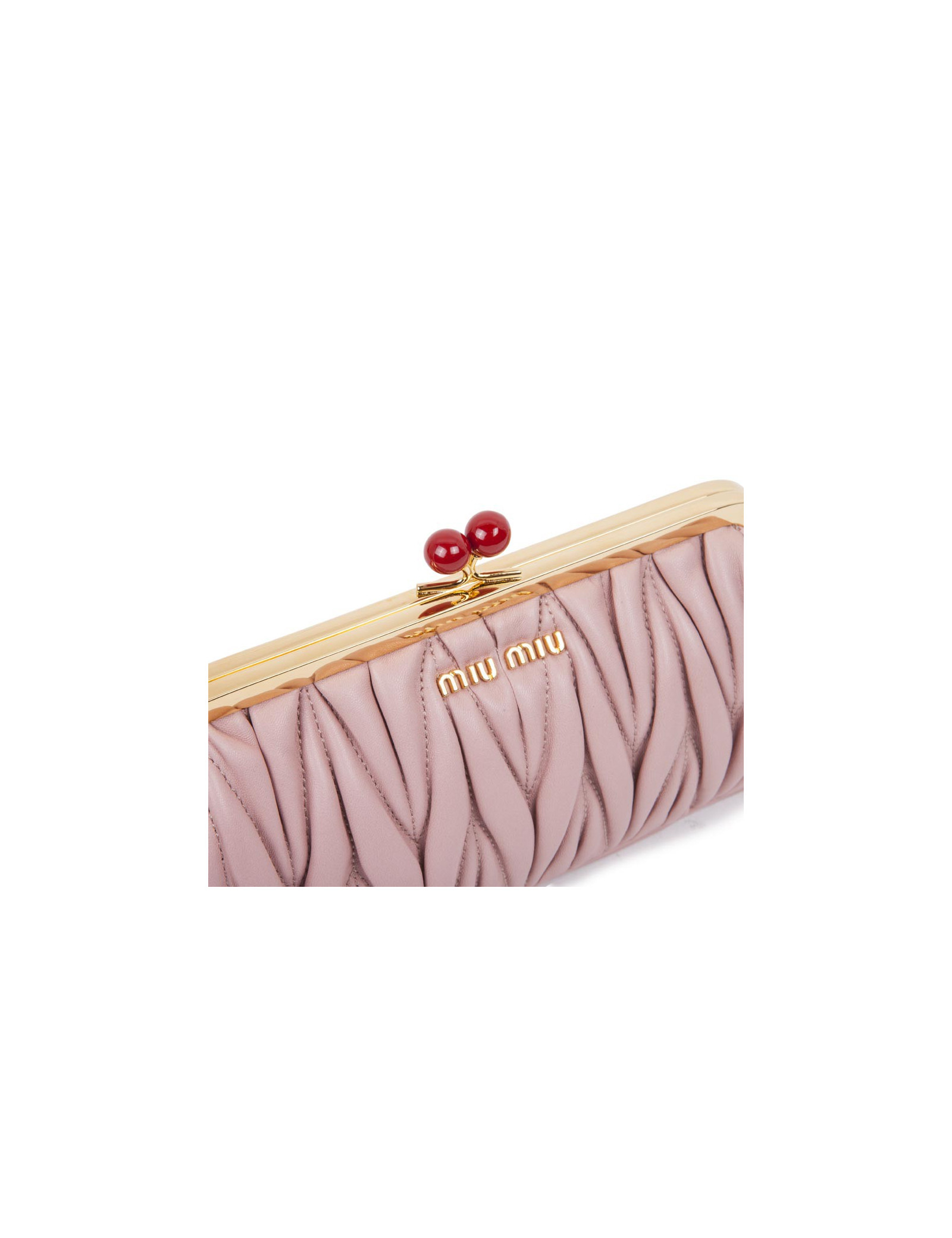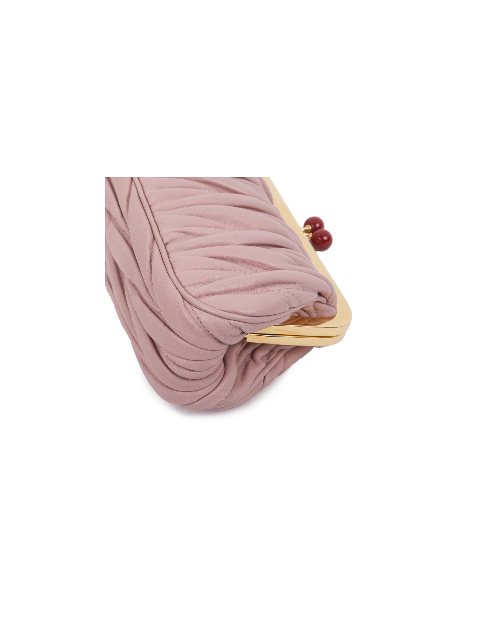Pochette clutch Miu Miu en cuir plissé rose poudré. Bijouterie dorée. Fermoir en forme de cerises. L'intérieur est en soie. Porté main. Etat neuf.