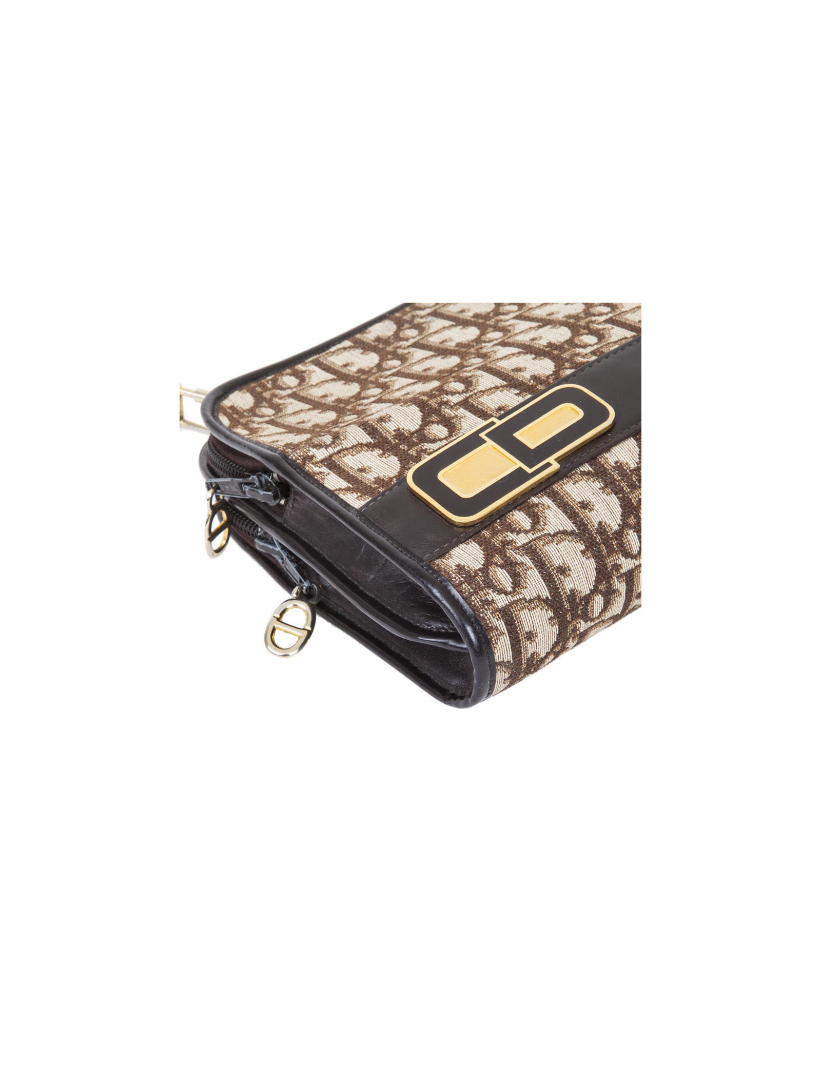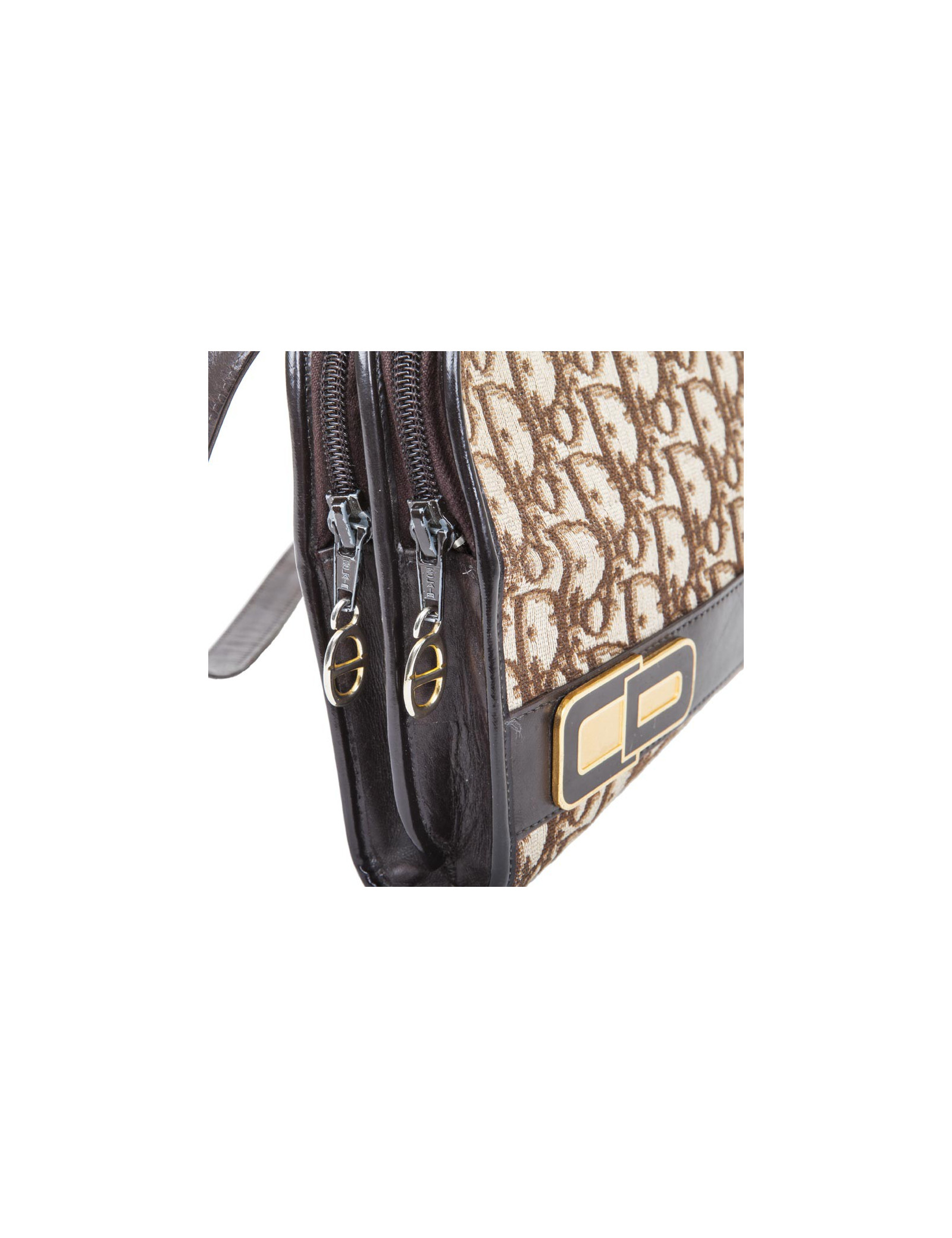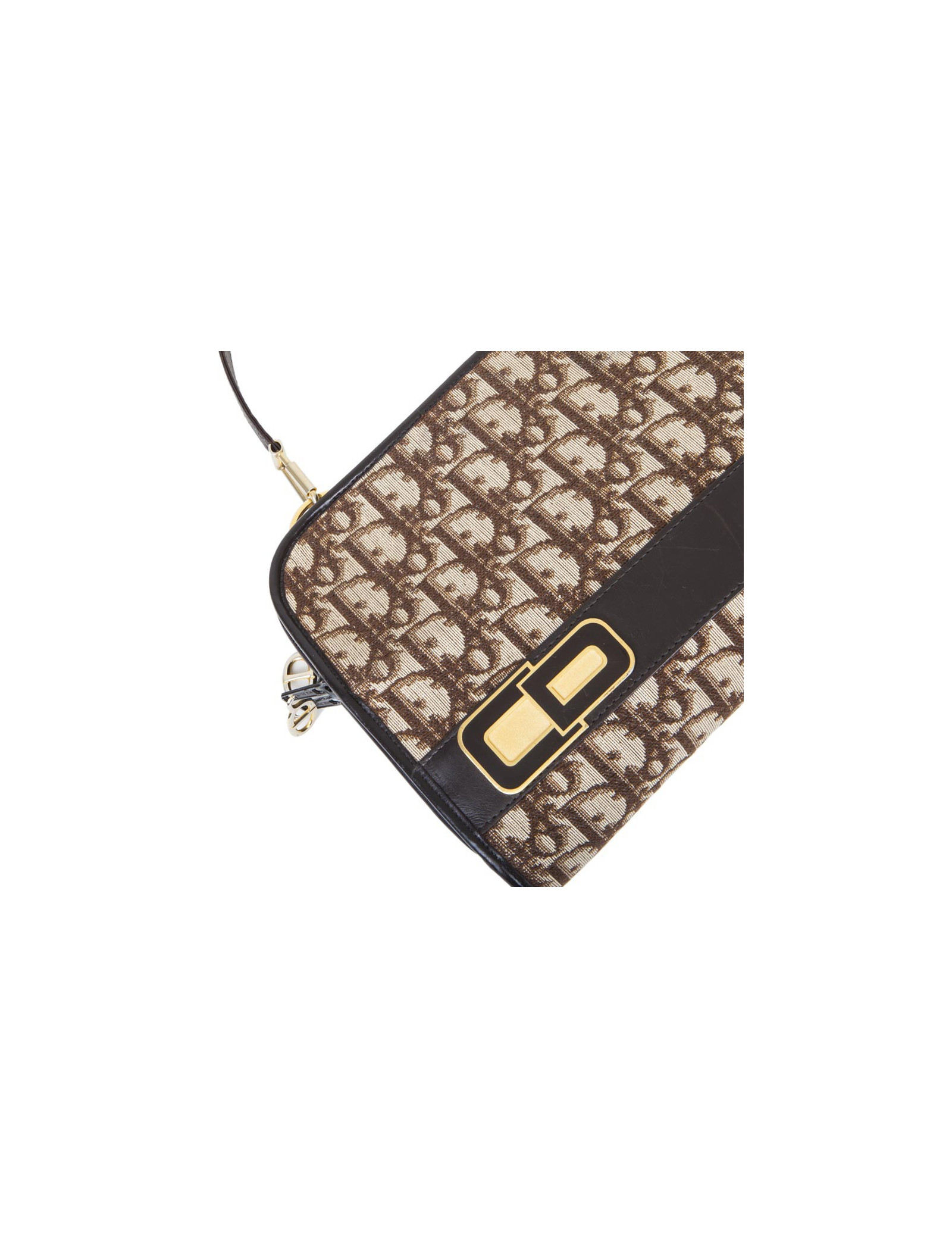 Vintage ! Sac Christian Dior en toile monogram marron et beige. Bijouterie dorée Patine des bijouteries. Fermeture zippée avec deux soufflets. Porté épaule avec une anse amovible pour un porté à la main façon pochette. Très bon état général.