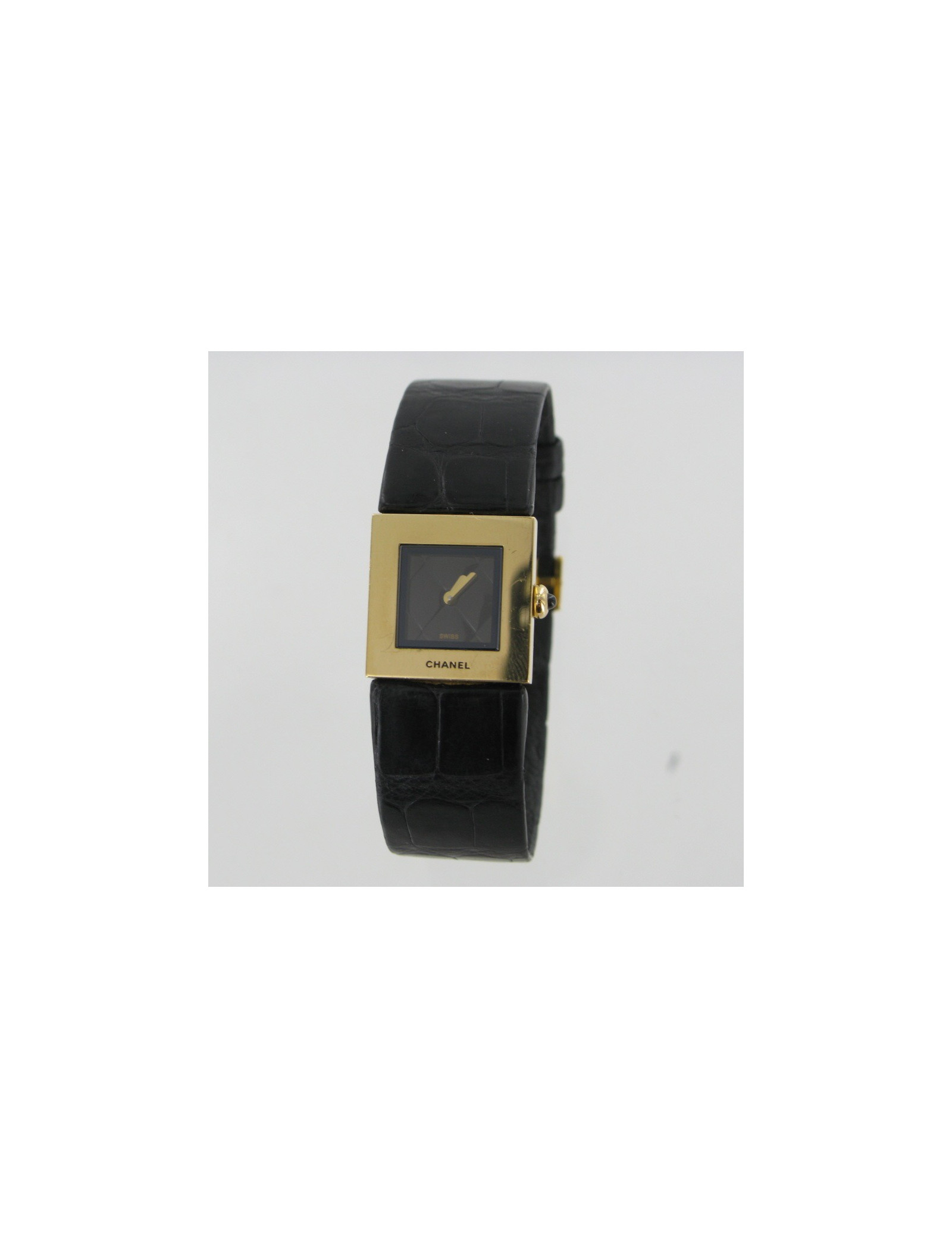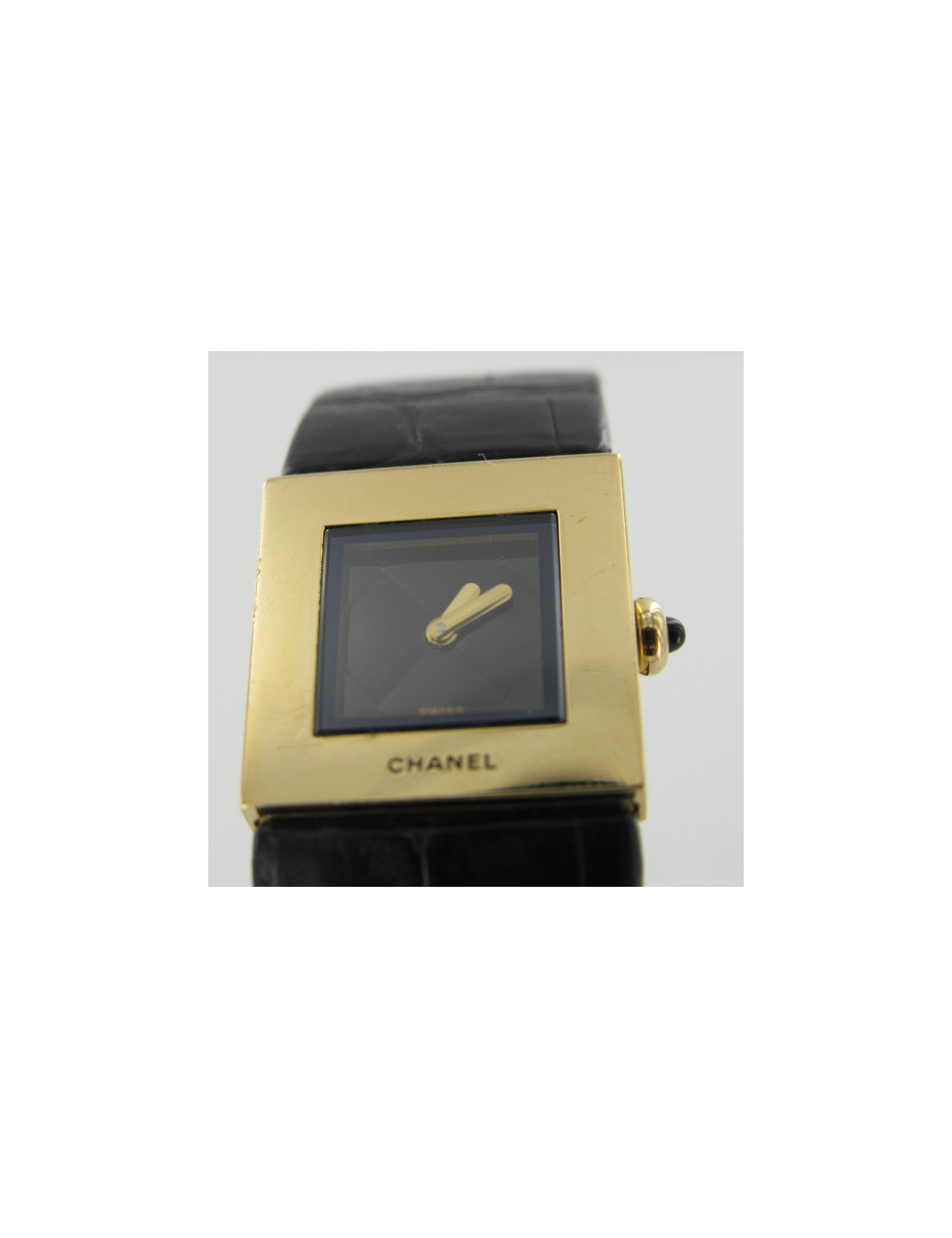 Beautiful watch "The Matelassee" in yellow gold 18K CHANEL. It has a quartz movement, saphire glass, a quilted black background. The bracelet is black alligator with a gold-plated folding clasp. There are scratches on the case.