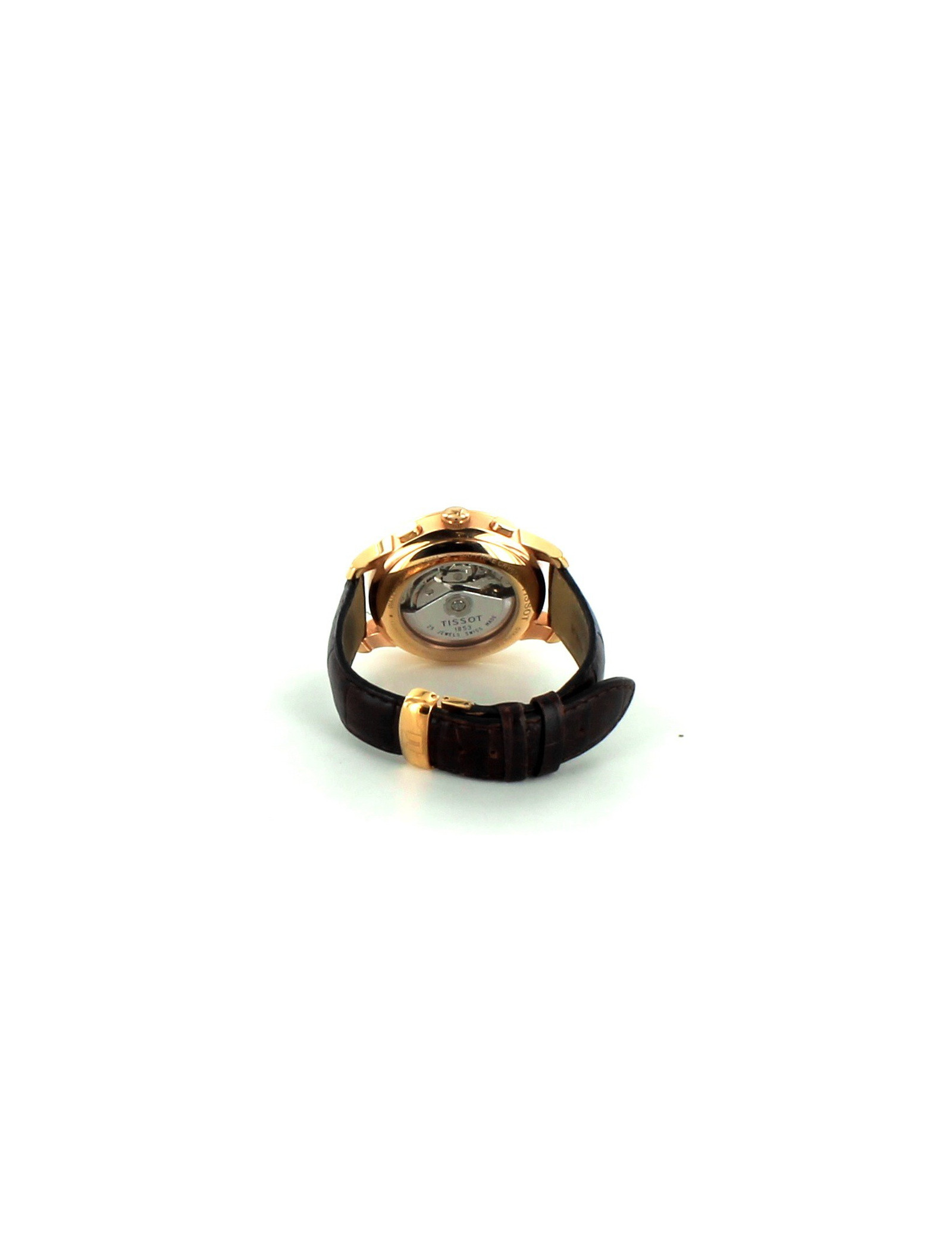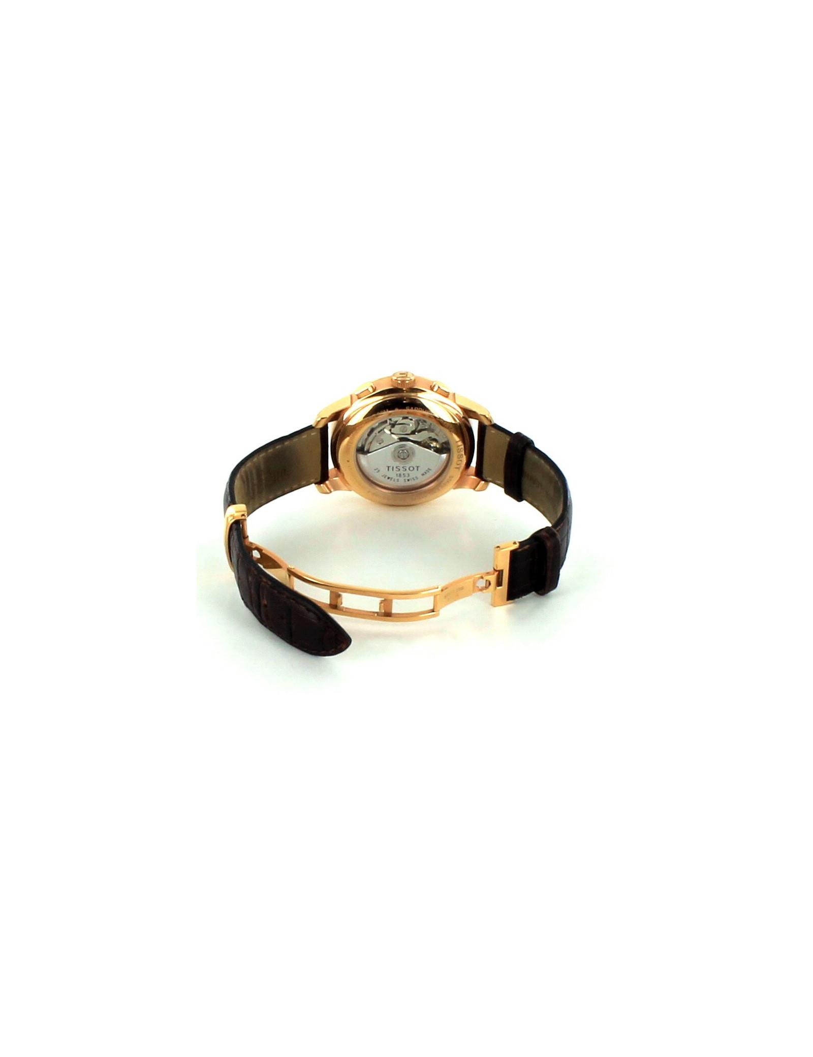 TISSOT watch "Le Locle", automatic, named in honor of the city of birth of the Tissot brand, in the Swiss Jura. Eis Swiss, it is equipped with an automatic movement ETA 7750 VALJOUX, of a scratch-resistant Sapphire Crystal, a box in 316L stainless steel with PVD coating gold pink and also a transparent background. This allows to see the movement of the watch. It comes with a leather strap in Brown way crocodile leather with folding clasp. Its water resistance: bar (30 m/1100 ft). Counter: 30 minutes and 12 hours hand Central 60 seconds - chronograph Dimensions: length 4.23 - width: 4.23 - thickness: 1.3 cm Retail price: EUR 1145