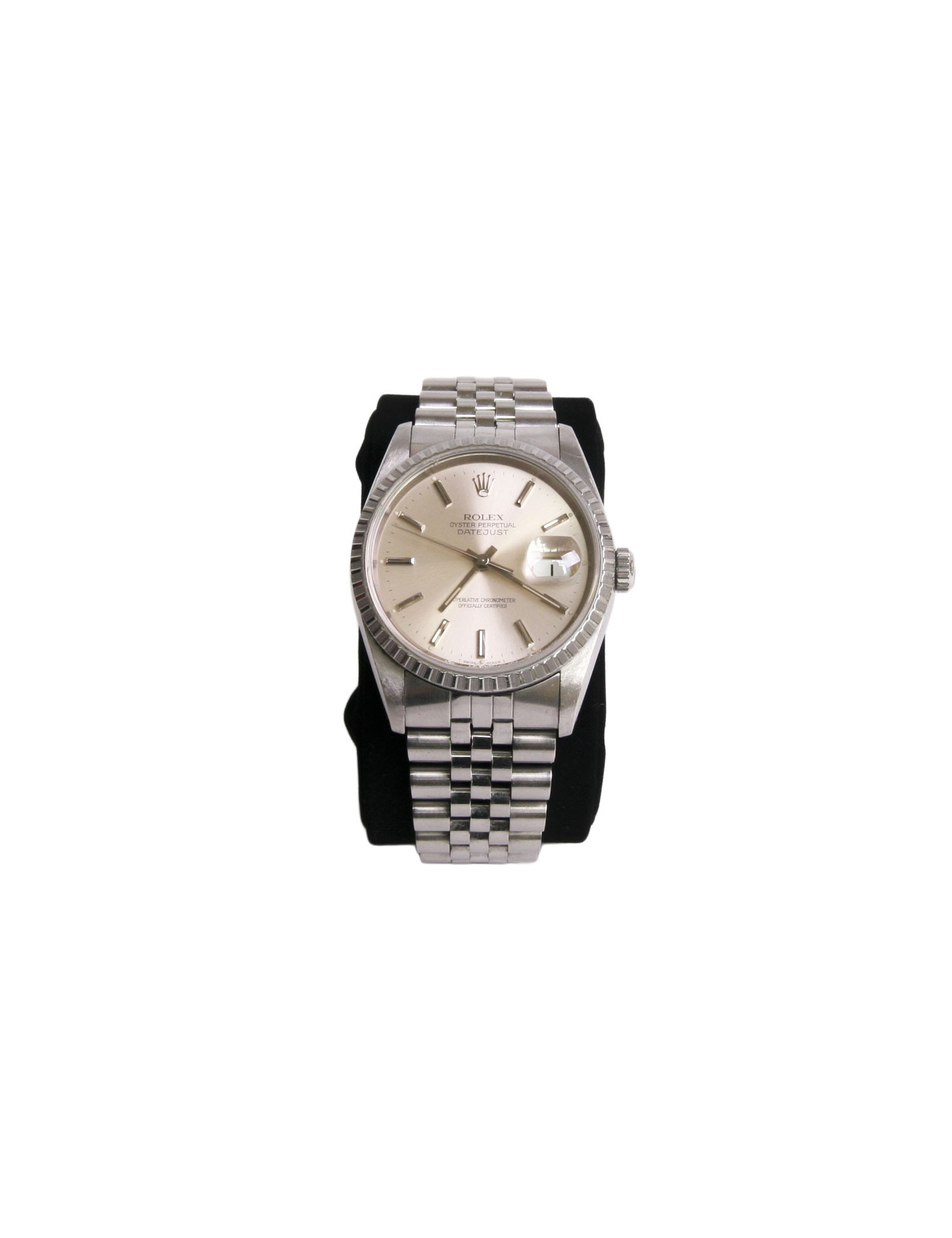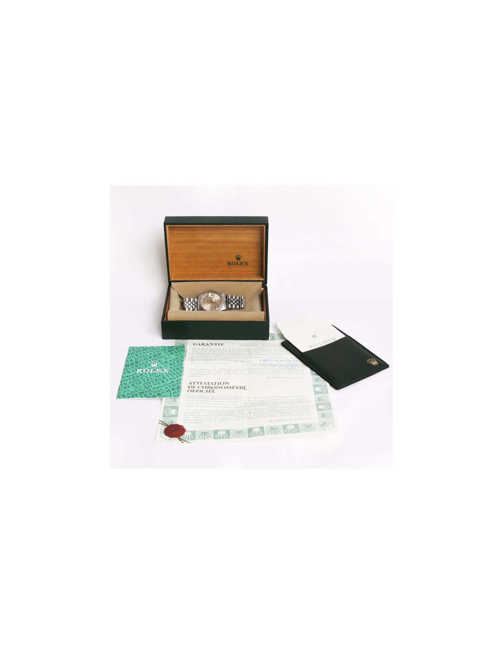 Rolex "Oyster perpetual datejust" watch. Deploying the loop bracelet is in steel and measures 16 cm, official chronometer certified self-winding mechanical movement and the glass is made of Sapphire Cyclops. Bezel: fluted, diameter 36 mm, round shaped case is steel, the bottom and the Crown are screwed, watertight, it is possible to be worn by a man or a woman. < span style = "do -"family:Arial; do - size:12px; do-style: normal;" >It is waterproof to the water: 100 metres. functions: hours, minutes, Center seconds. Guarantee certificate: purchase September 1991. (for the record price of the nine 5500 euros.)