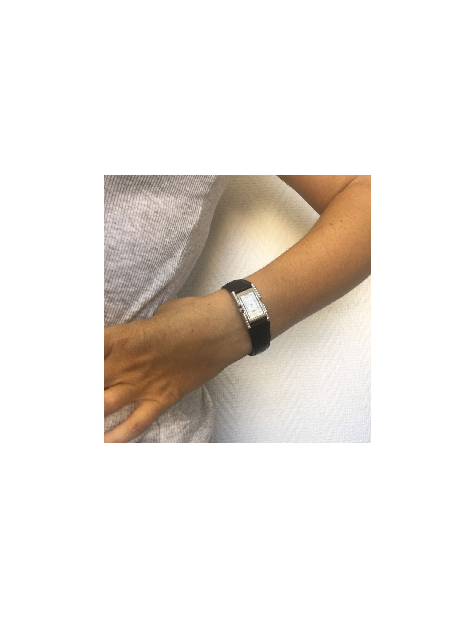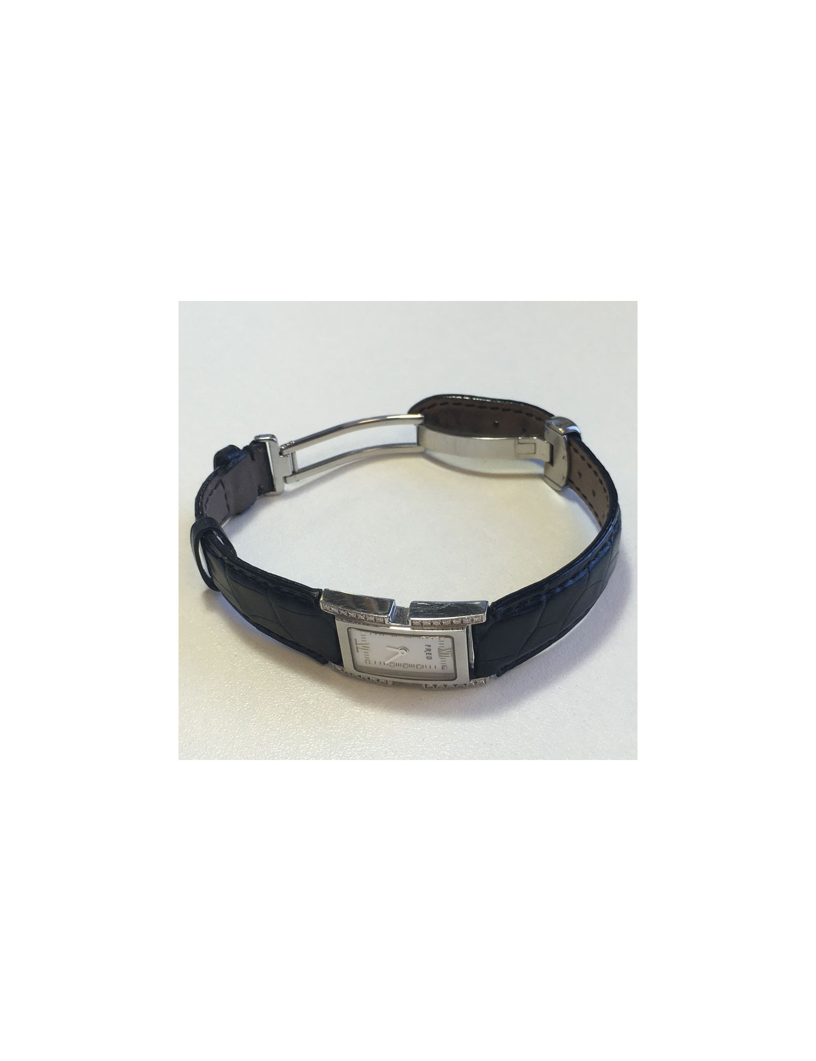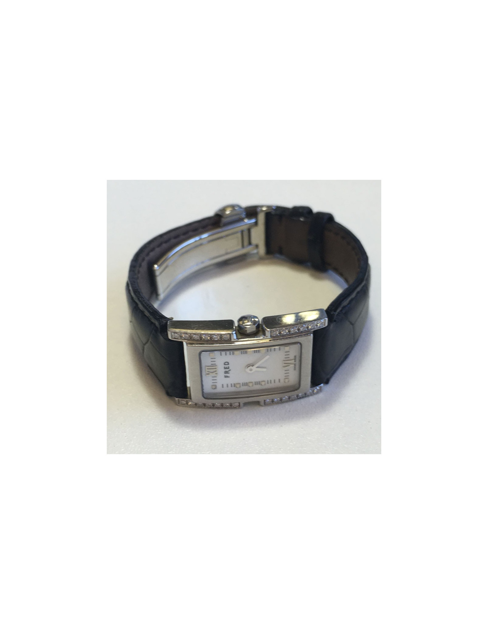 Watch FRED model 36, in steel, White Dial, Roman numbers, bezel set with diamonds, black alligator with steel folding clasp strap. Quartz movement.