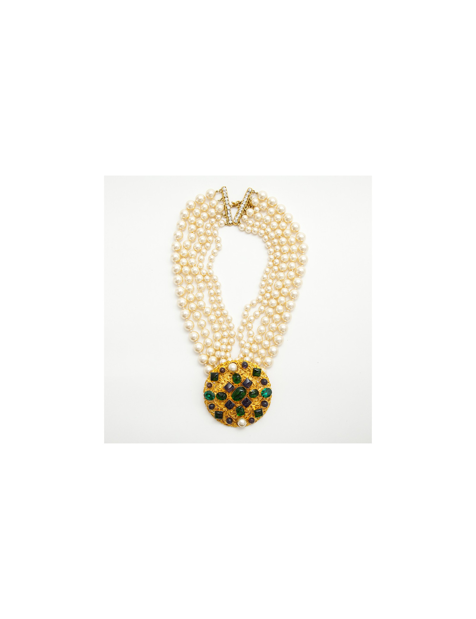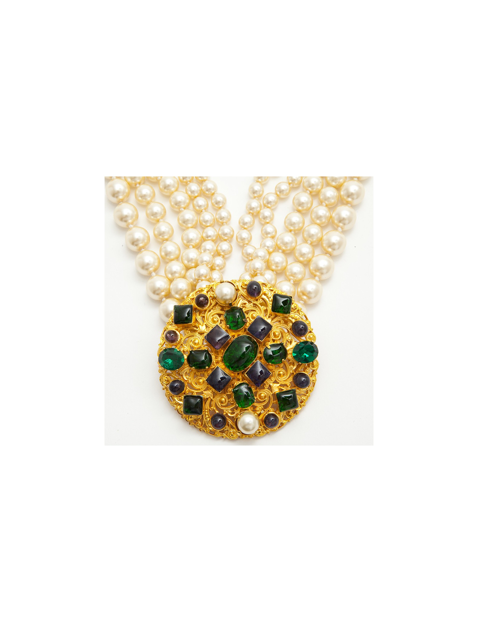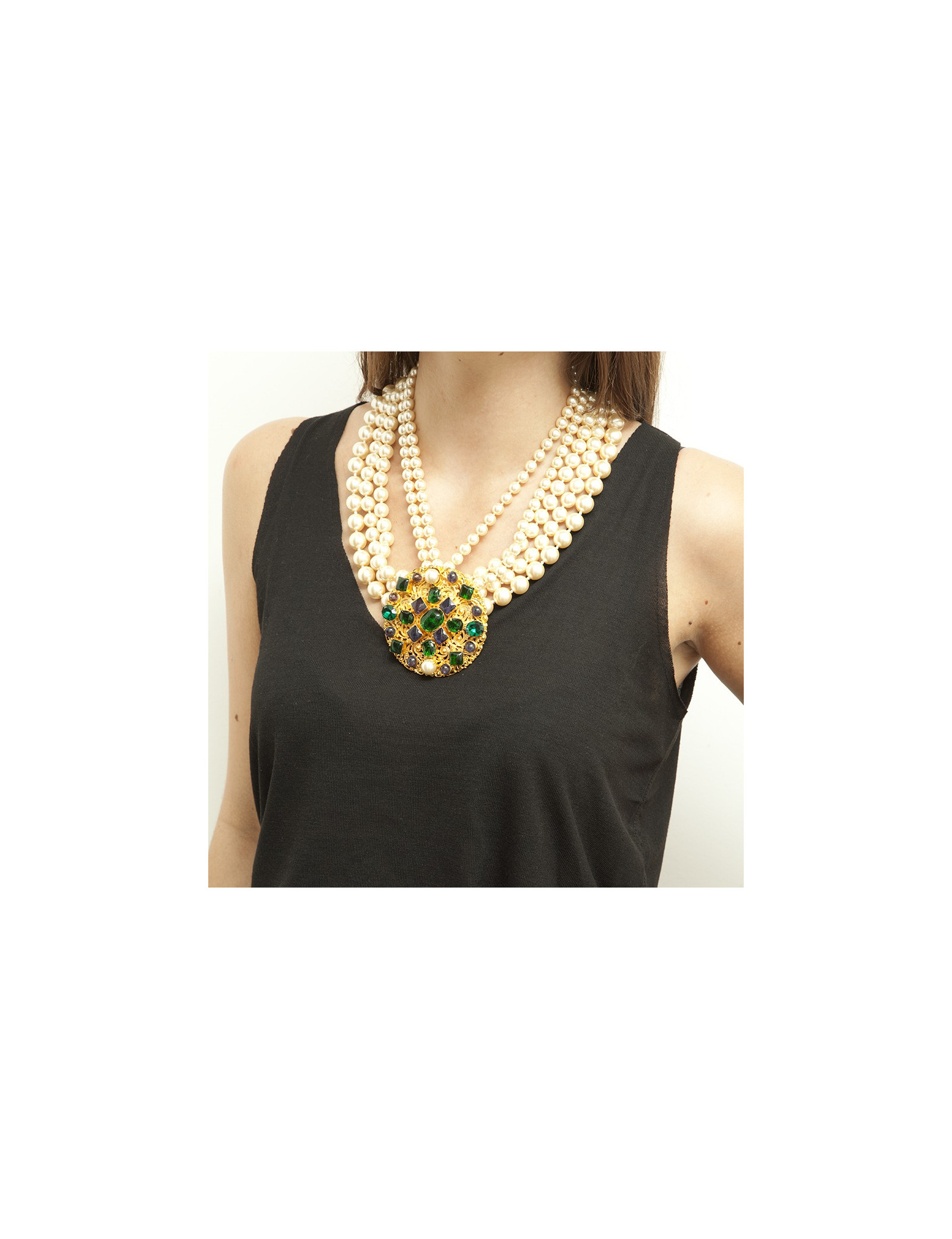 Couture !! Marguerite de Valois necklace 5 rows, in pearl beads, embellished with an imposing medallion in filigree set with cabochons in molten paste color : emerald and amethyst.